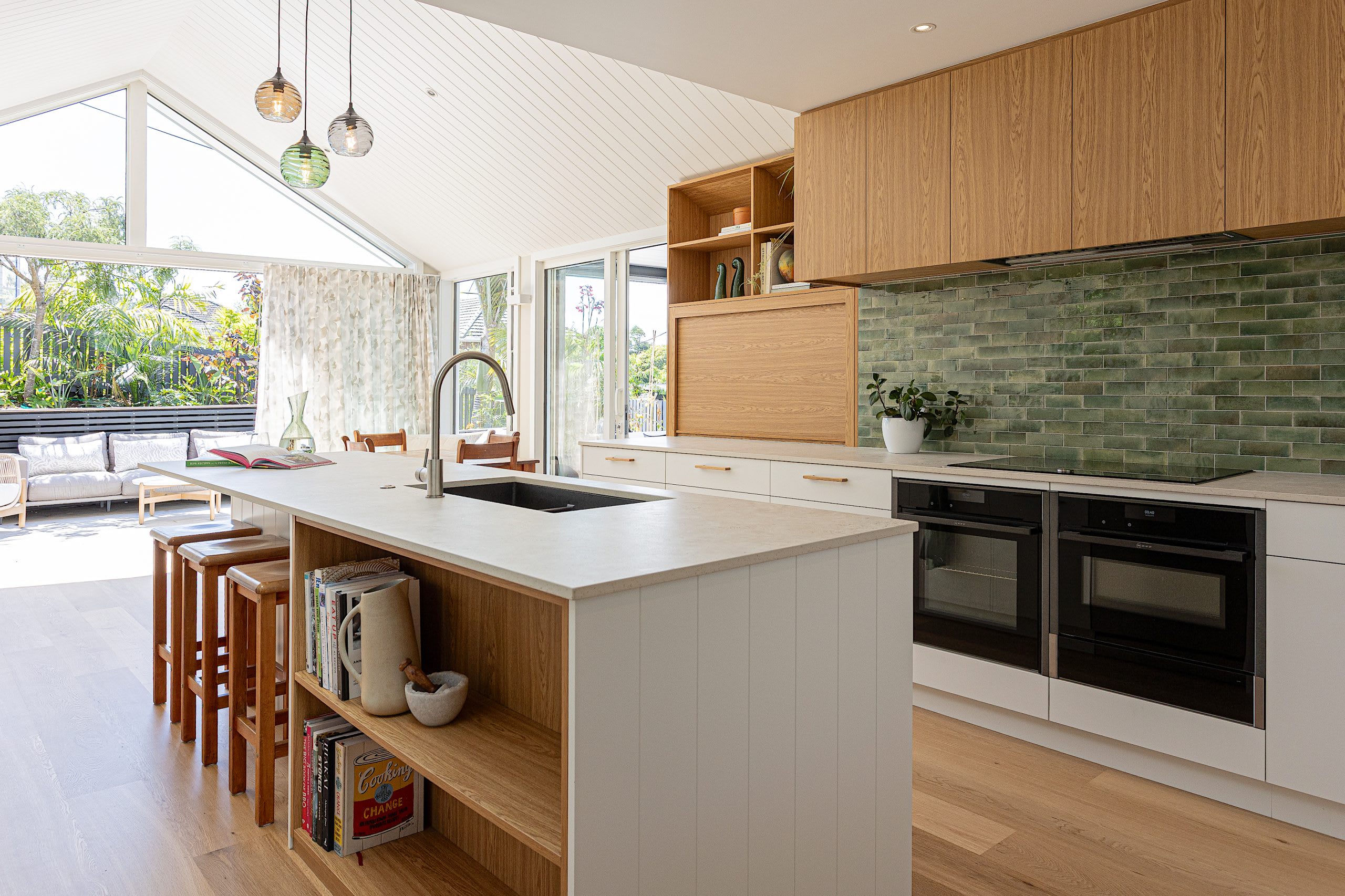 Splashback materials – Quartzite natural Stone; green subway tiles