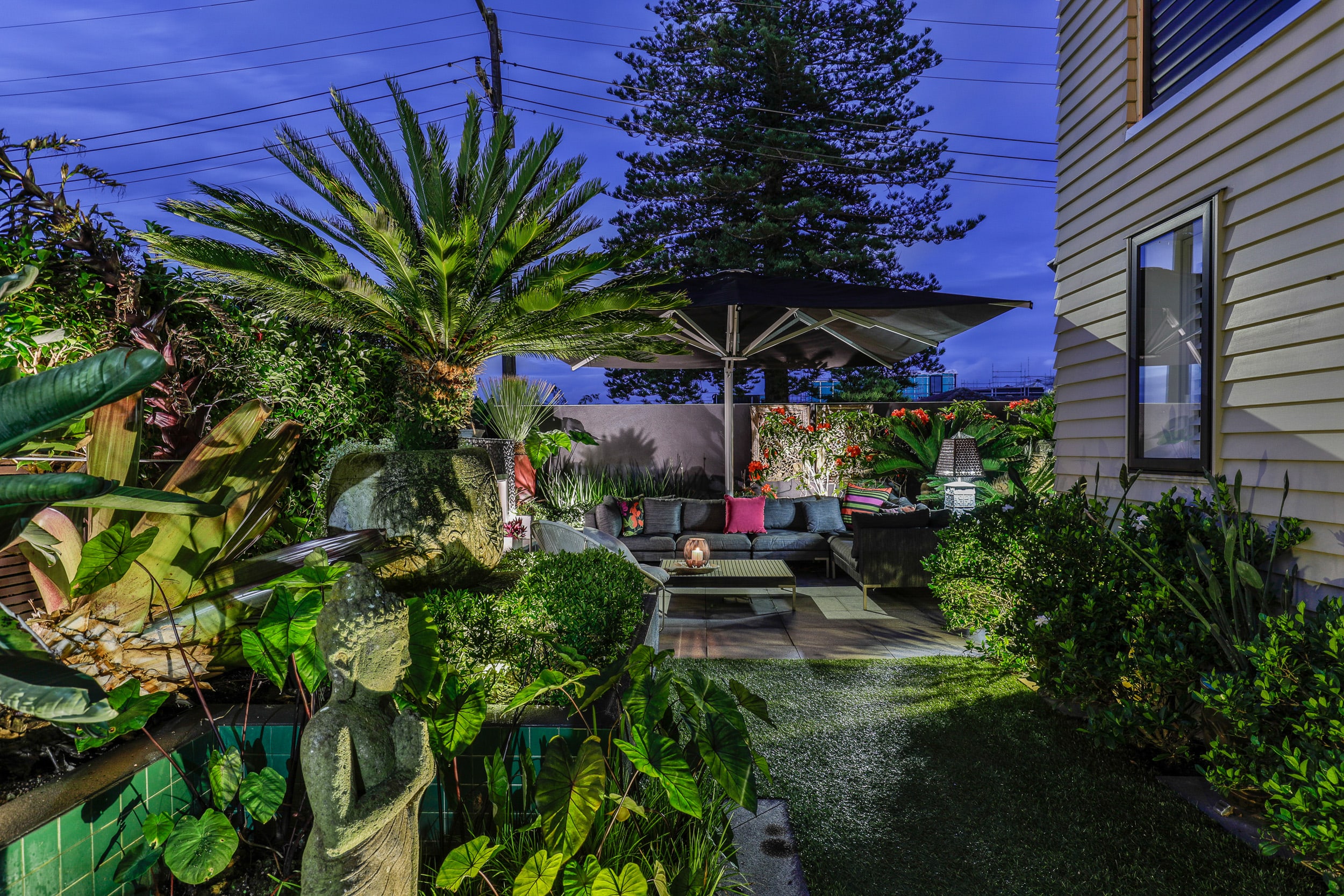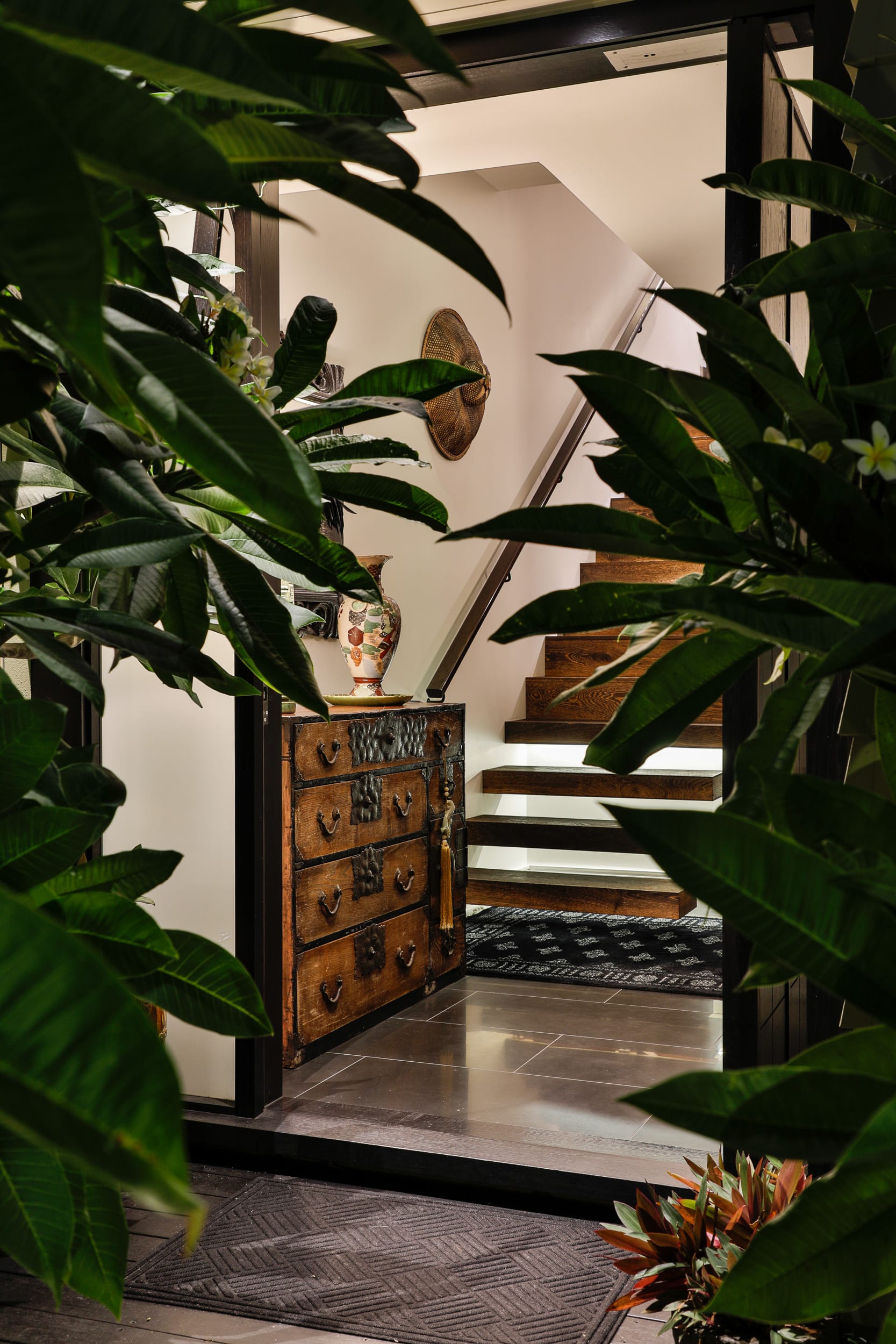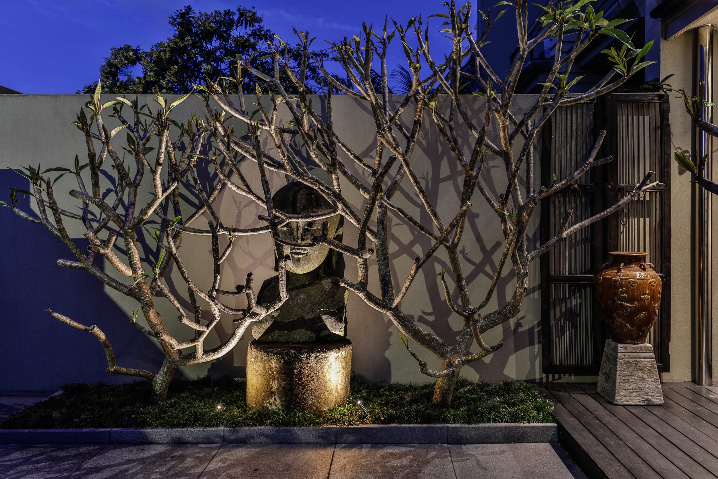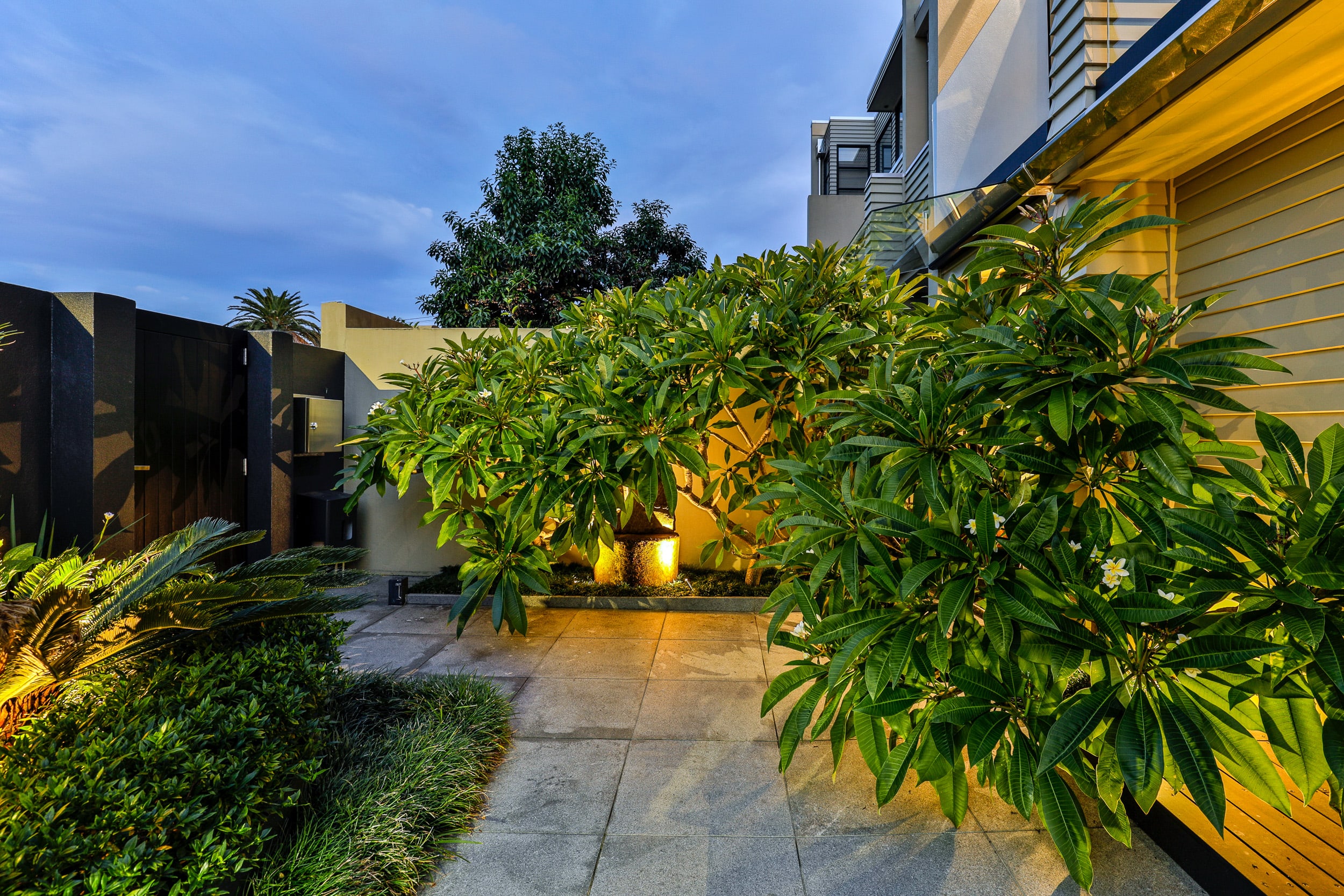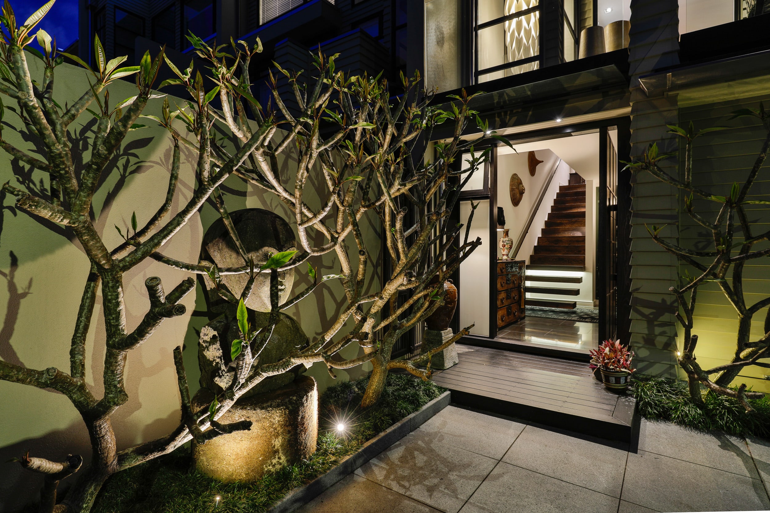On entry, family and visitors are now greeted by a new garden formed on the common boundary – this incorporates a Buddha positioned between two fragrant Frangipani Trees, guiding visitors up to the front door.