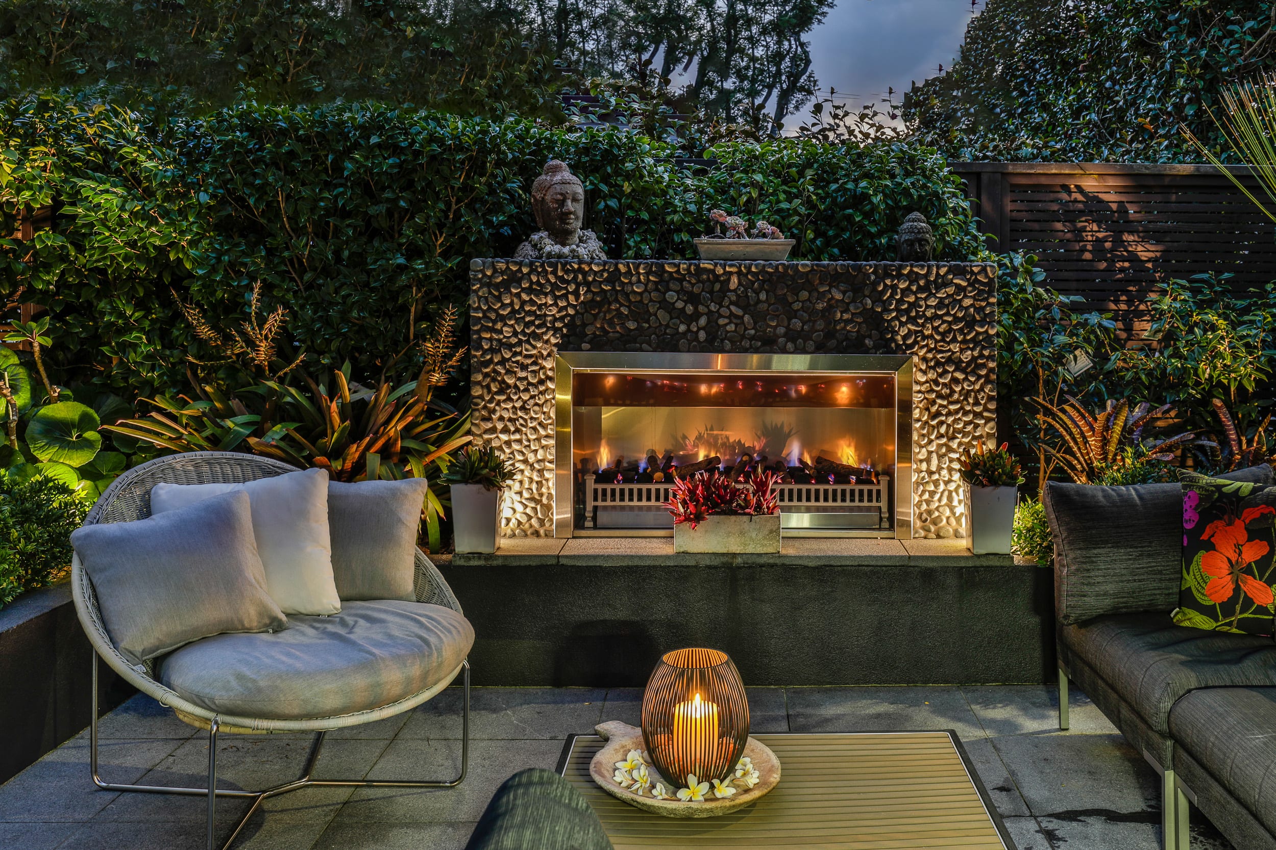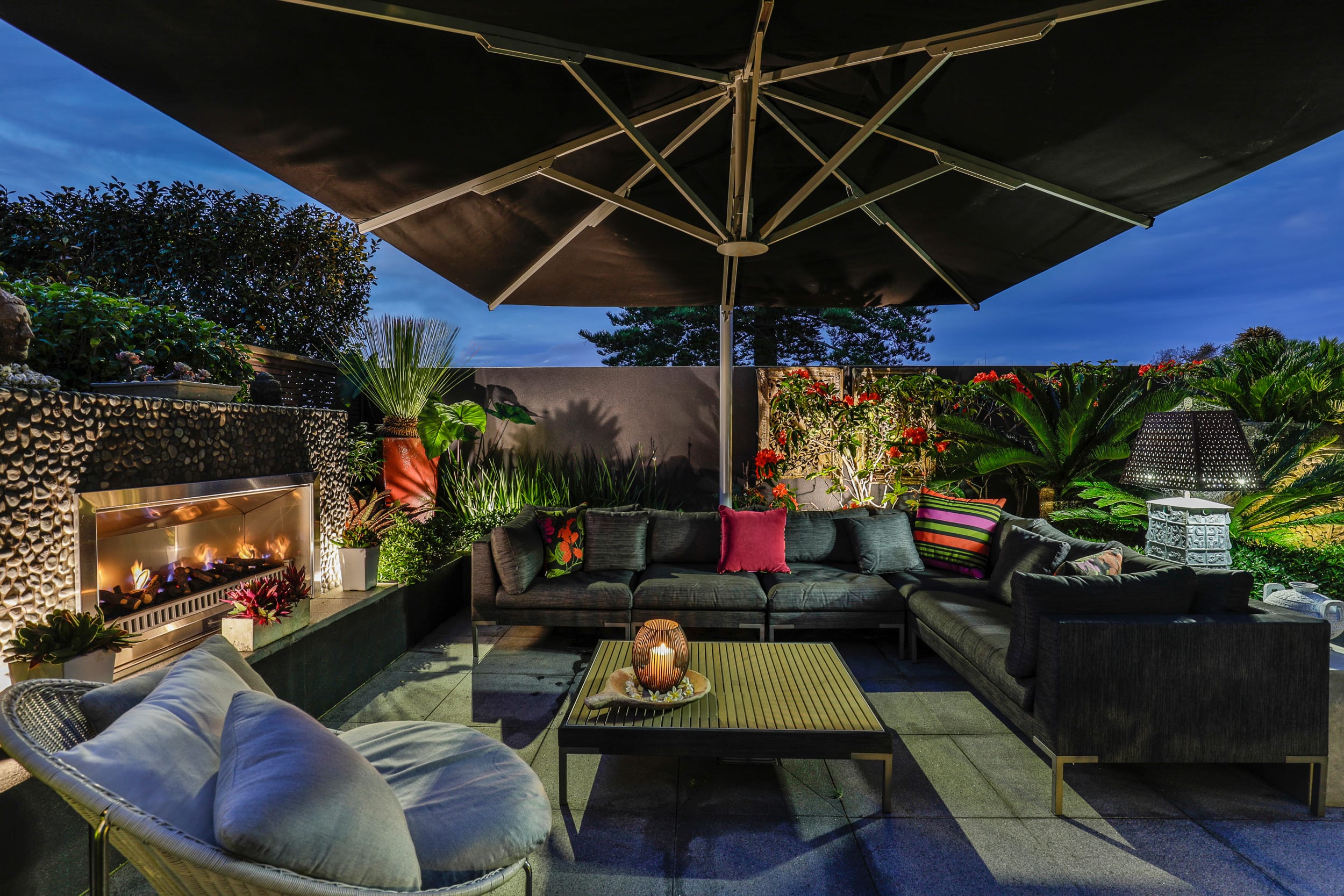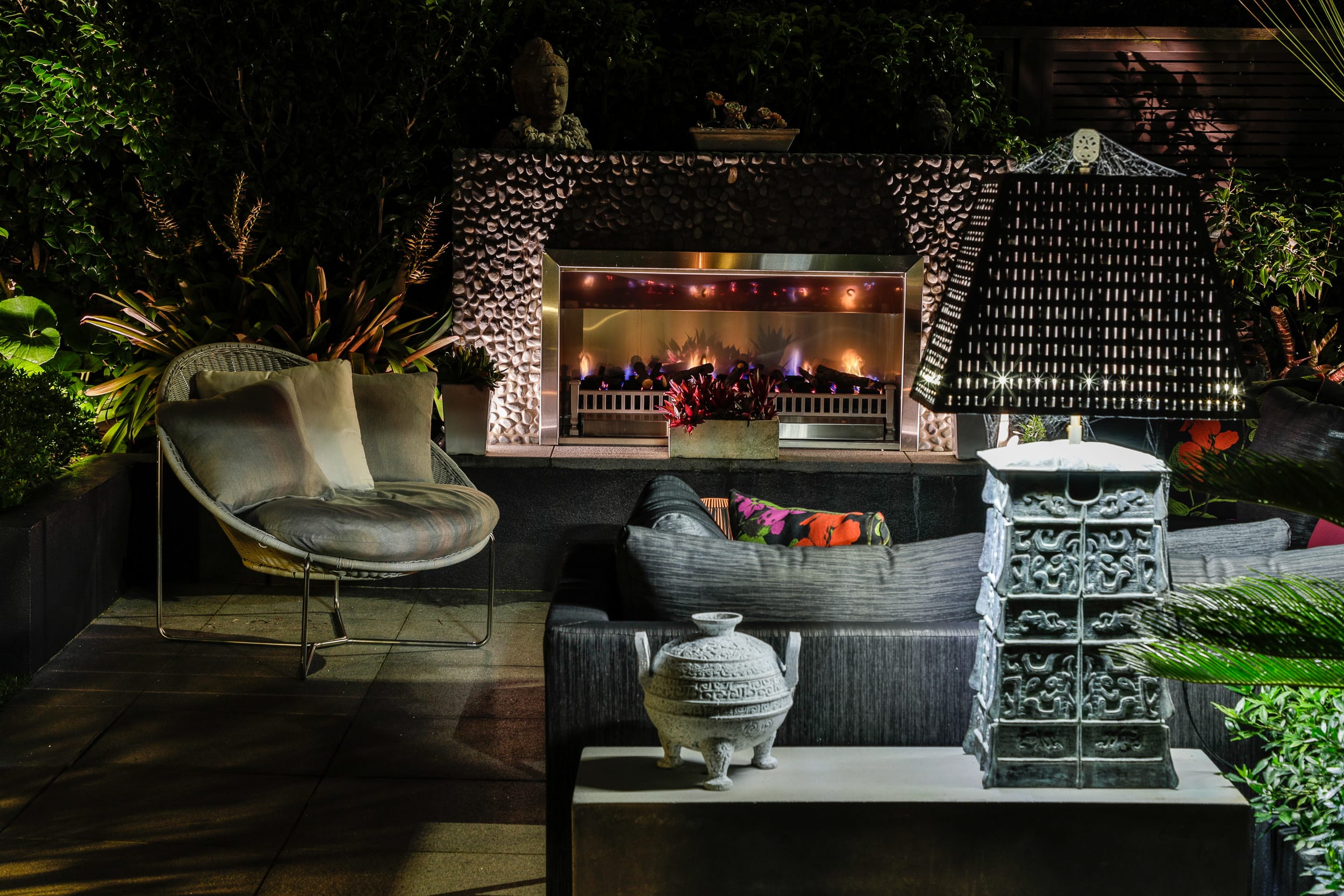 A new seating area was to include a gas fireplace and a cantilevered umbrella, all surrounded by a Balinese-inspired Zen garden.