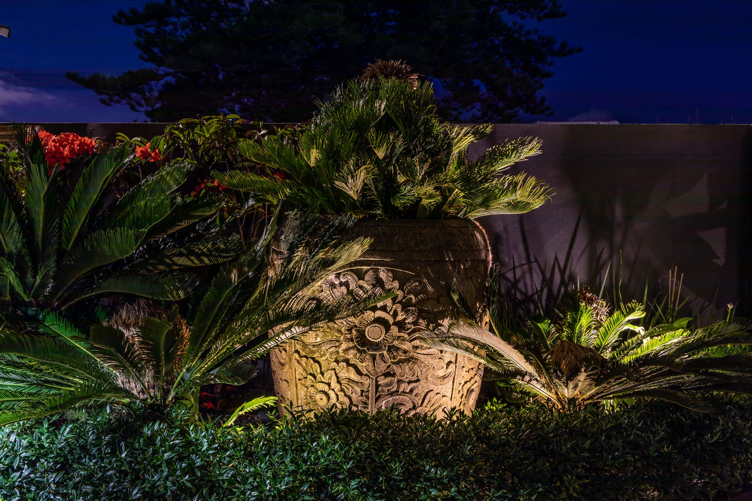 Feature plants and sculptures are highlighted with uplighting – such as each side of the fireplace and washing up the river pebble front face – while general spot lights are positioned throughout the garden and can be moved around once plants begin to mature.