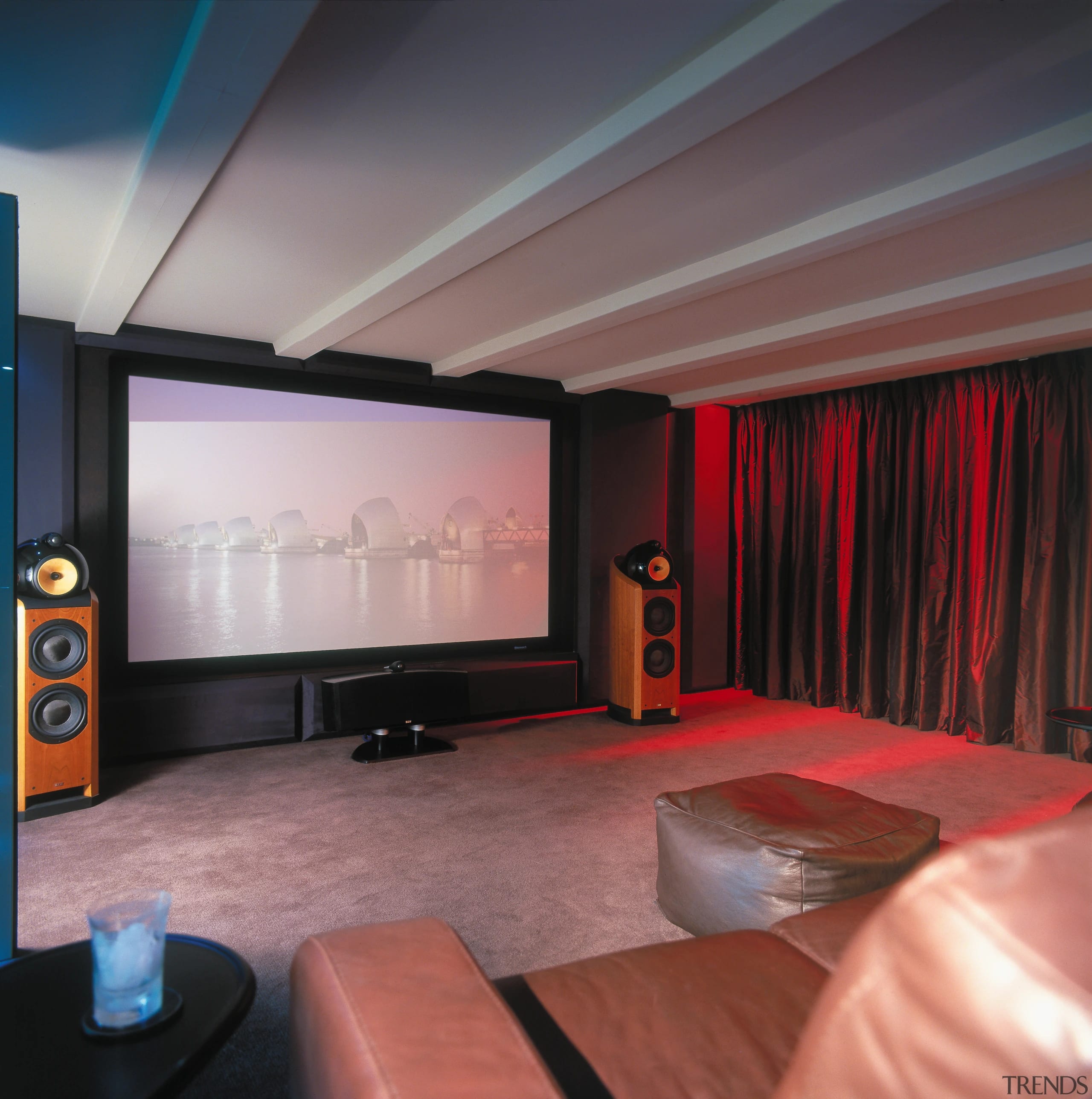 The floor-to-ceiling drapes also serve the purpose of concealing the home theatre’s dedicated air conditioning unit. The fabric is one of half a dozen different surface materials, along with carpet, concrete, Gib, leather and acoustic panelling, that give the room its effective acoustic dynamic.