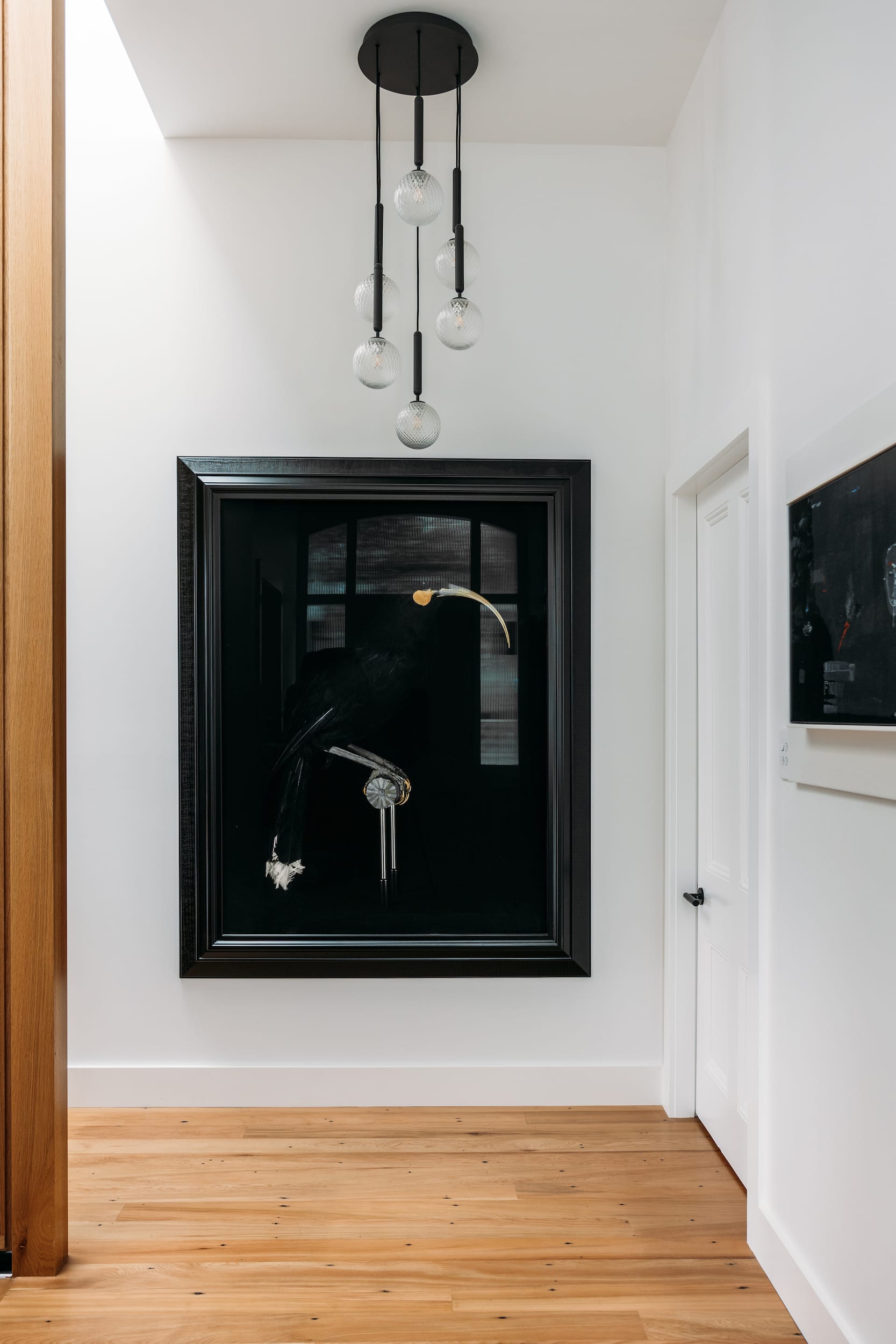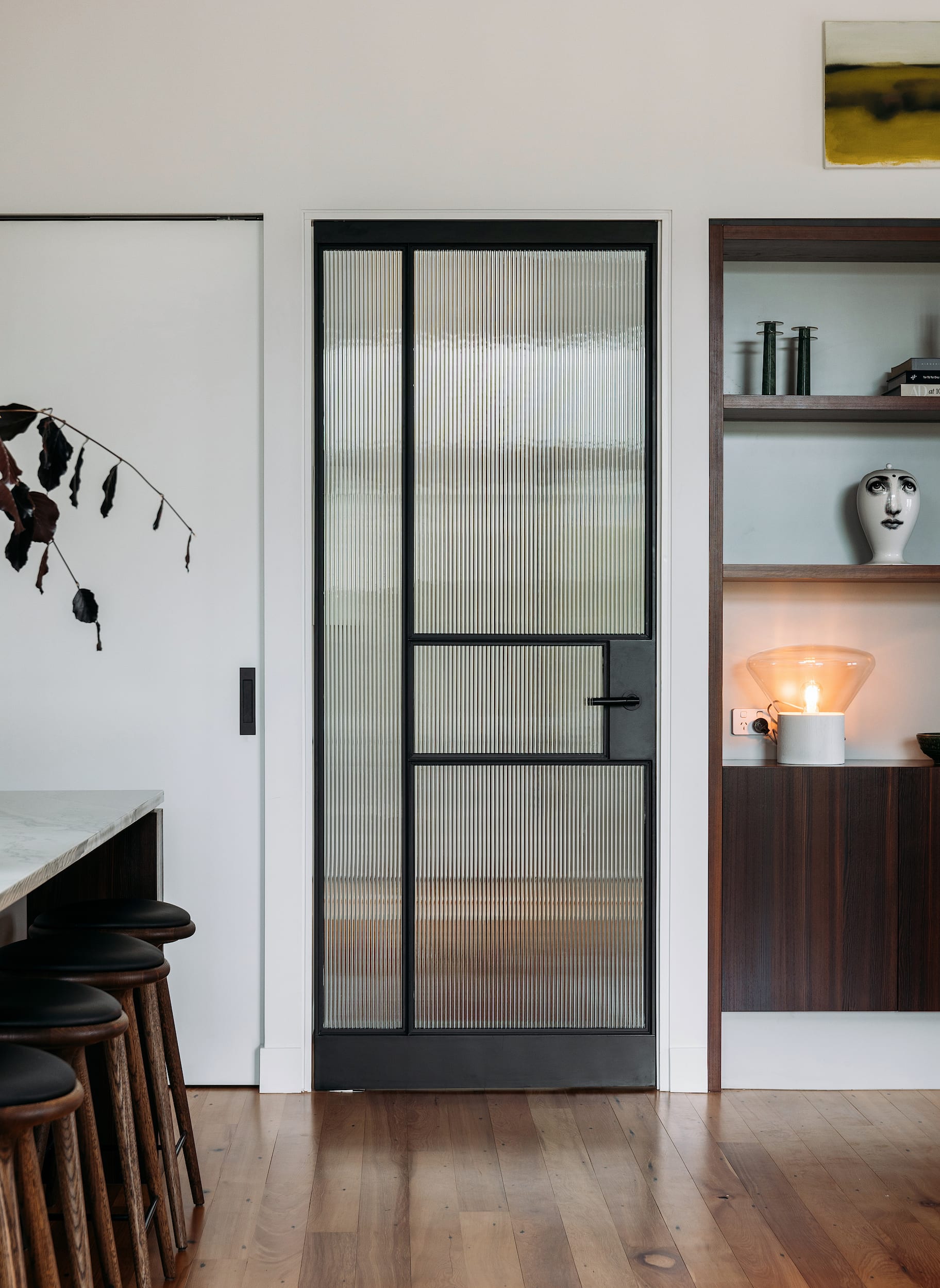 Inside, a refined palette of rich timber veneers, veined stone, fluted glass, and industrial accents creates a gallery-like backdrop for the owners’ extensive contemporary art collection.