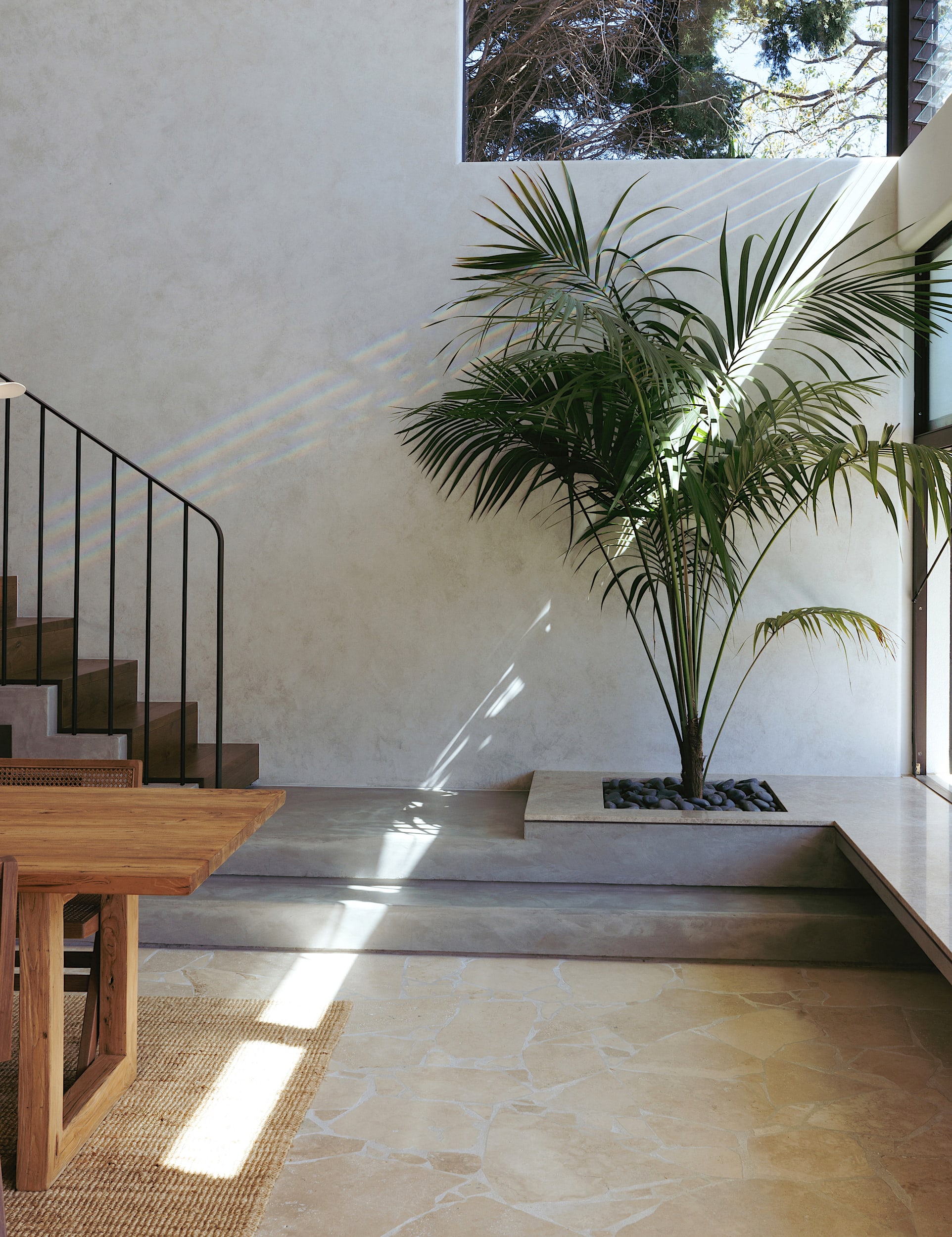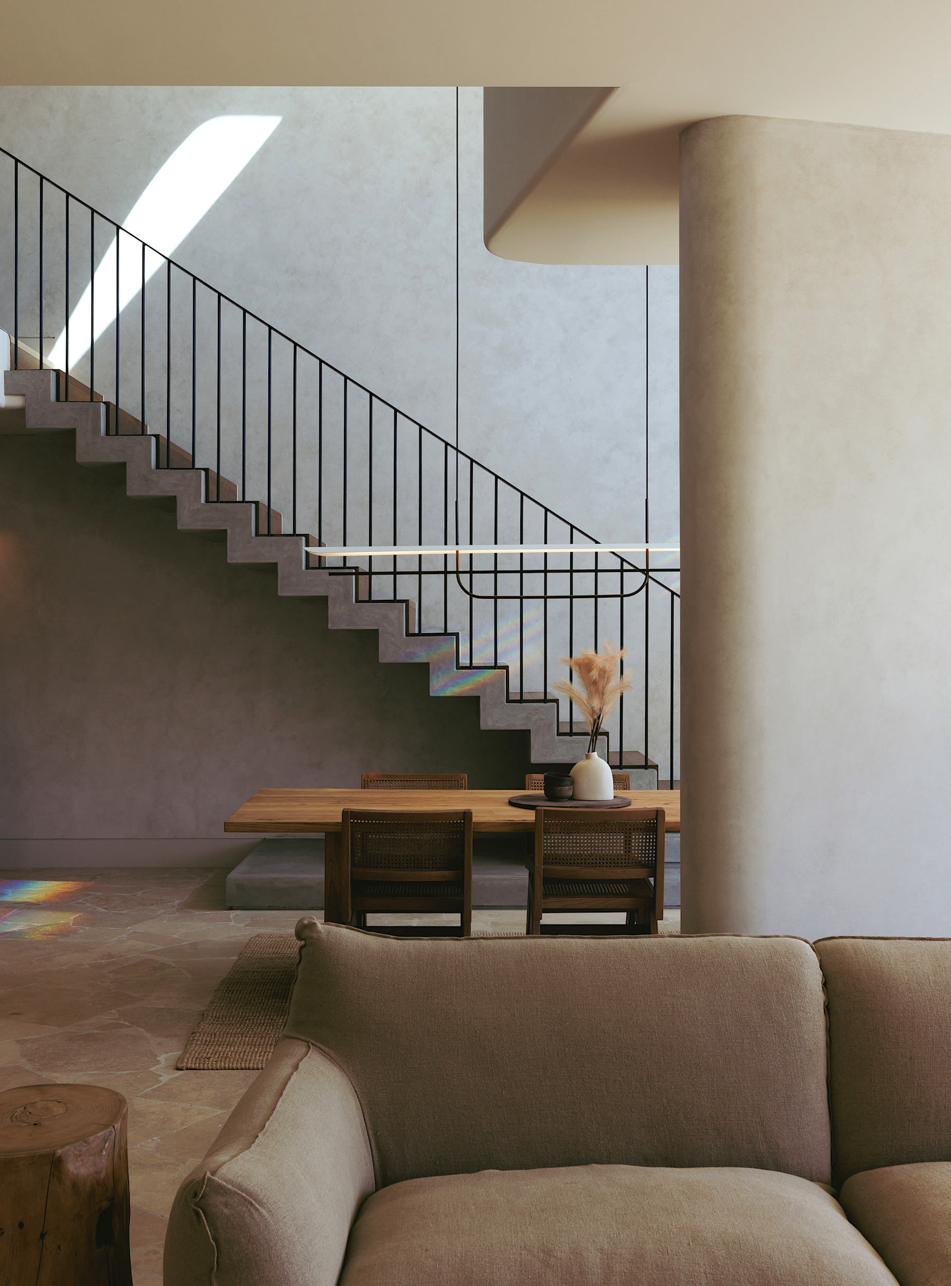 The stair, a sculptural moment within the void, hovers above the floor below; the seemingly missing anchor point in contrast to the home’s grounded solidity.