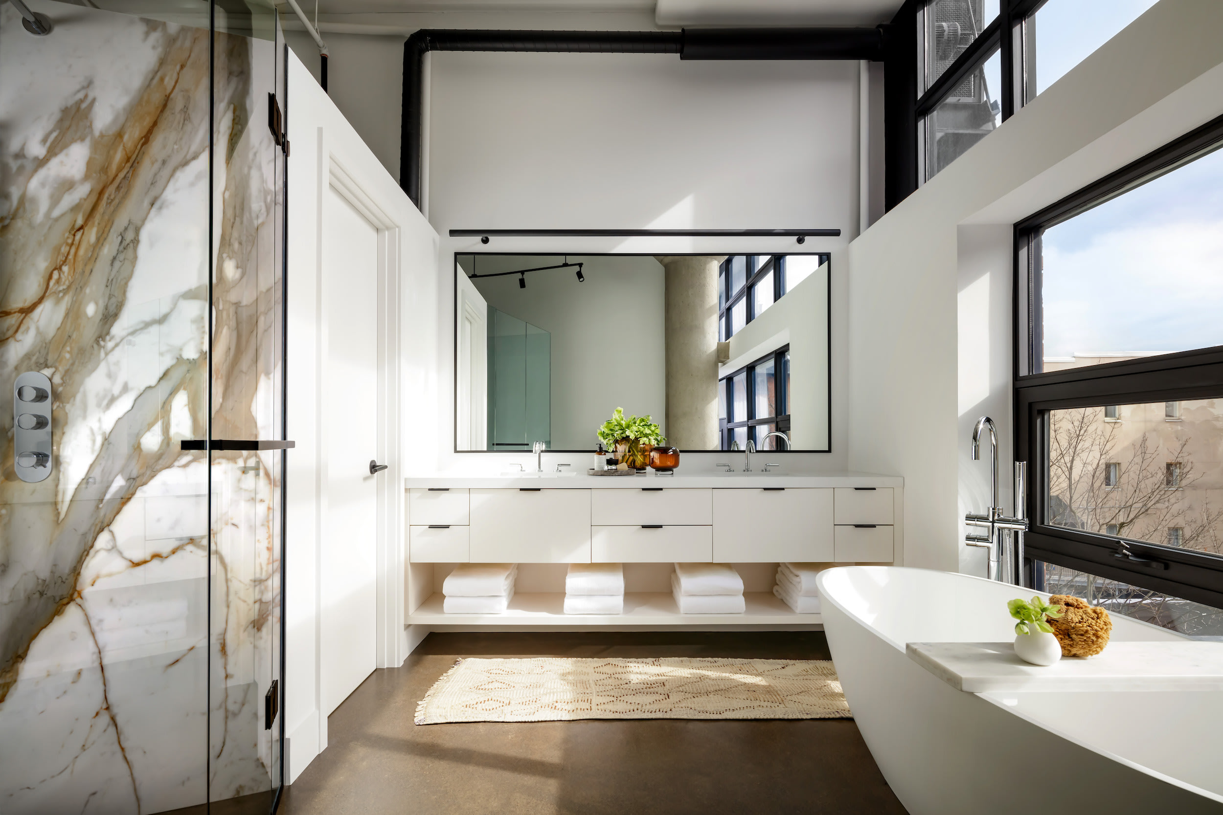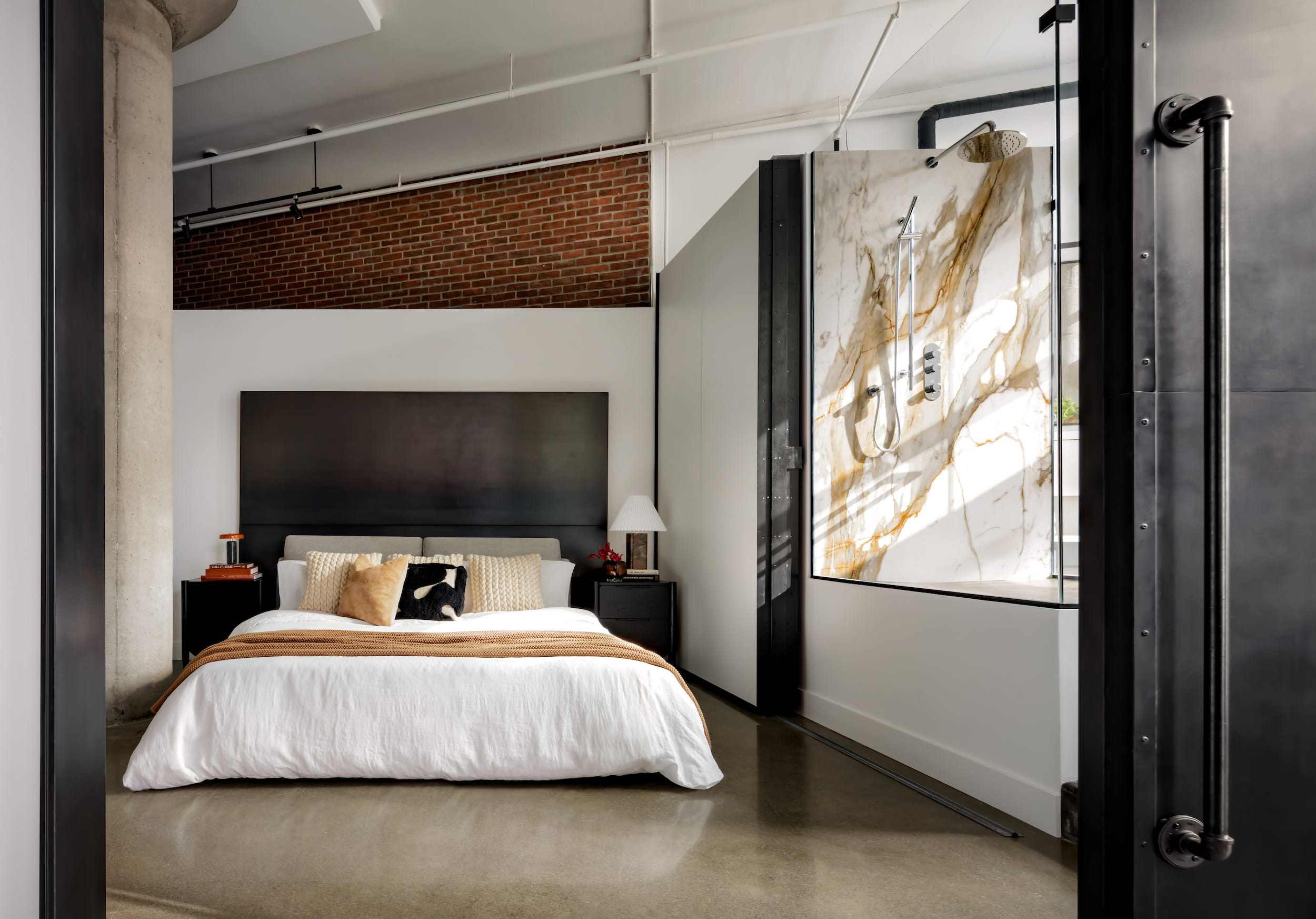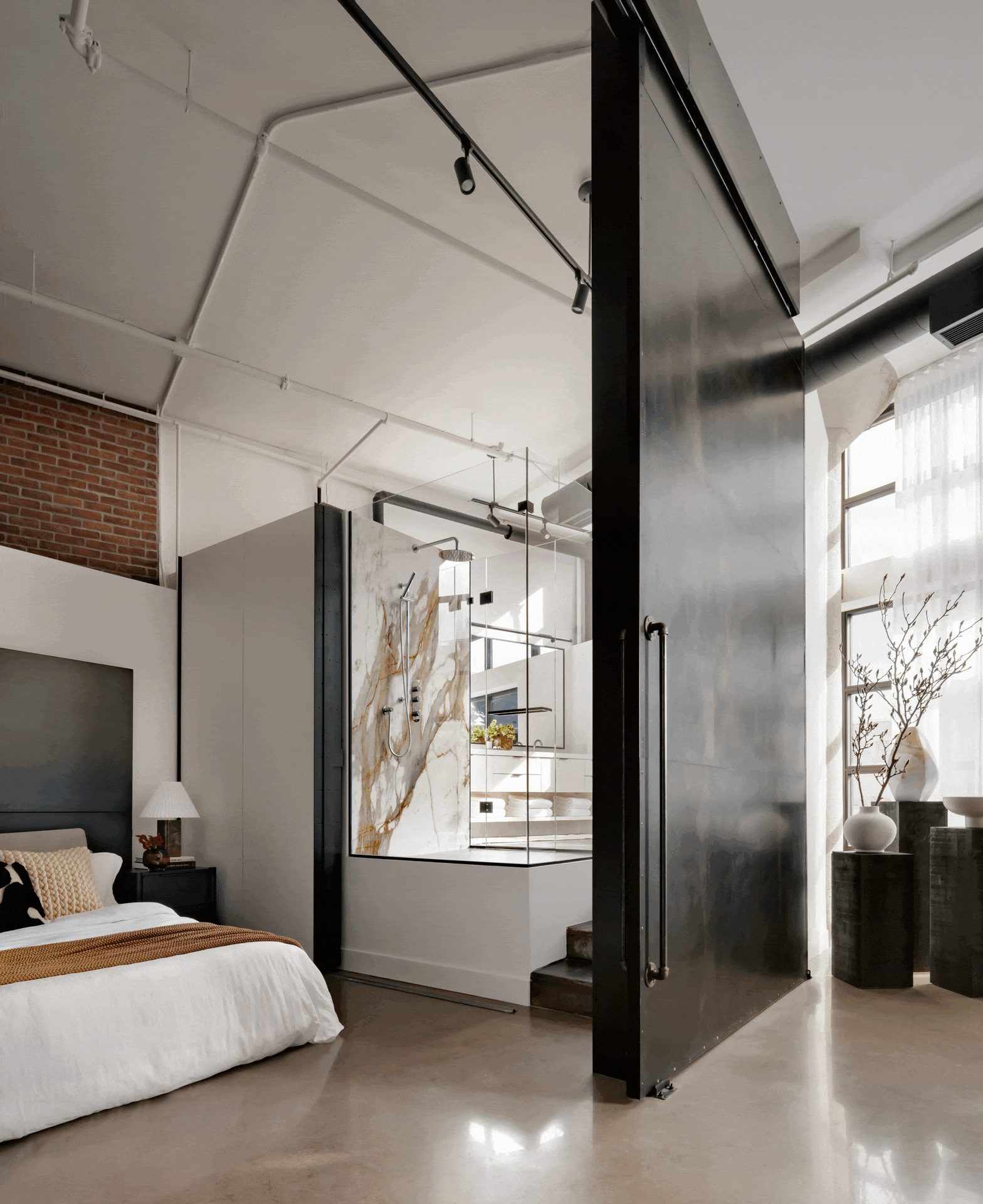 A glass cube shower flanks the bedroom and allows light to enter into the sleeping area, with a floating moveable wall also put into place for added privacy.