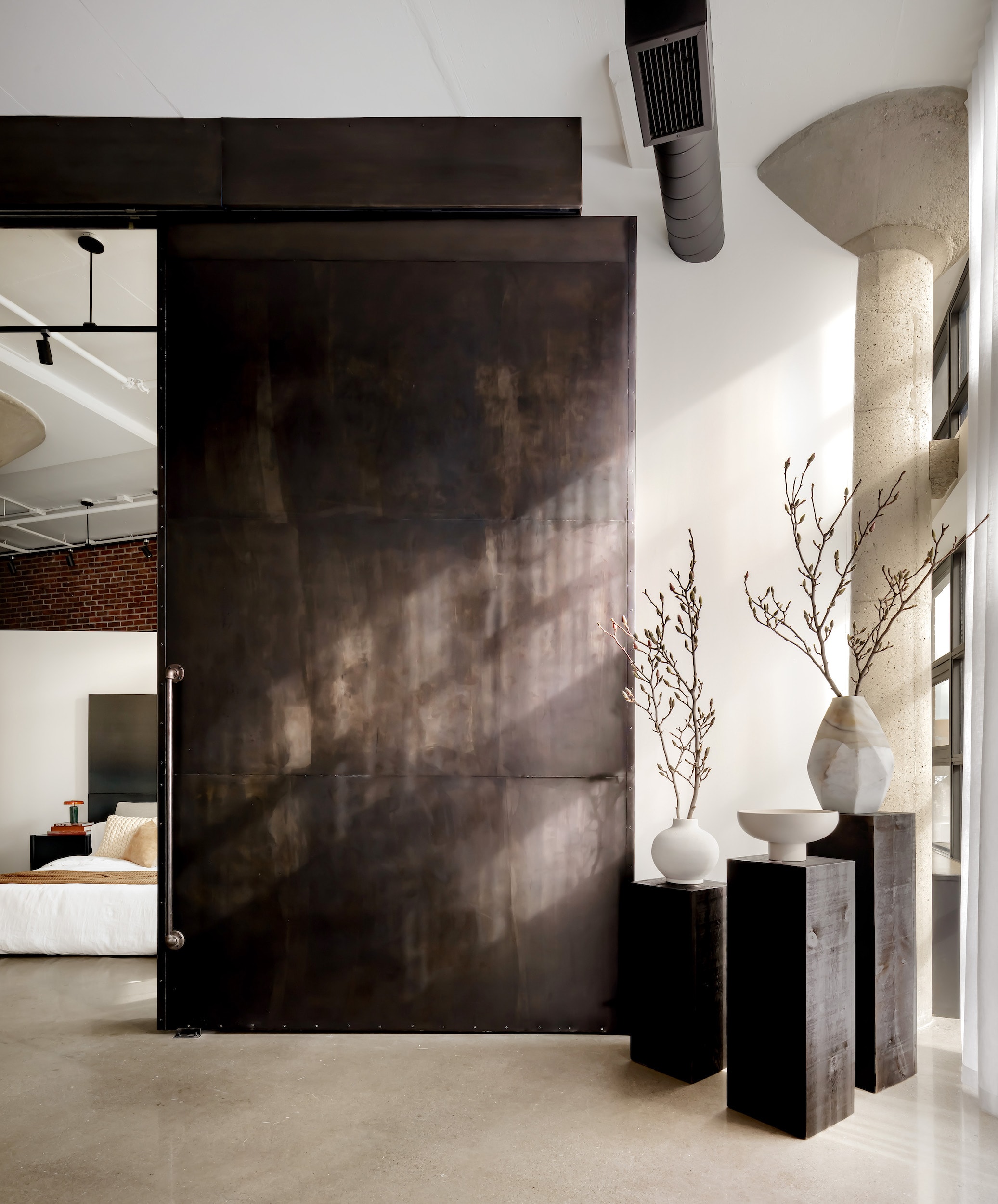 The oversized steel doors that were conceived as movable walls, along with another hidden door, serve for privacy and sound proofing for differing areas while also allowing open concept living for the empty nesters.