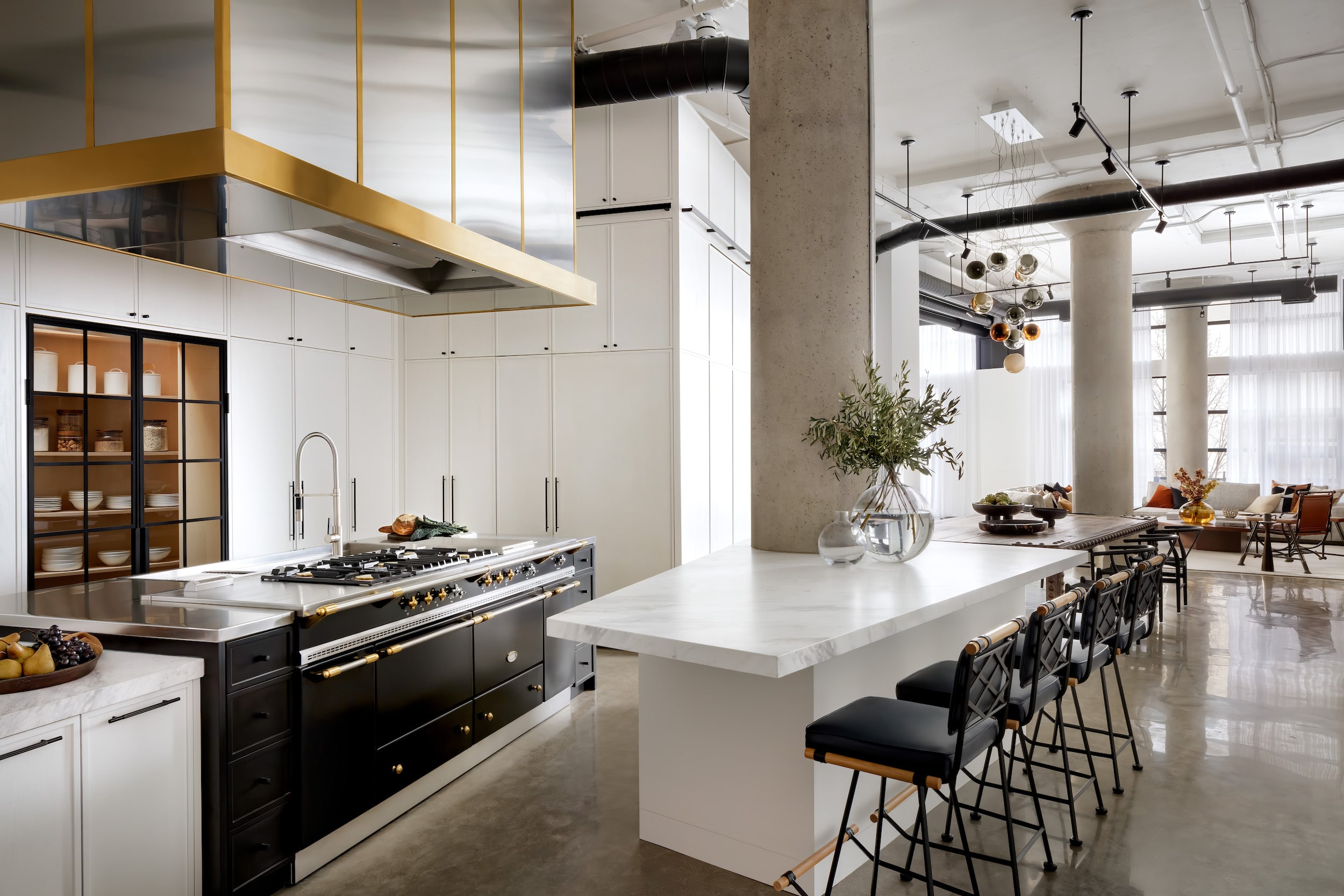 The unit features two 4.26m-tall steel doors, an oversized industrial inspired steel hood floating on top of a three-sided cooking area with a 2.1m range, a 1.8m sink and an oversized sectional.