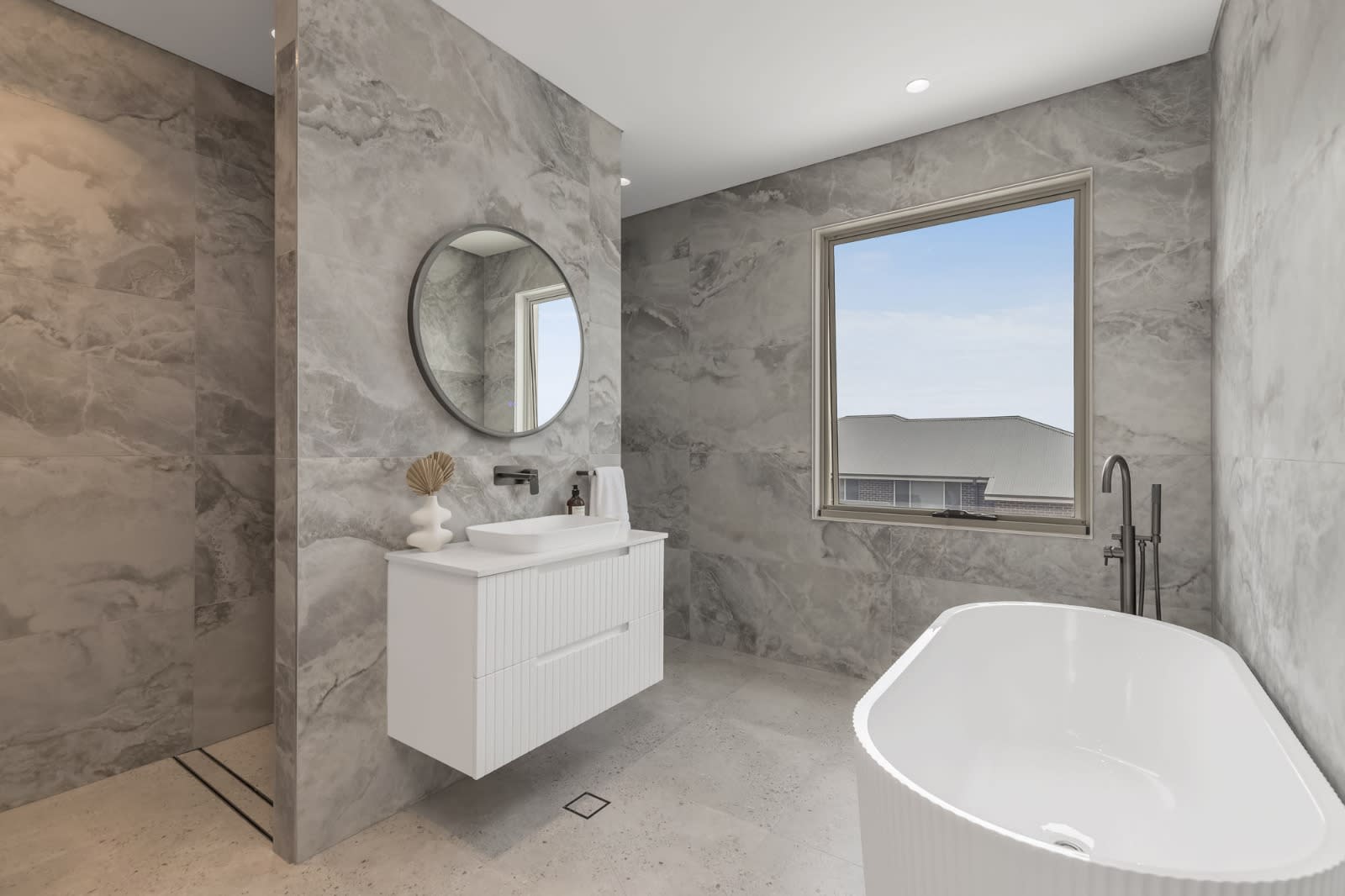 The spacious master bedroom overlooks the pool with full height fixed glass windows and features an oversized ensuite with a walk-around twin shower, twin floating vanities, and indulgent underfloor heating.