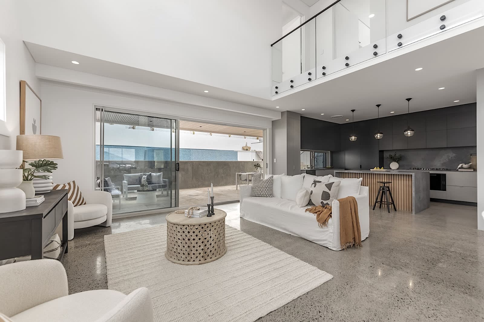 With a striking 5.7m ceiling and polished concrete floors that catch the light in ever-changing patterns, the home celebrates natural beauty and refined comfort.