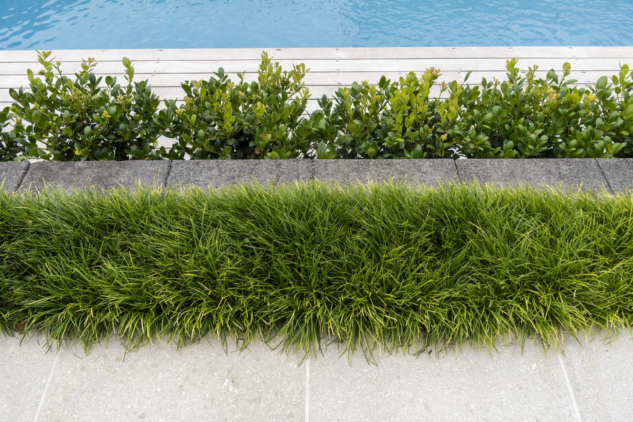 Innovative elements such as vertical sleeper pool fencing and a mix of glass and timber screening enhance privacy without compromising openness.