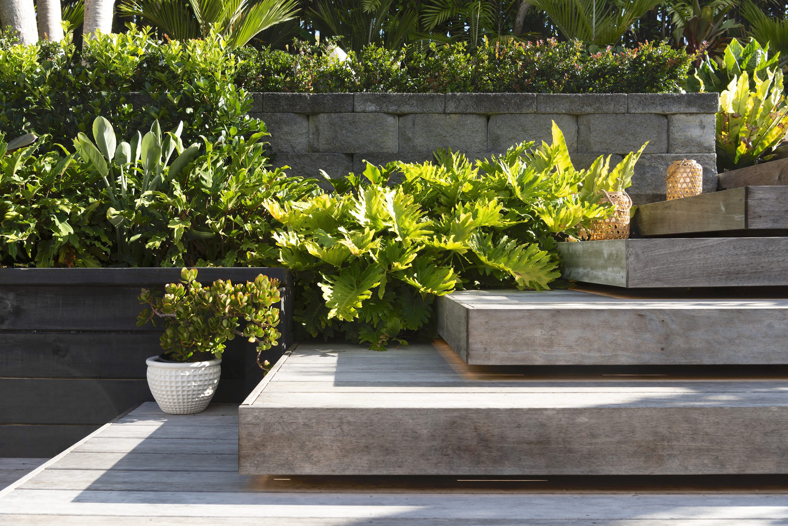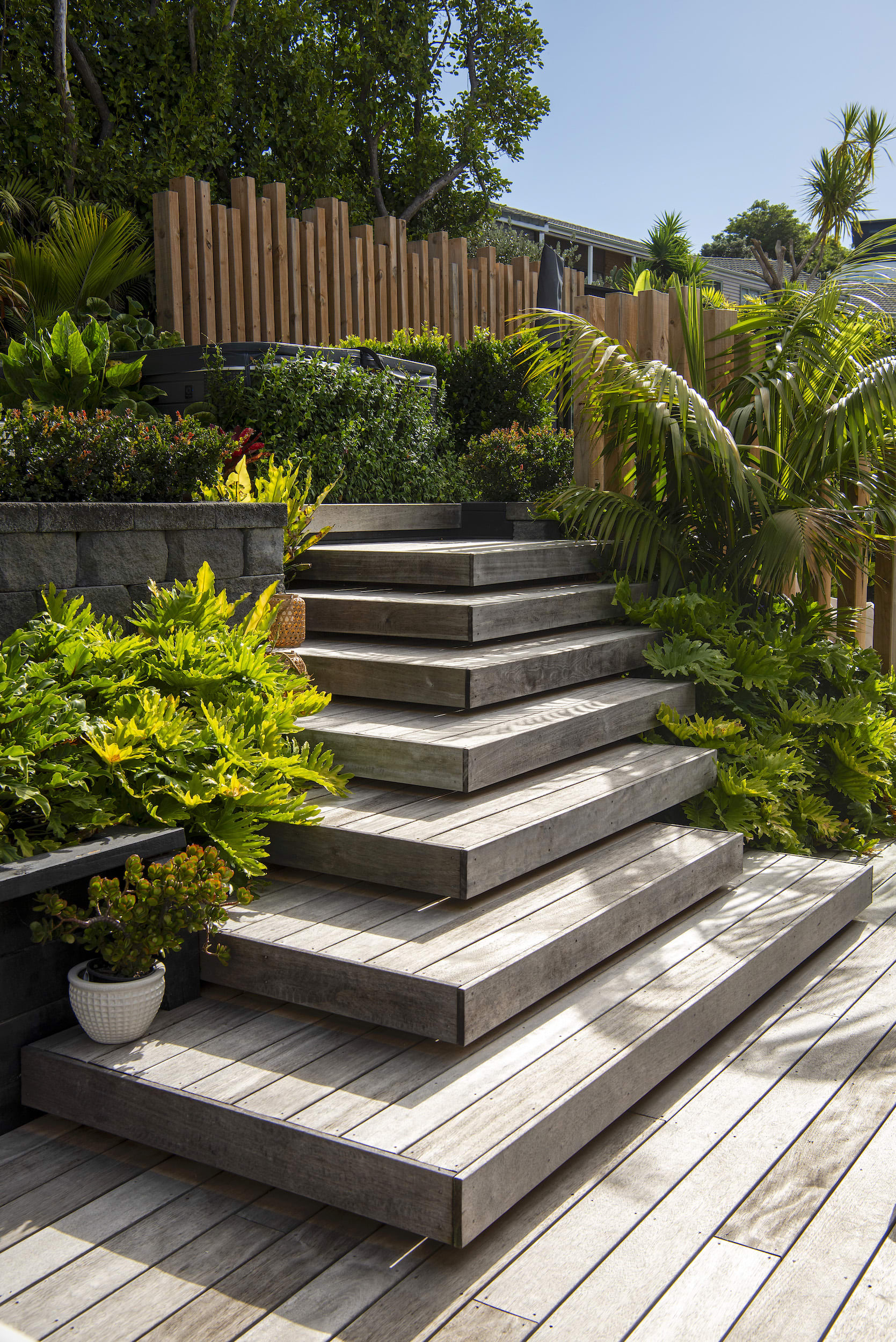 Highlights include a feature rock garden, lush sub-tropical planting, floating timber stairs, and an elegant gazebo with a louvered roof.