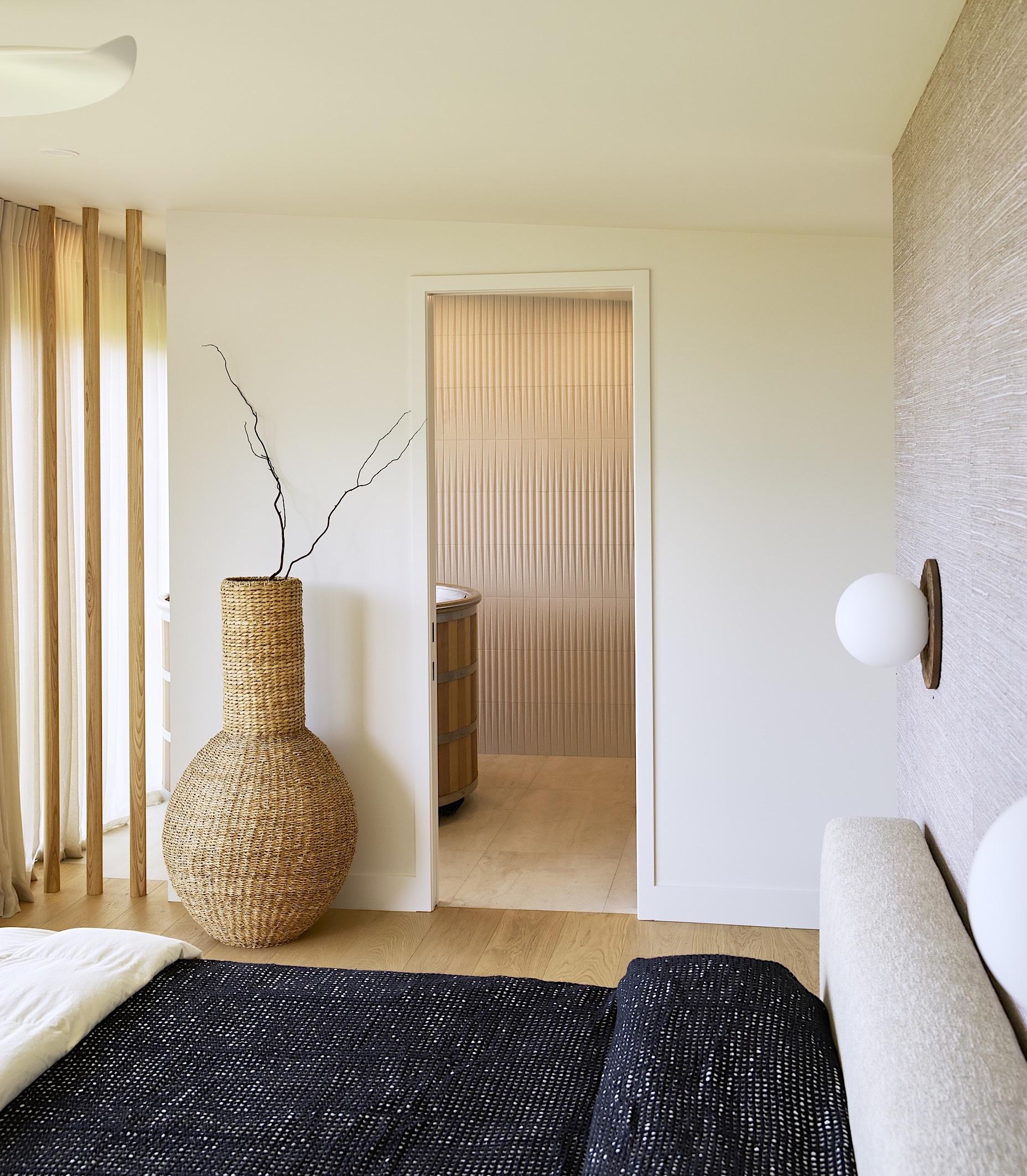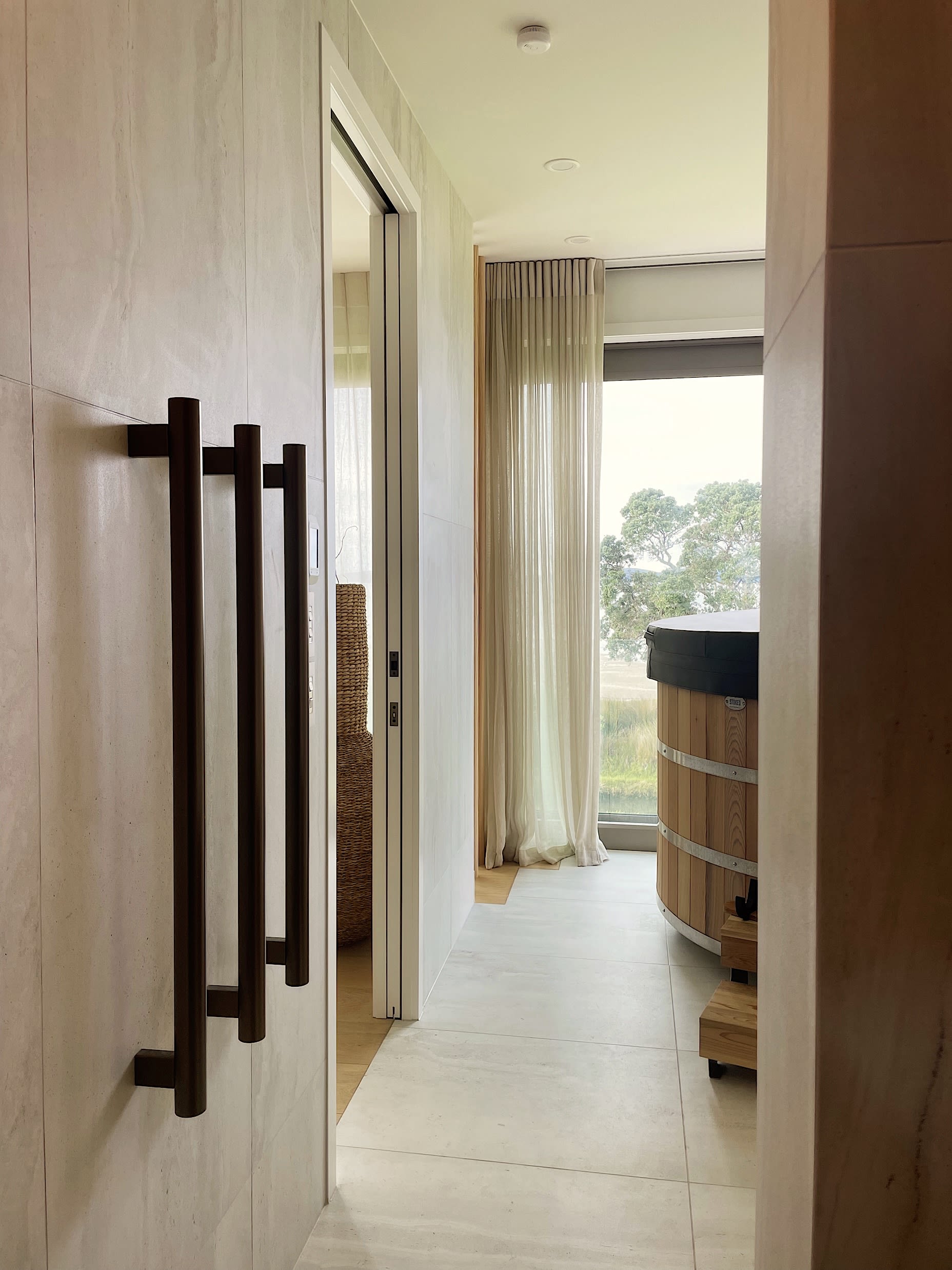 The ensuite interacts with its outside environment readily yet by drawing a full wall of delicate sheer drapes it is possible to instantly deliver a sense of privacy and intimacy.