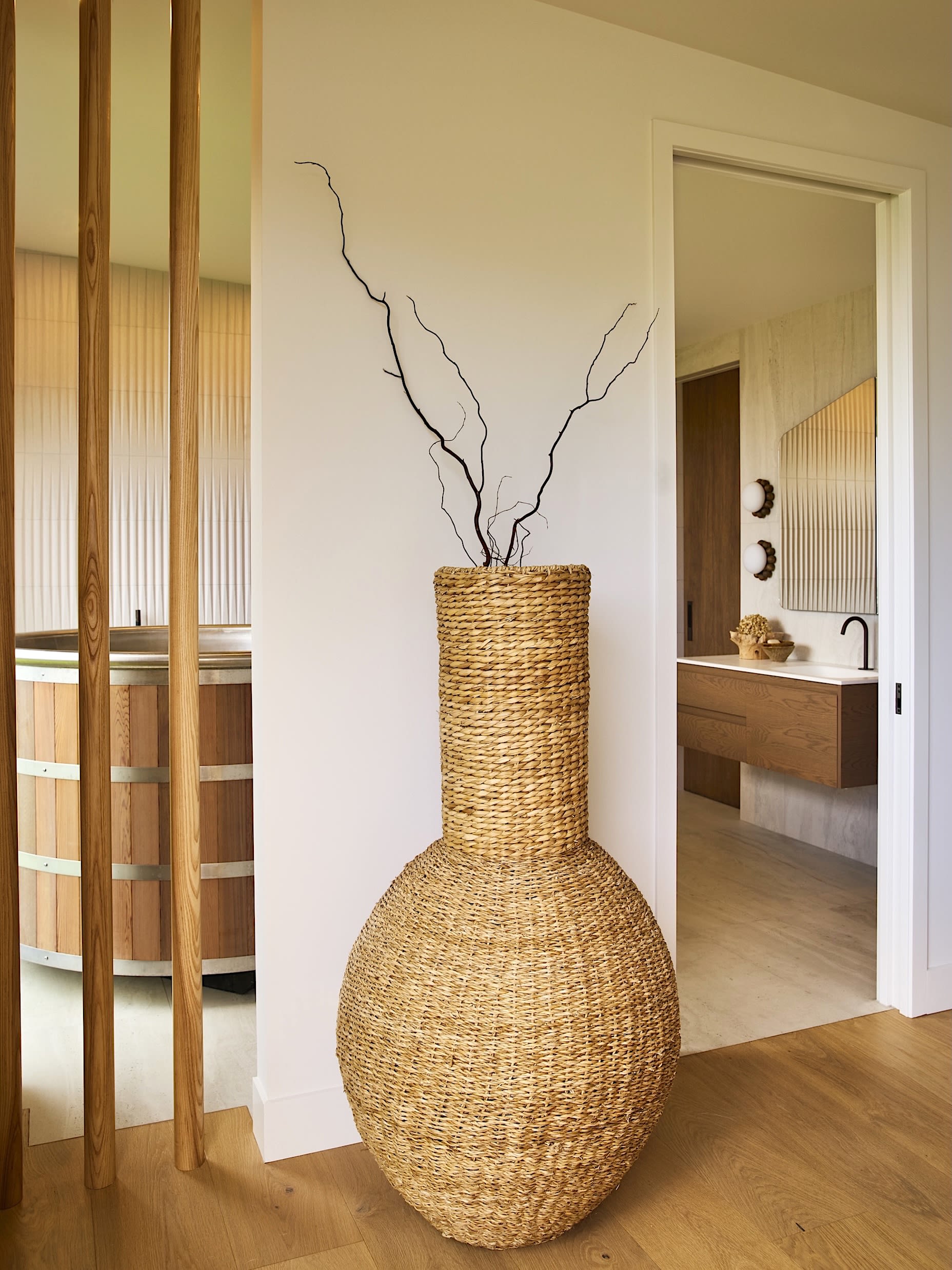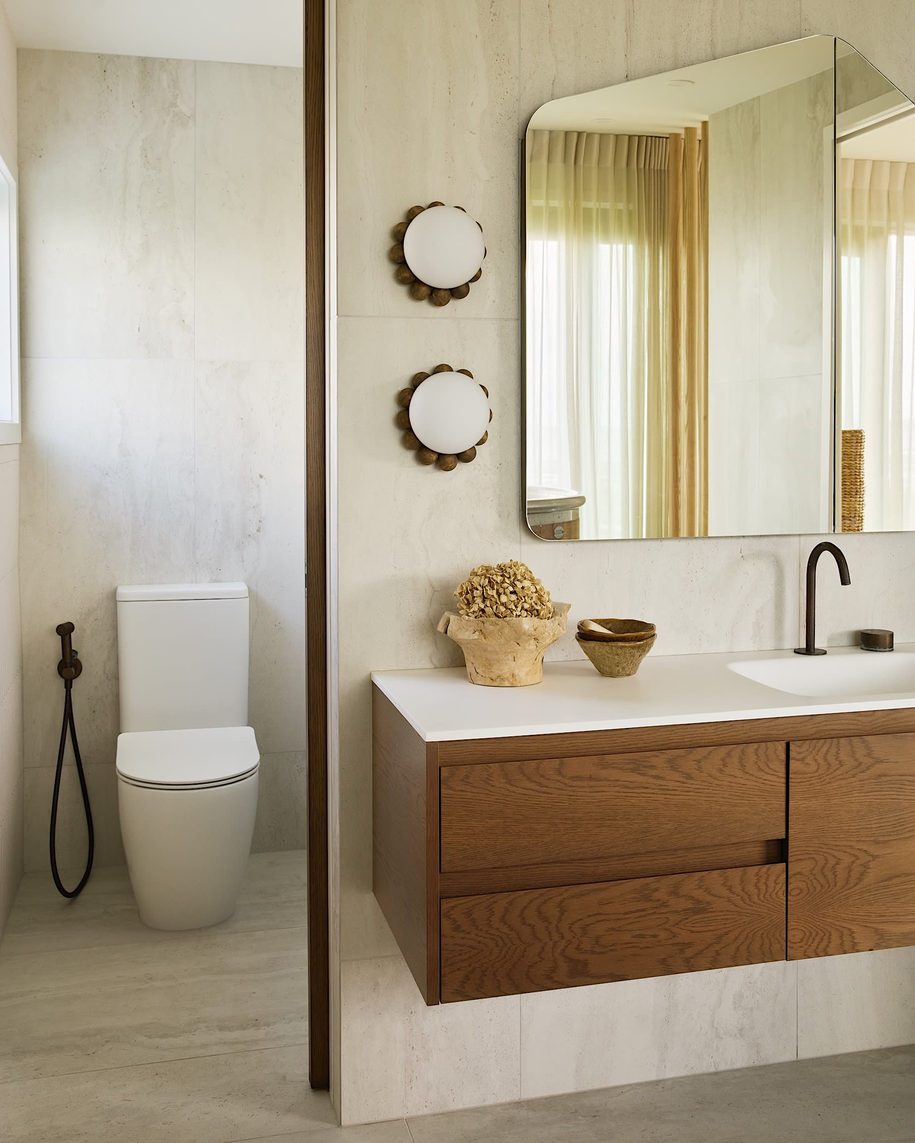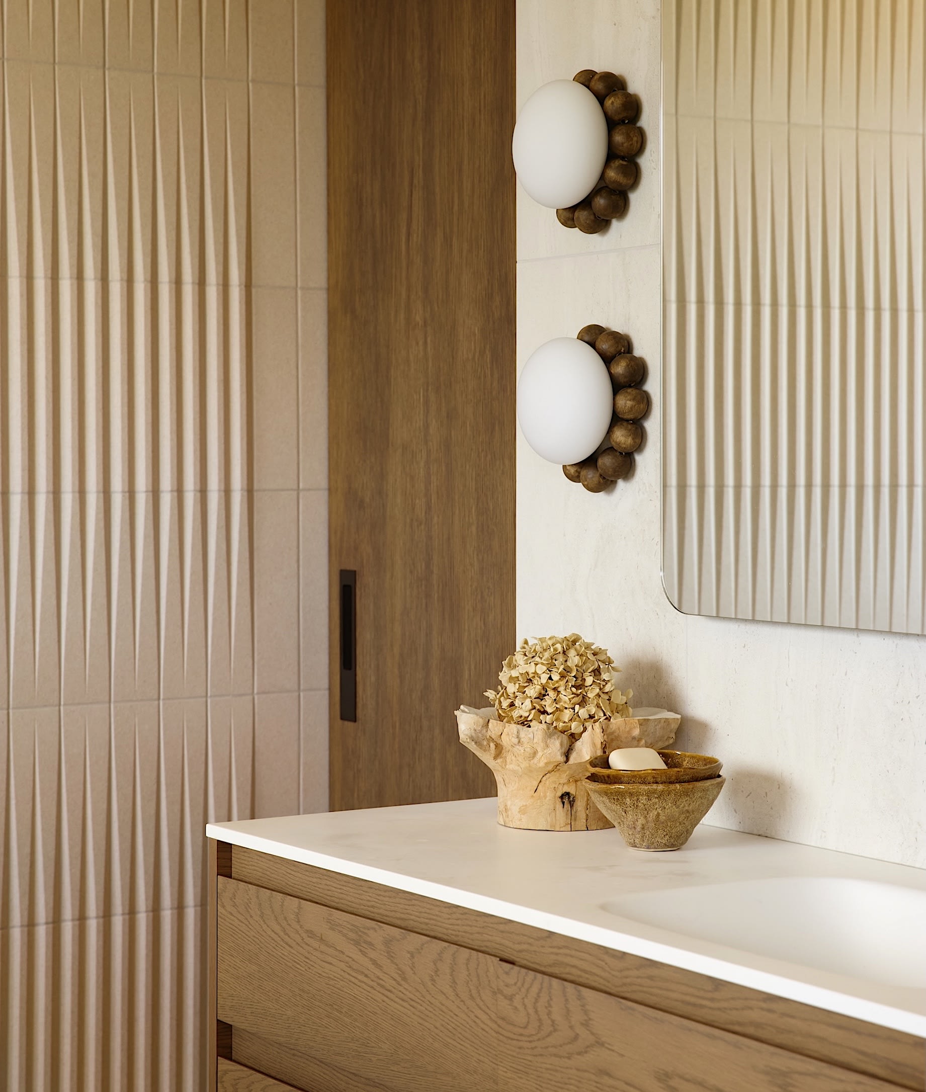 A crafted organically shaped mirror cabinet paired with warm wooden lighting beads hint at soft sea creature forms.
