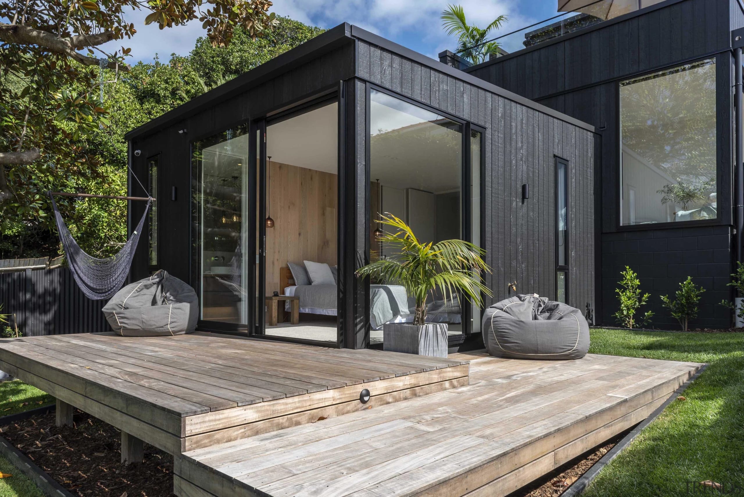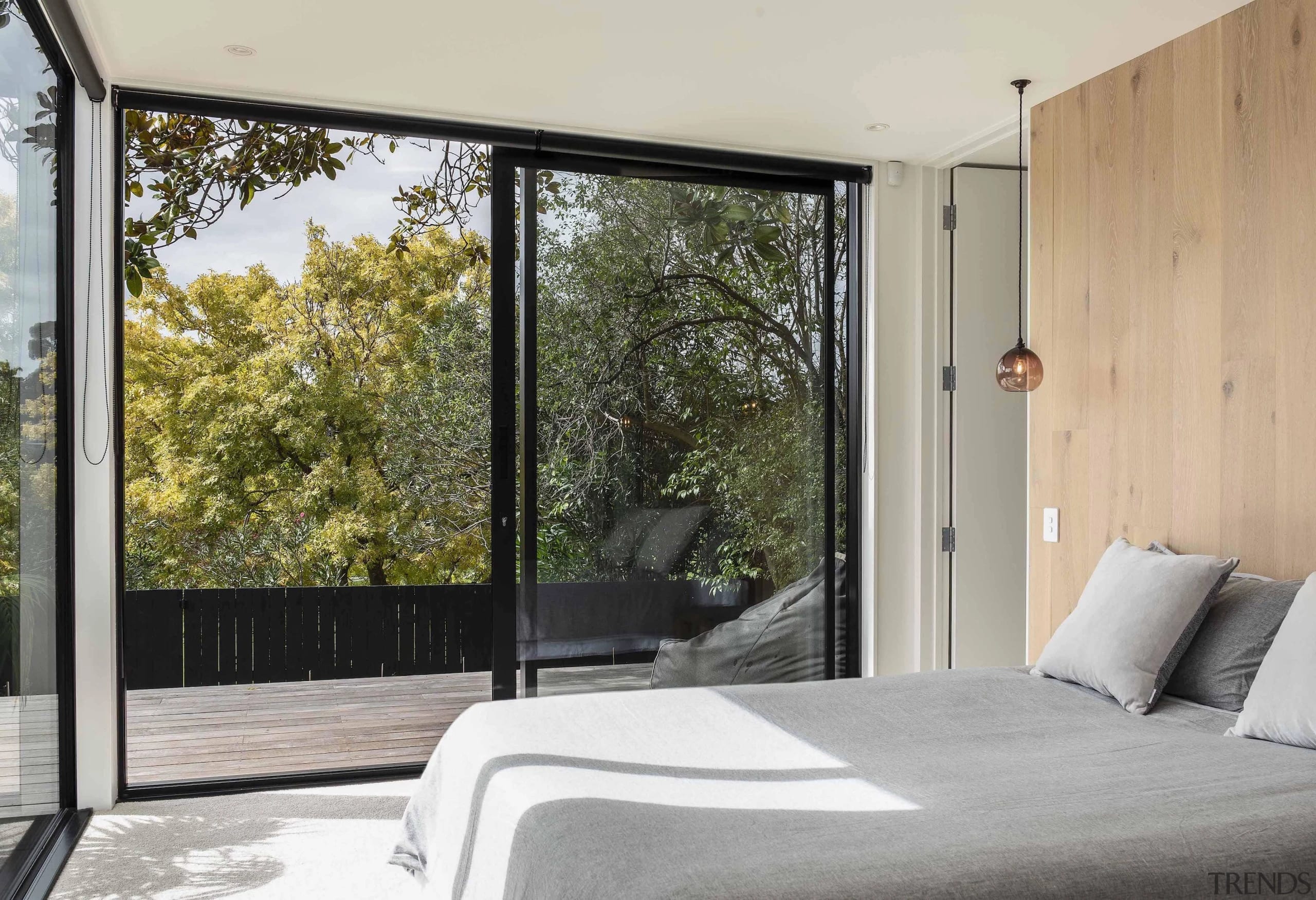 The main bedroom, on the lowest part of the plan, feels grounded and enjoys access to generous decking.