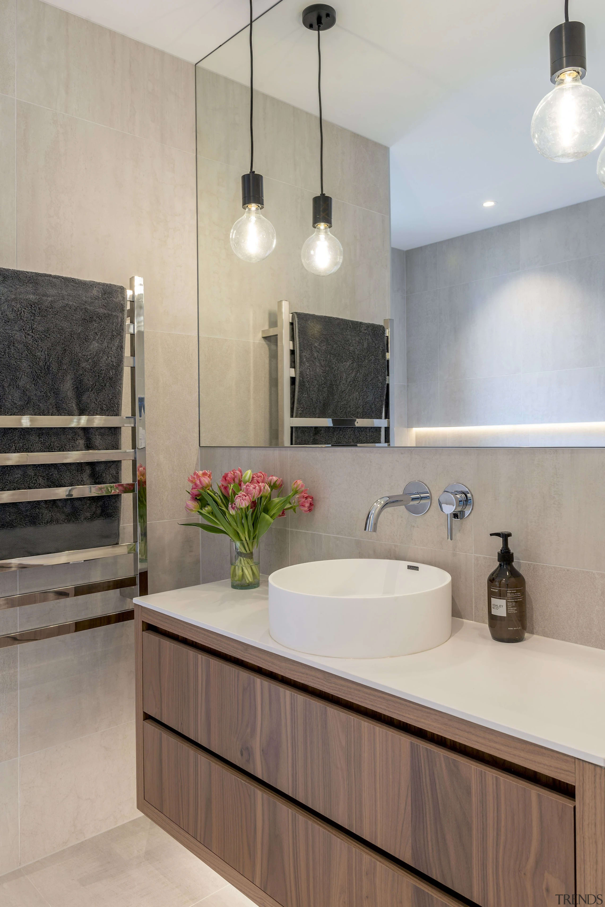Bathrooms were specified with luxurious touches such as the same walnut cabinetry and floor-to-ceiling tiles to all walls.