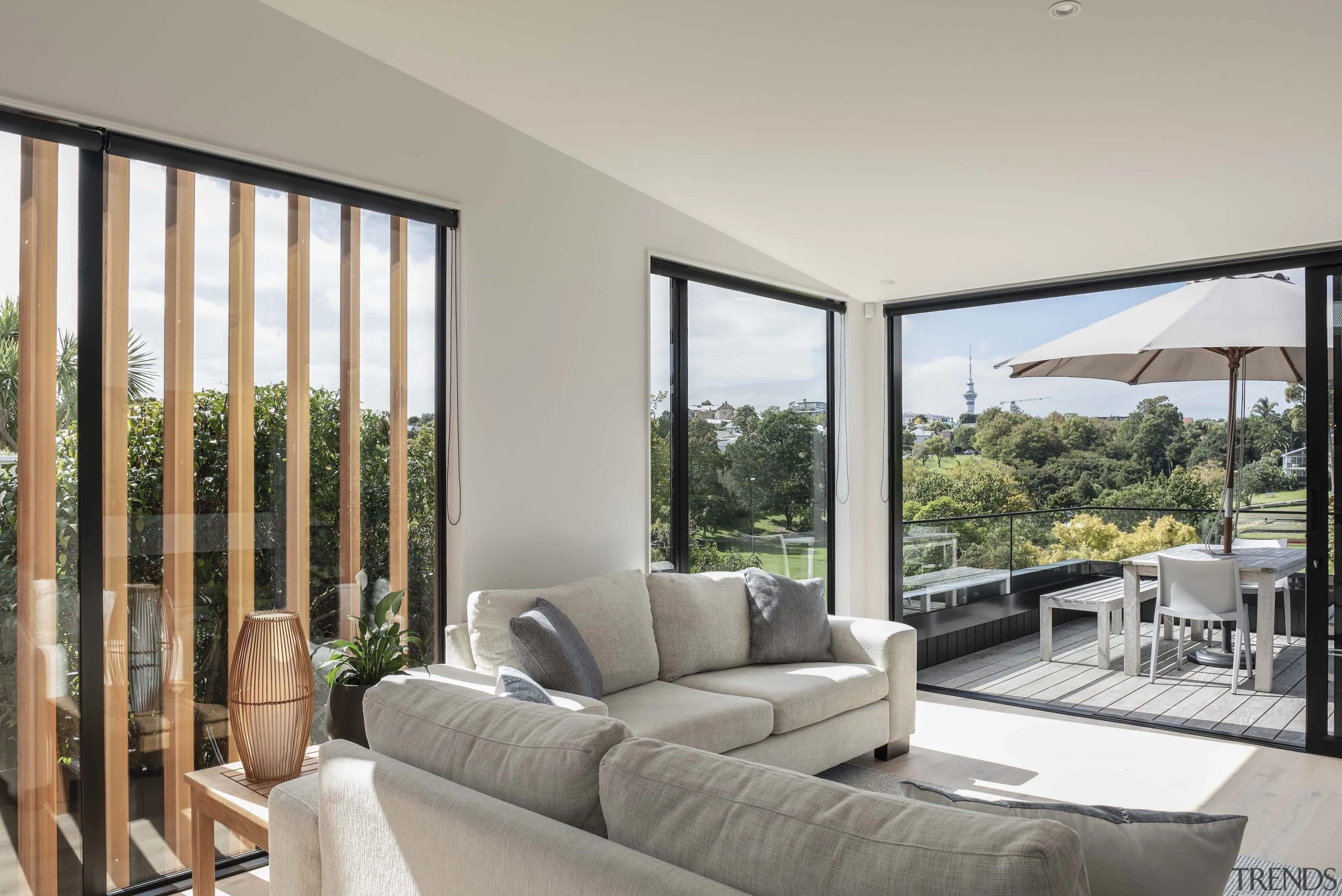 It is only once you turn a corner and enter the living room that a tableau of the city, with the Auckland Sky Tower spiking up, emerges.