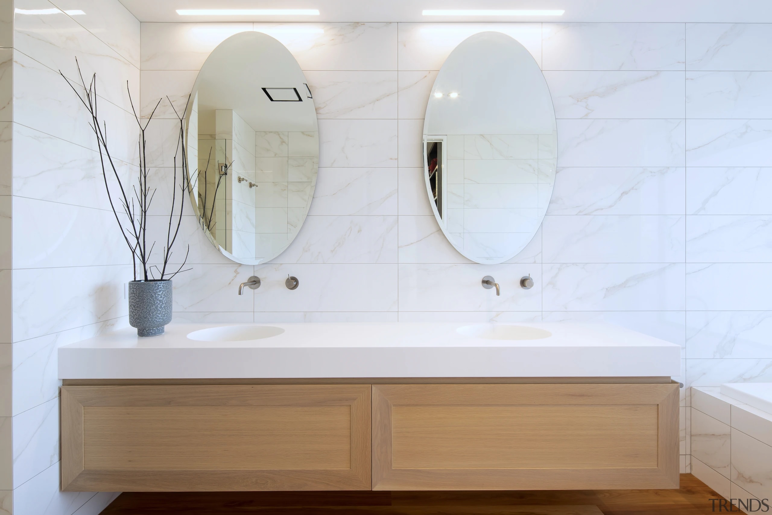 We positioned the built-in bath in front of the large window, to bring the outdoors in. In addition, we positioned the bespoke oval floating mirrors and the cantilevered stained oak vanity with corian benchtop along the long wall. These custom pieces were designed by Eterno Design