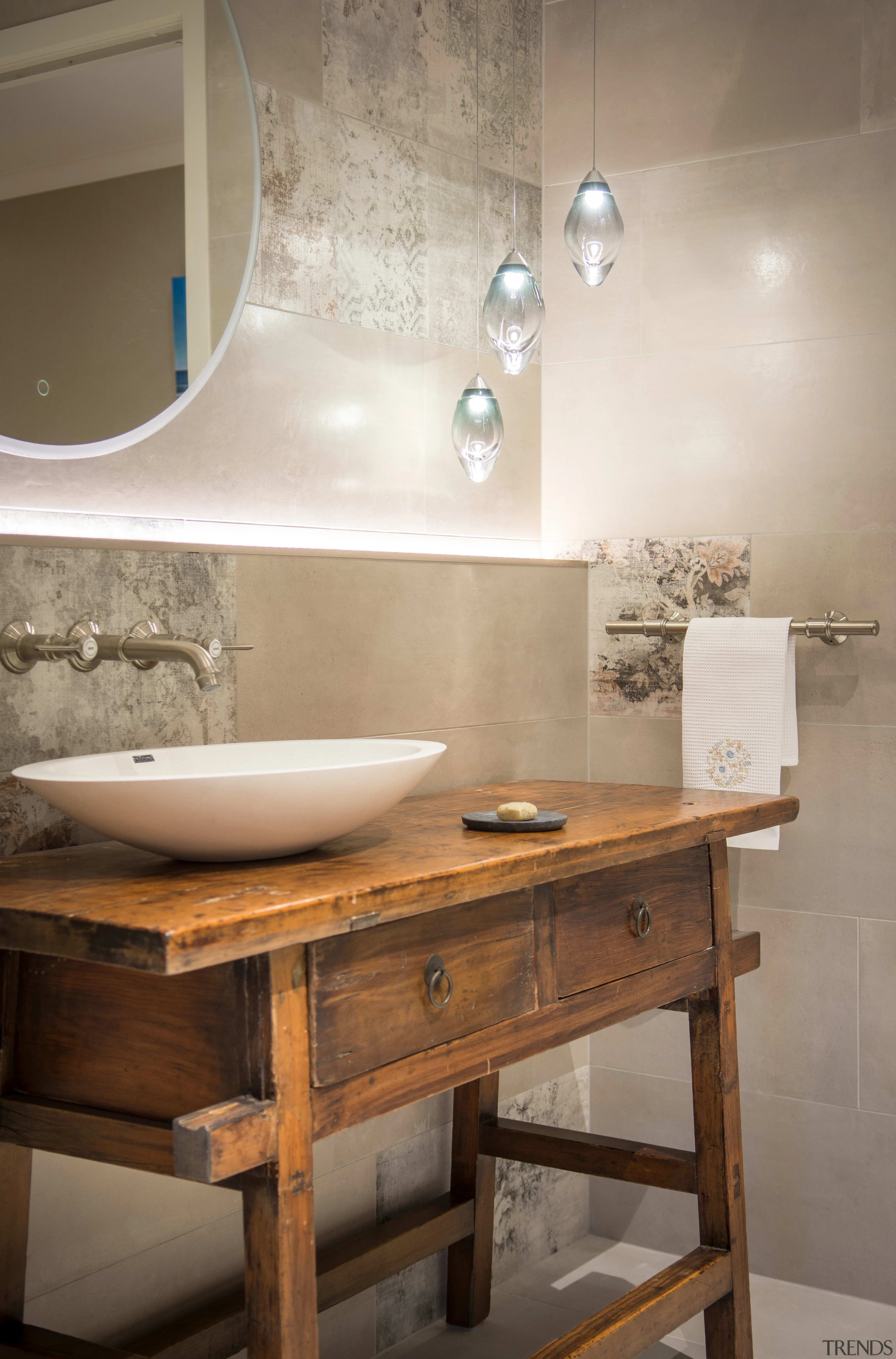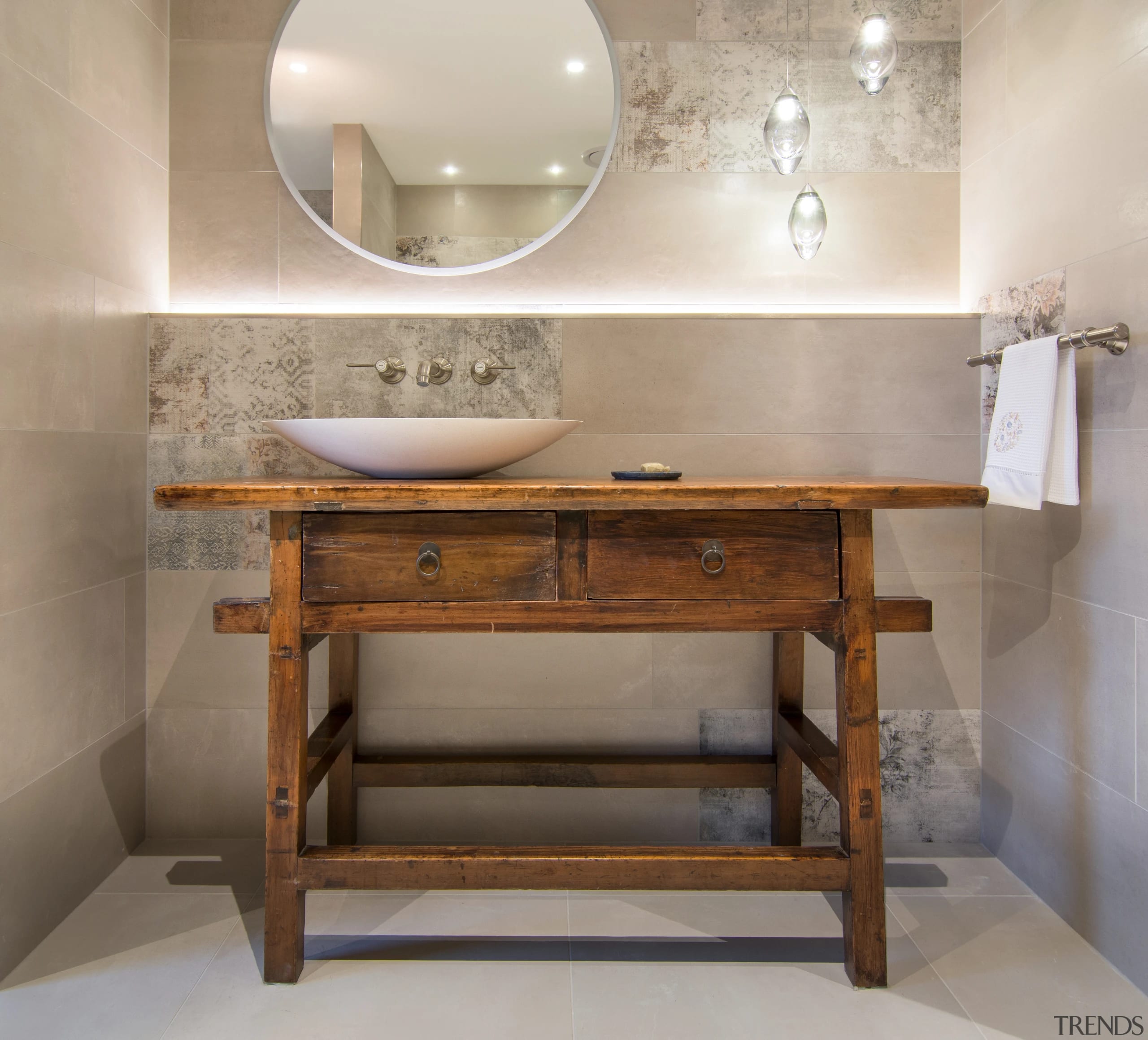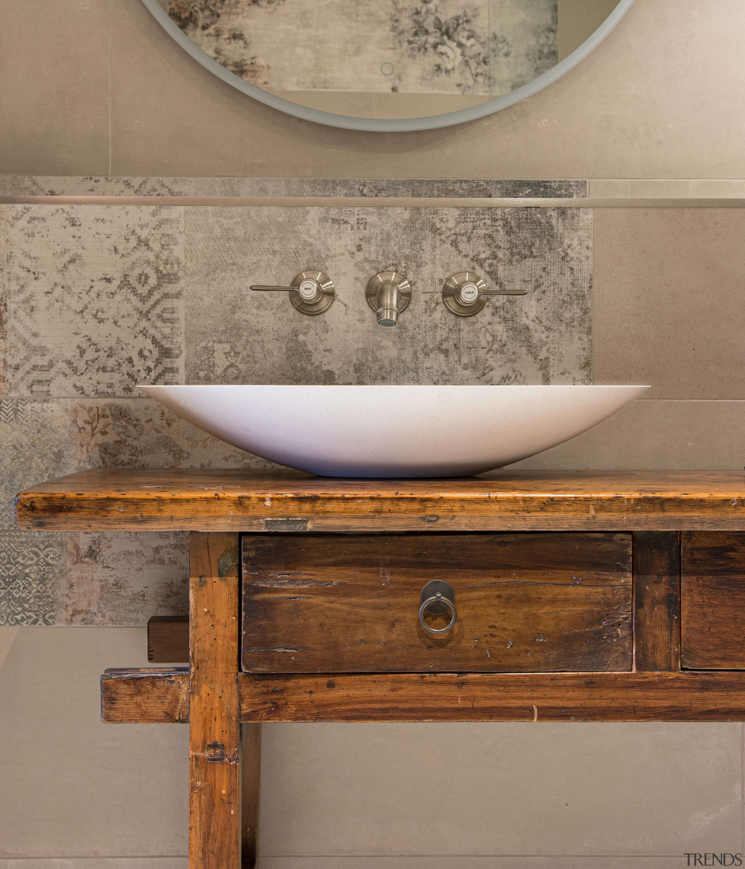Furthering the rustic appeal, the patterned wall tiles have a distressed, almost layered look.