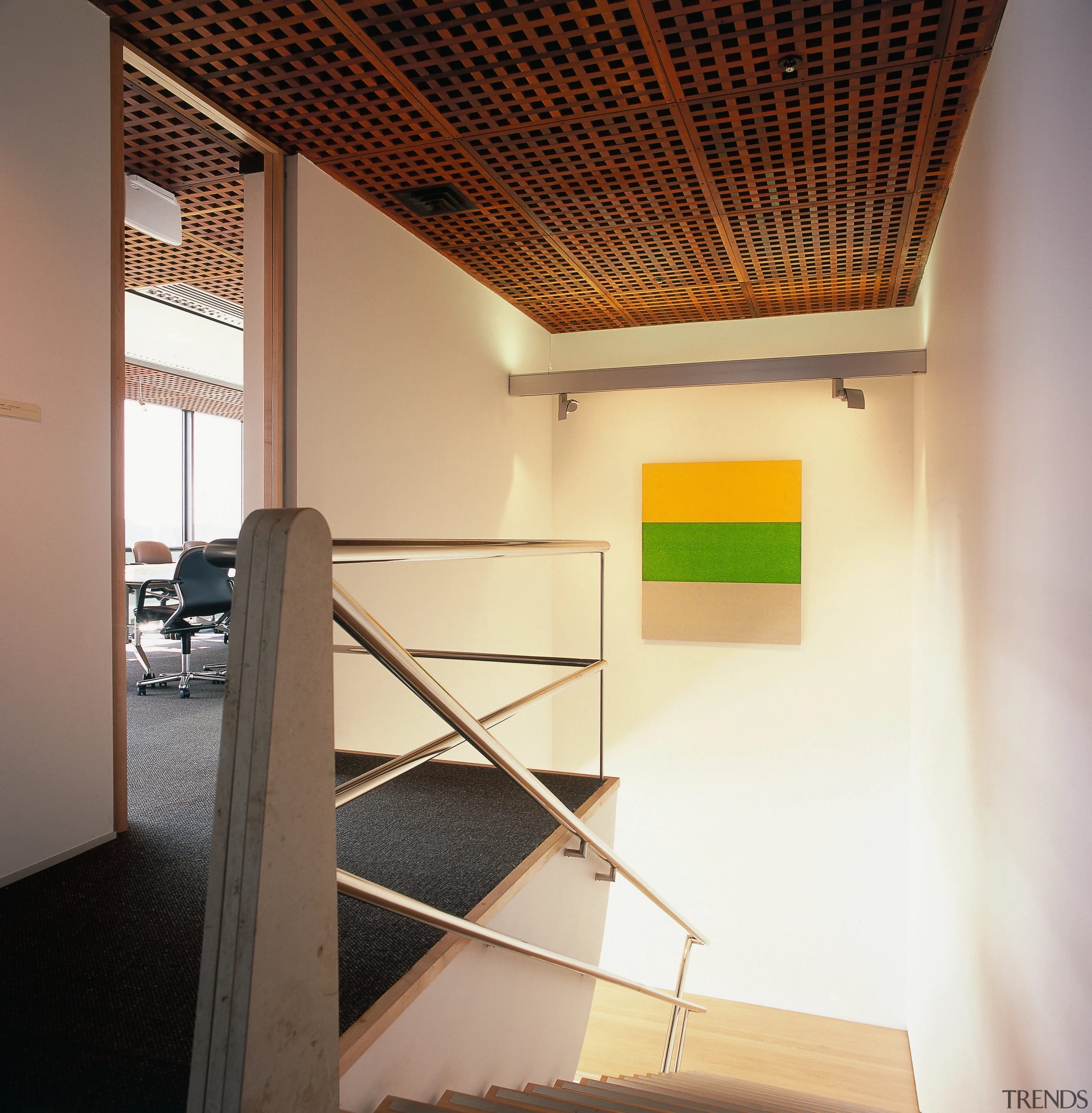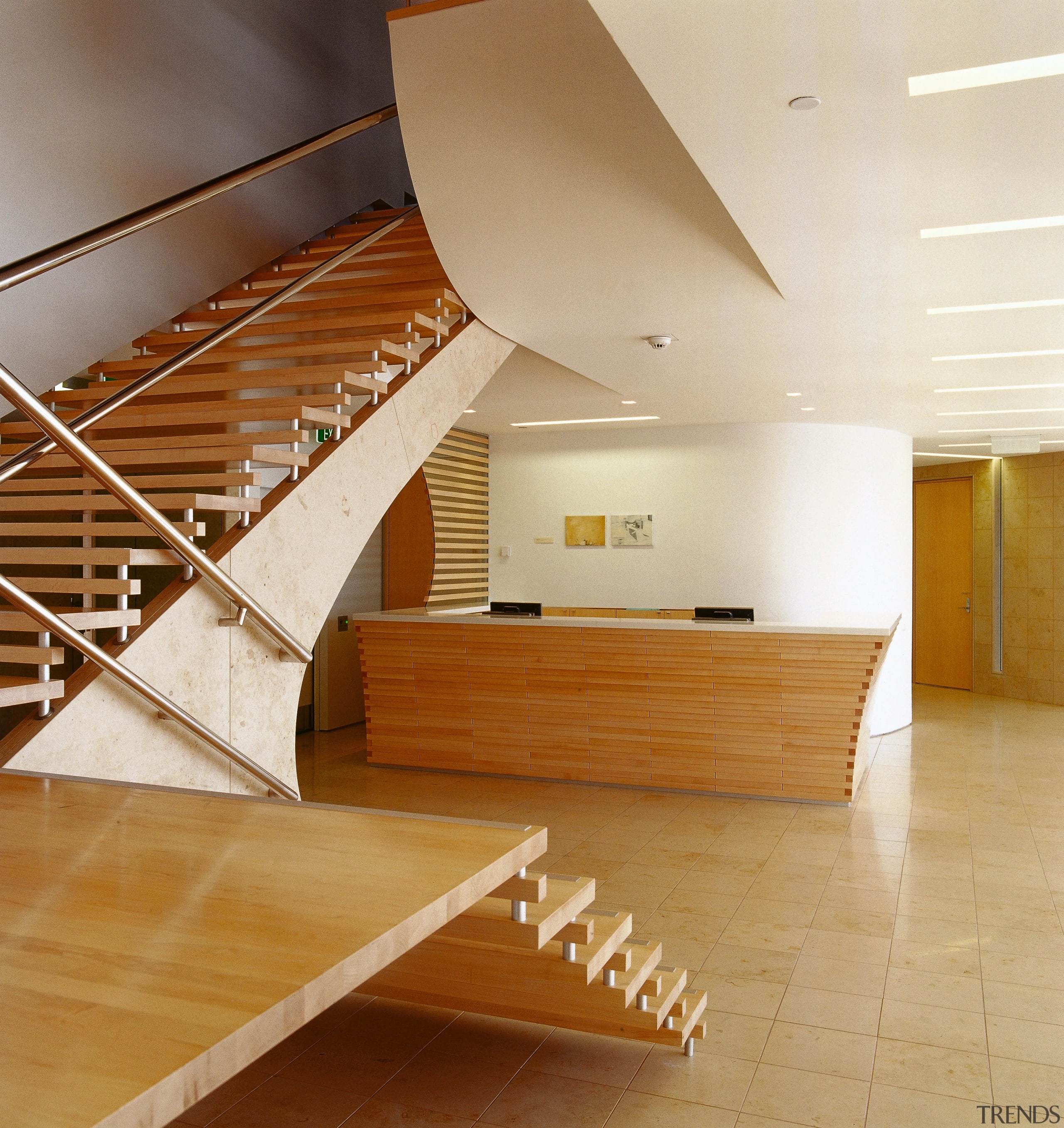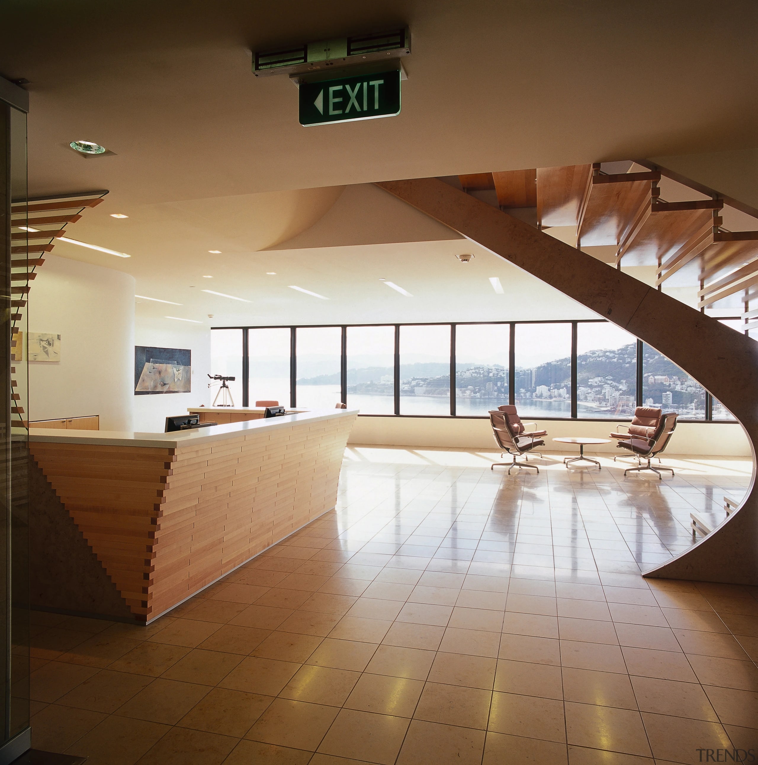 The expansive reception area, minimalist in design, but with the interest of curved wooden forms, affords panoramic views across the harbour. The distinctive stairwell leads up to the meeting rooms, with the offices situated one floor below.