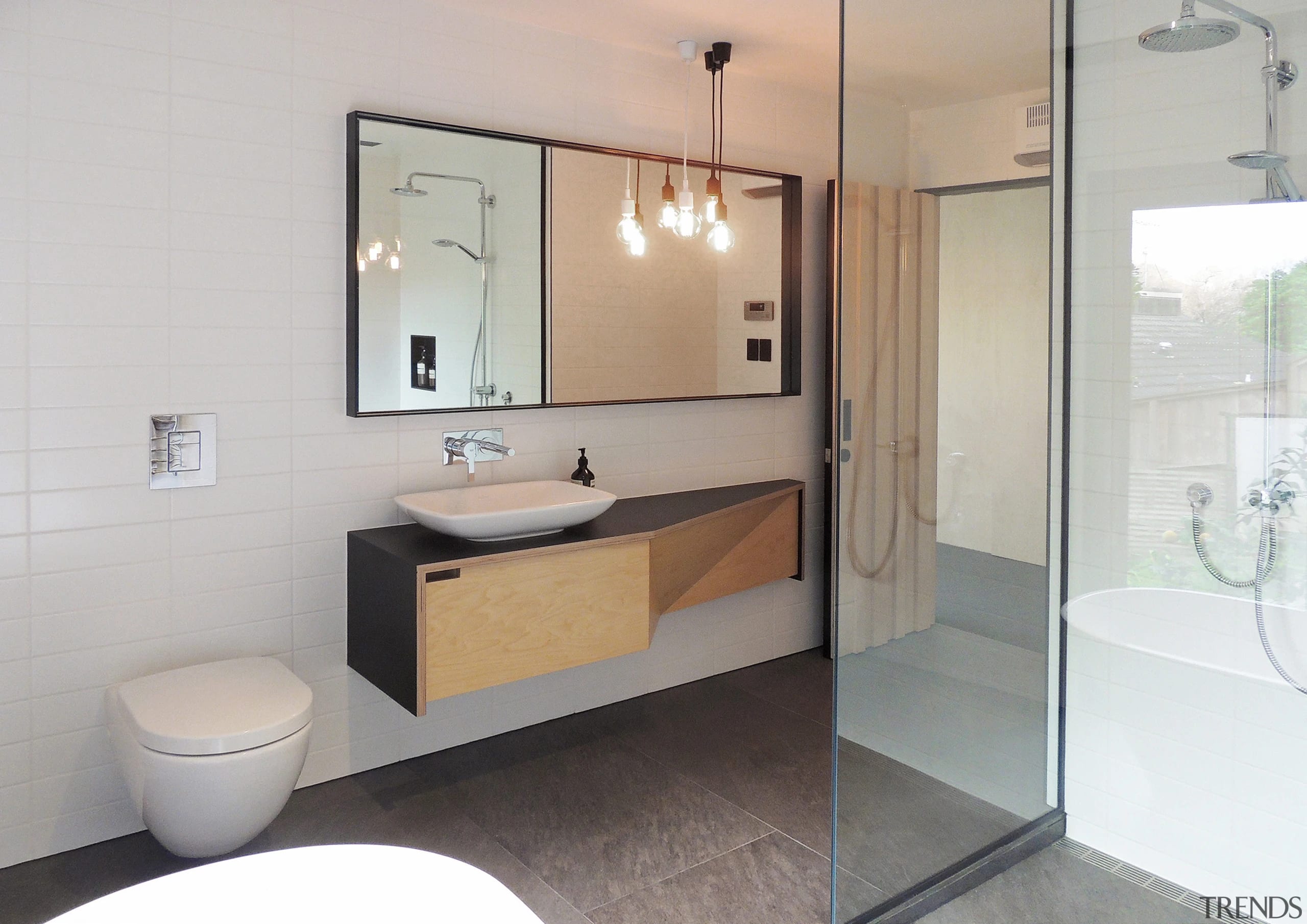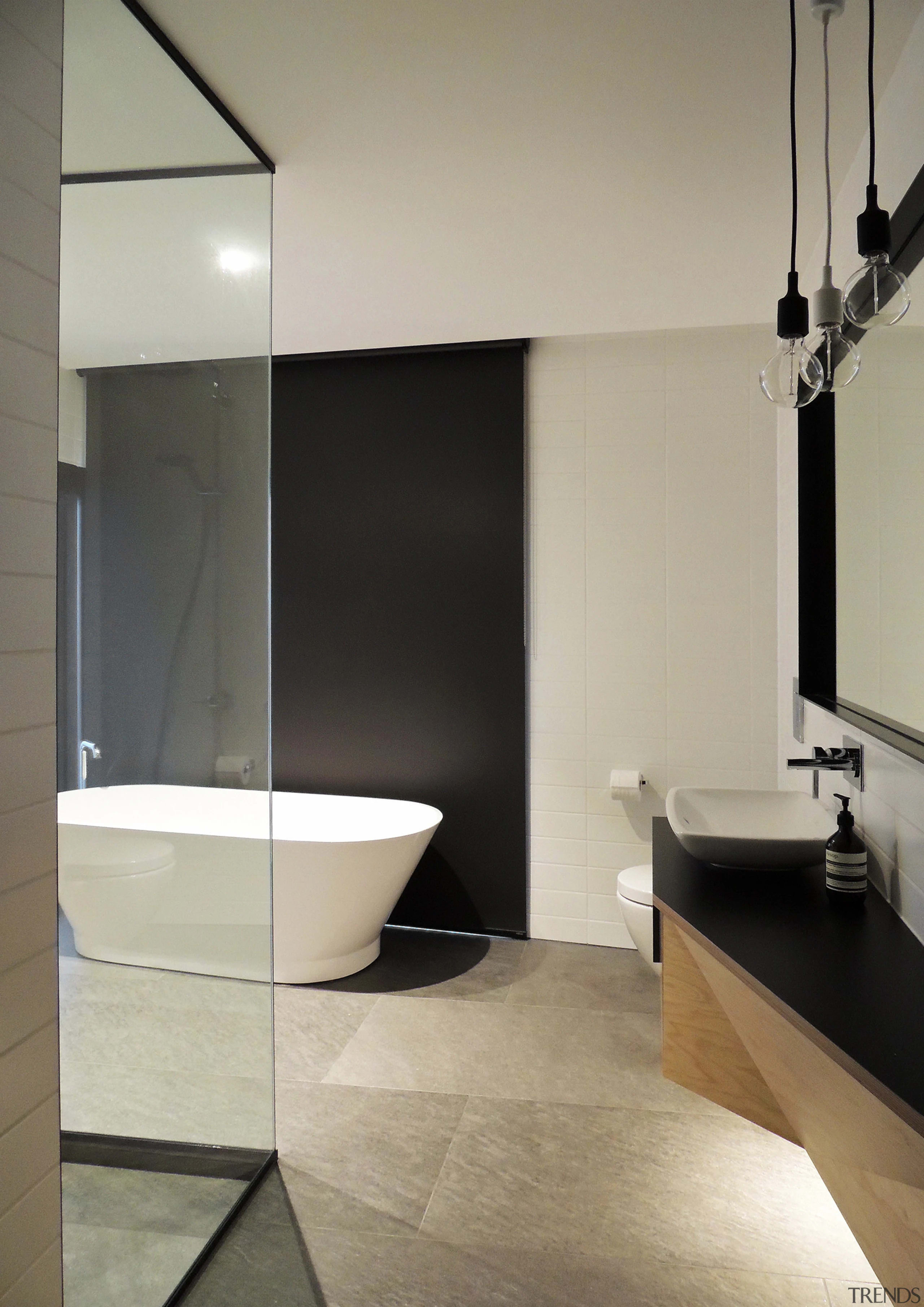”The understated wall tiles are contrasted with large-format porcelain floor tiles that have the look of stone. These are laid in a third off-set pattern and match the use of the same tile elsewhere in the home.”