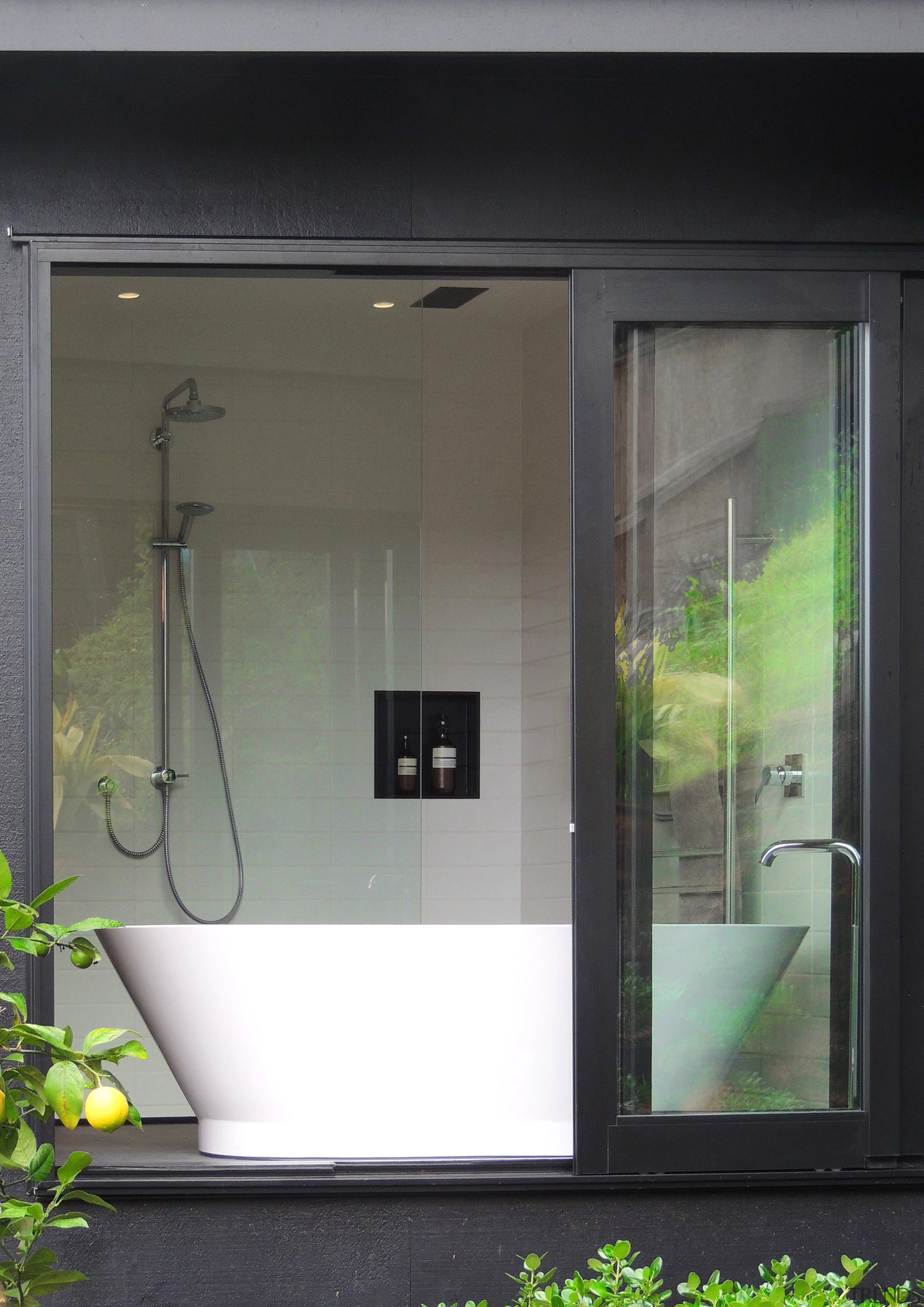 While the shower takes up one outer corner of the ensuite, the freestanding tub takes pride of place at the other outer, fully glazed, corner. This arrangement, together with the concealed entry, is another surprise element in the bathroom. With the wall-height privacy blind raised, the bathtub’s occupant looks directly out to a private garden, only visible from the ensuite. A triple-panel sliding door also allows direct access to this tucked-away outdoor space.