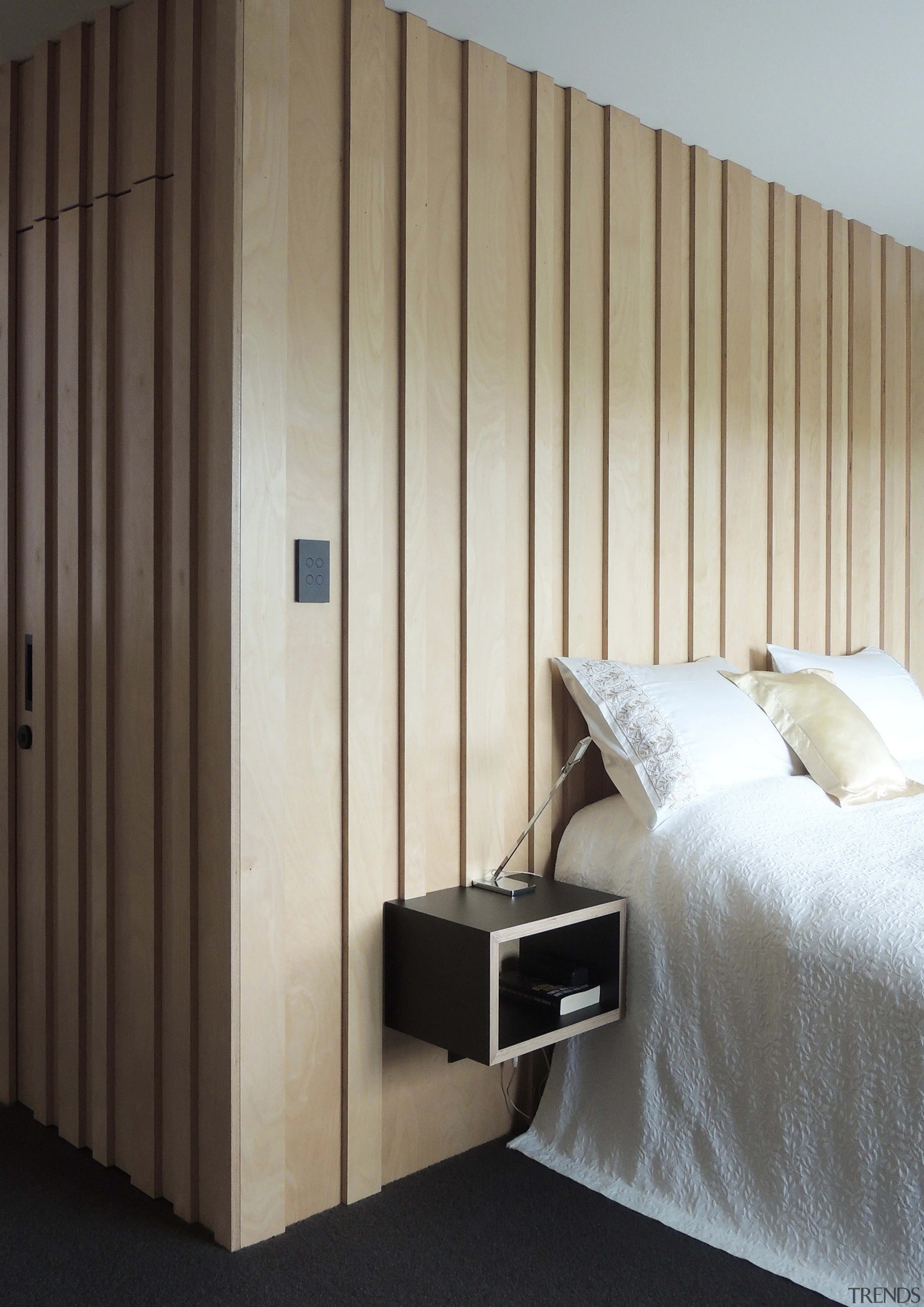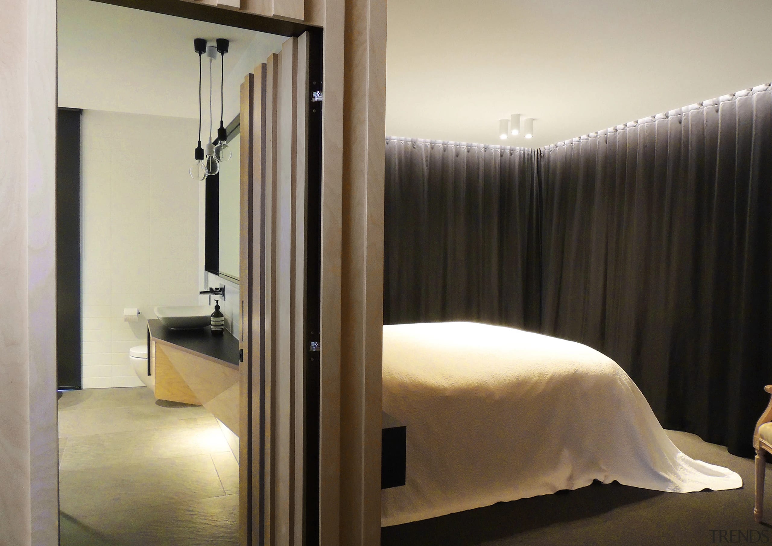 The batten wall in the bedroom includes a concealed door in the same finish leading into the ensuite. From the front door, you can see into the bedroom but the batten wall conceals the ensuite.”
