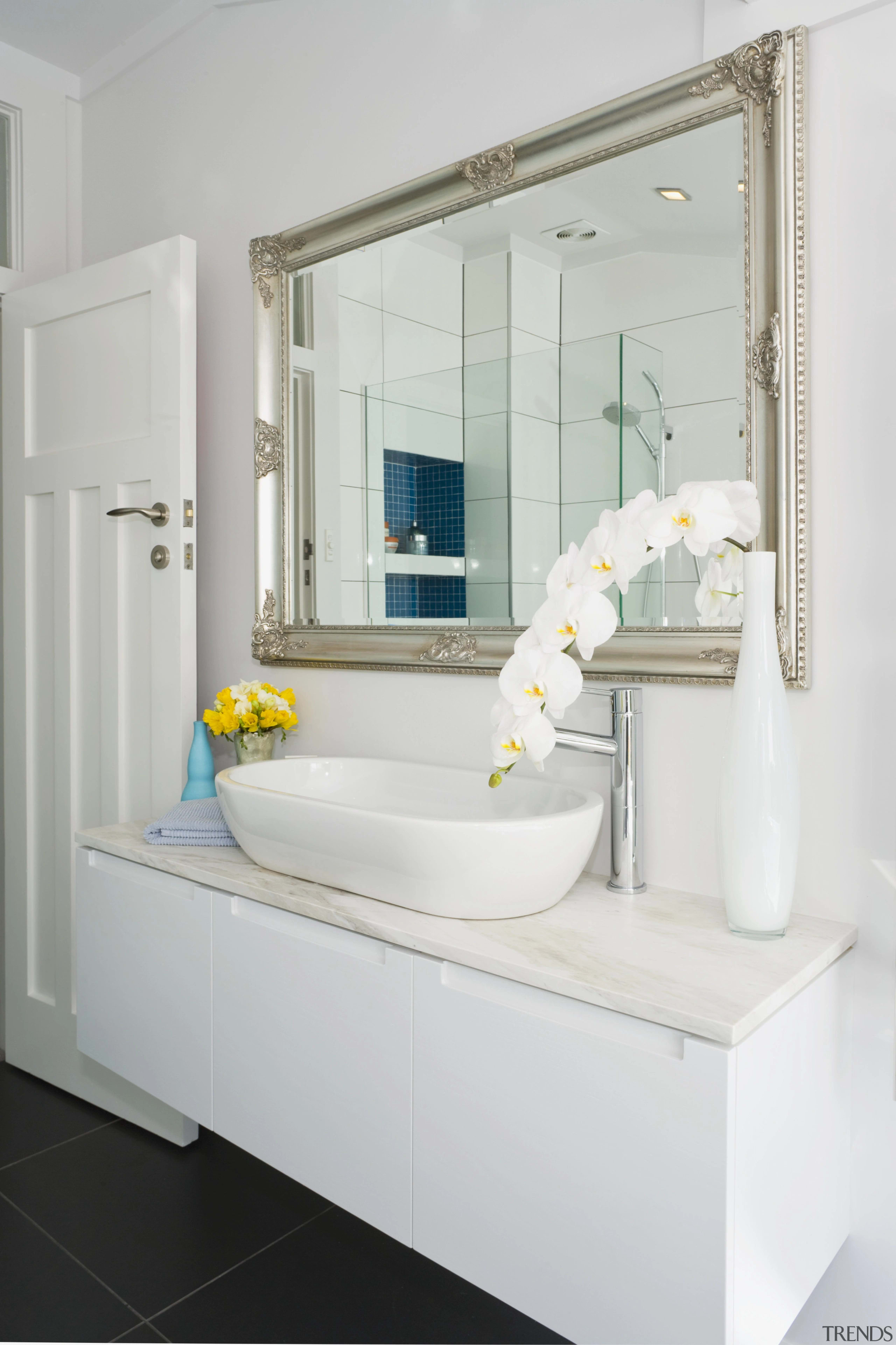 Interior designer Brian Haftka was asked to renovate a dated bathroom in a traditional villa. The owners wanted their new bathroom to be light and white, and include a larger bath and separate shower.