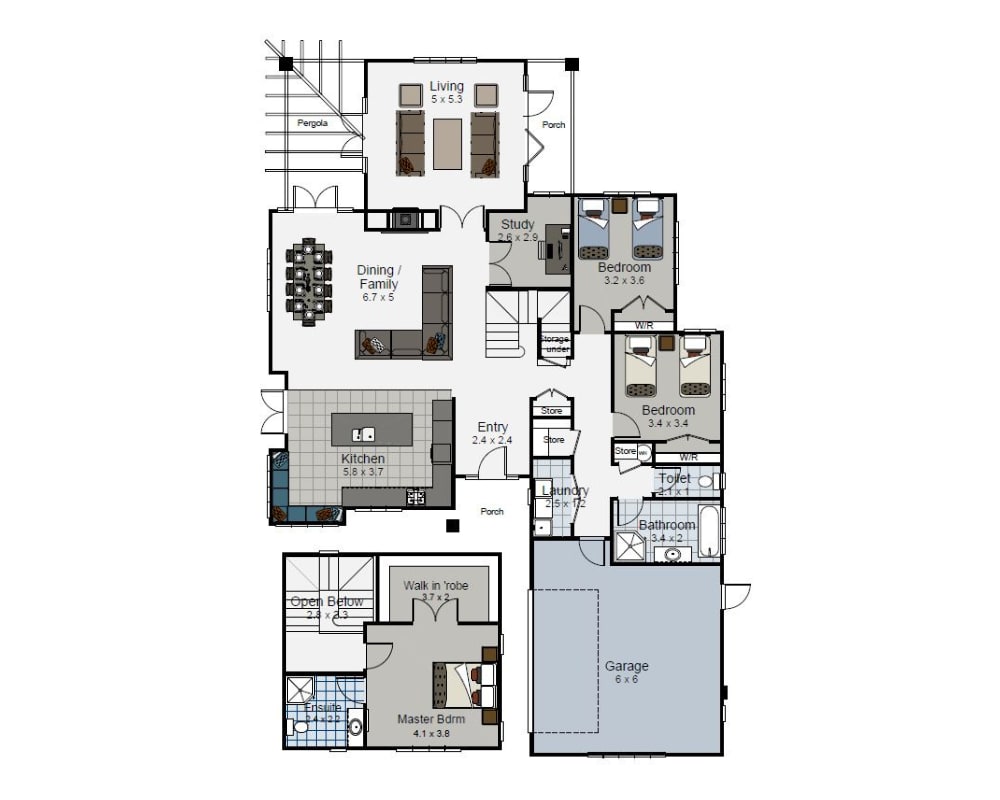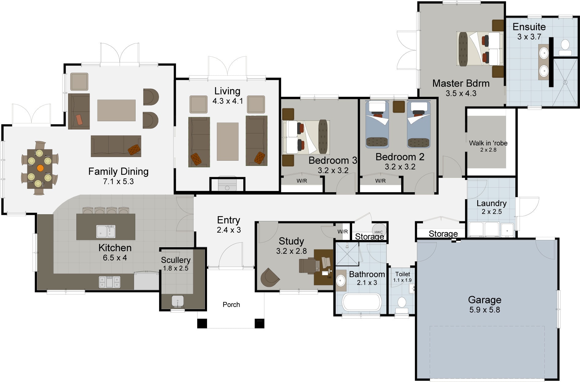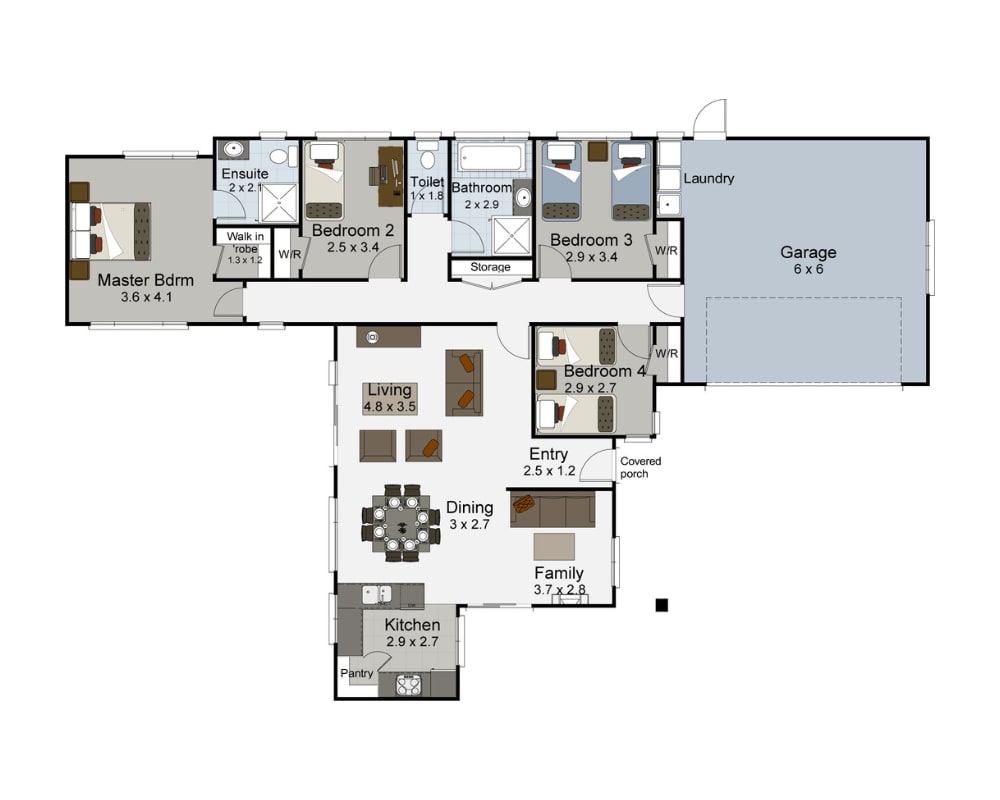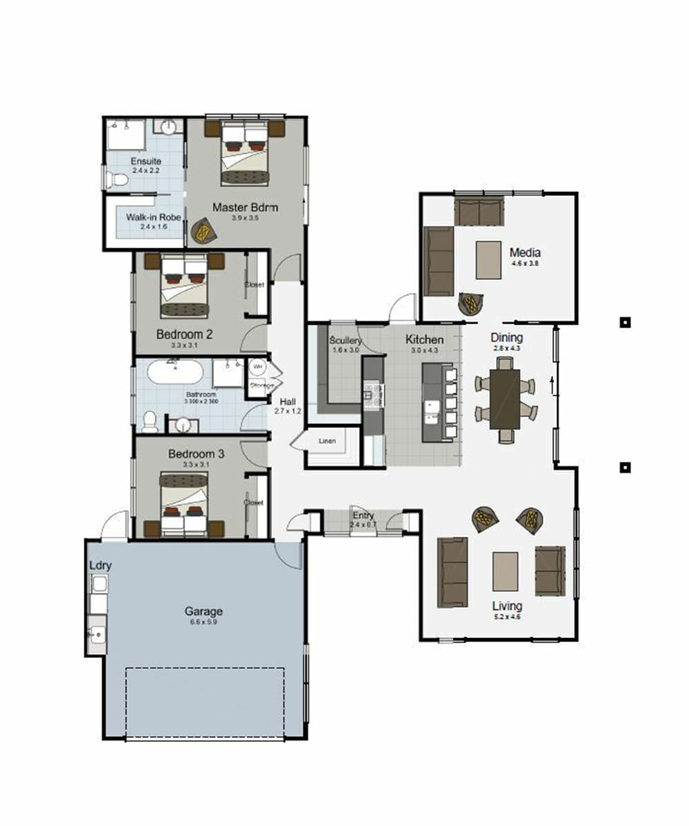 The Abel Tasman is designed for relaxed, sun-filled living. Ideal for east–west sites, it features spacious open-plan living, a large kitchen with a full scullery, and seamless indoor-outdoor flow through French doors.