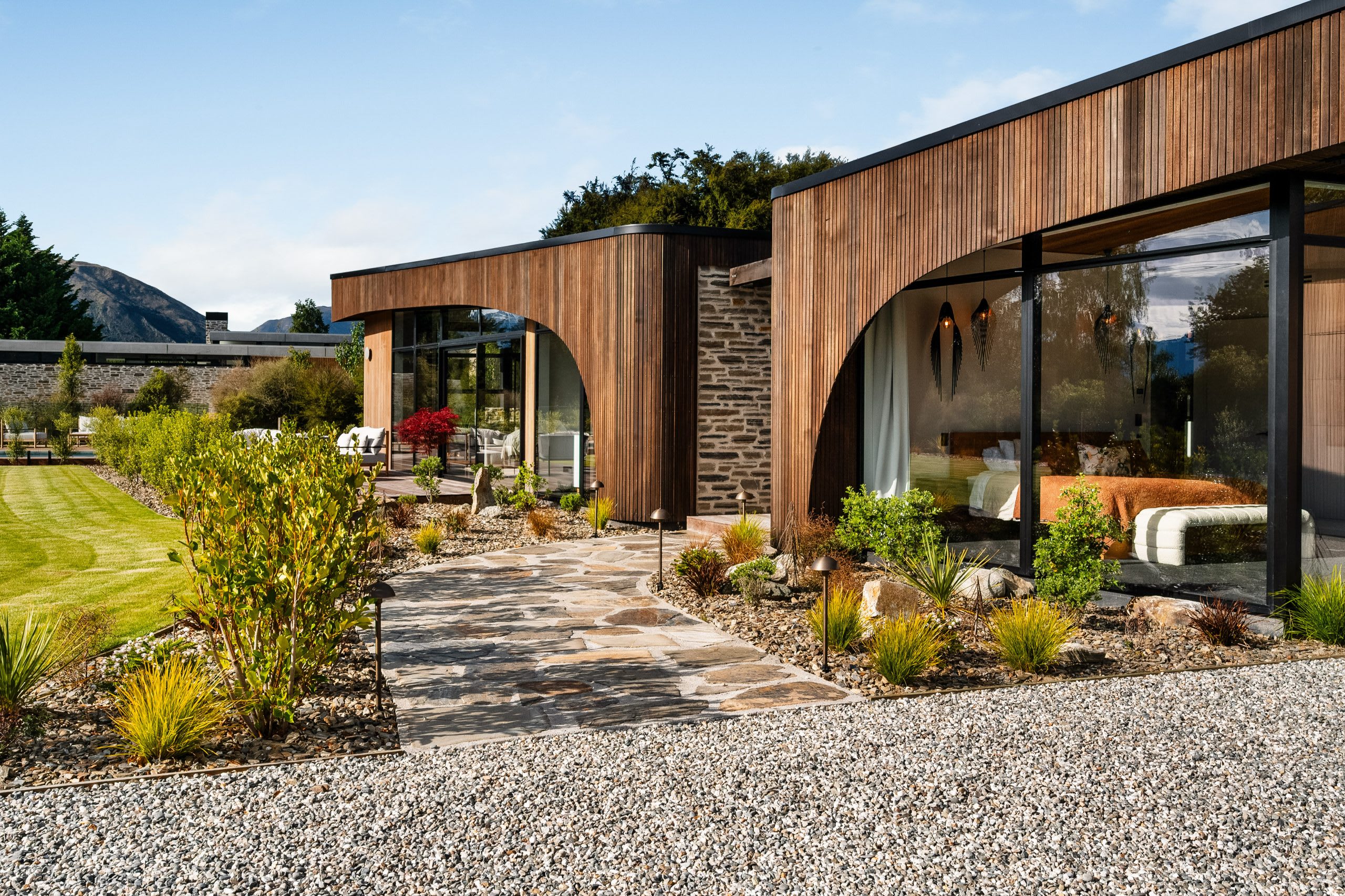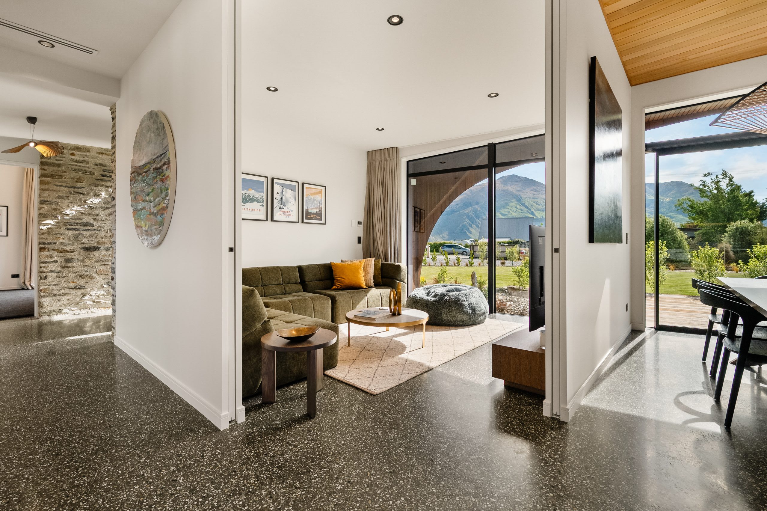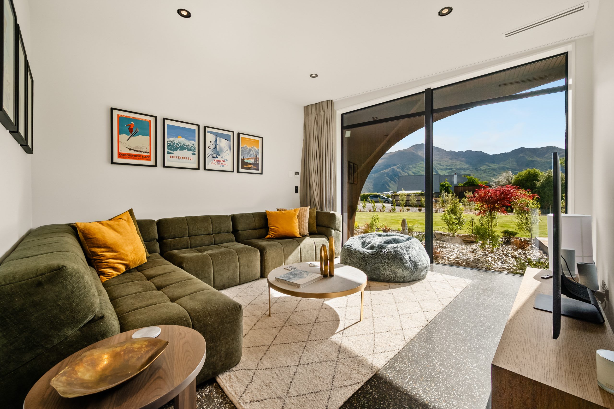 This outdoor space, softened by natural planting and layered lighting, invites year-round entertaining against the backdrop of Wanaka’s lake and mountains.