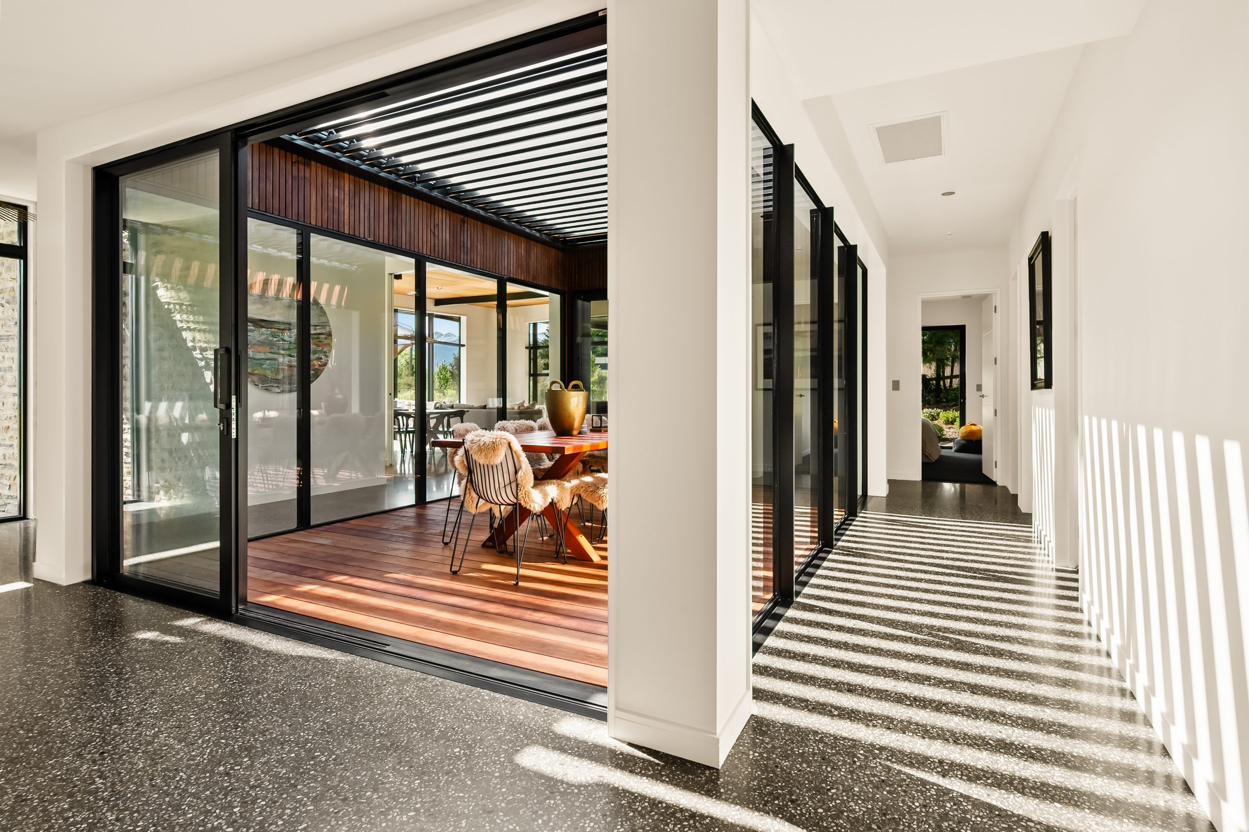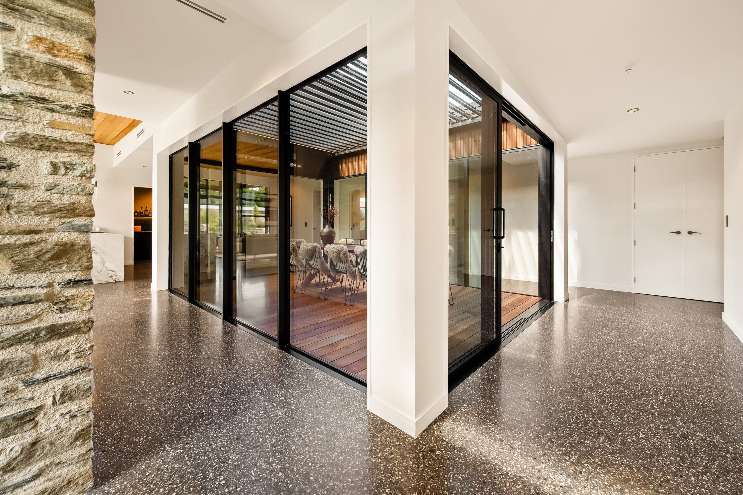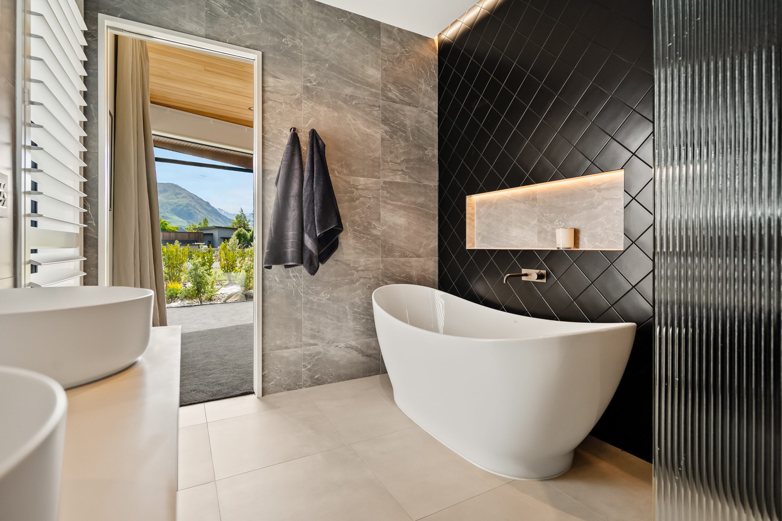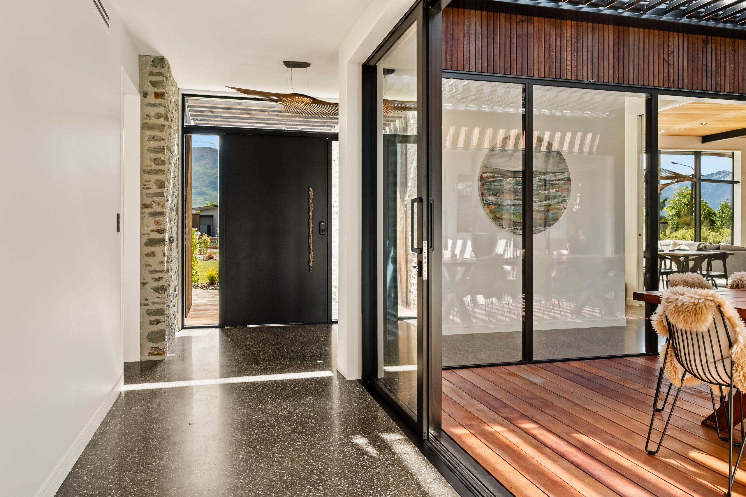 This outdoor space, softened by natural planting and layered lighting, invites year-round entertaining against the backdrop of Wanaka’s lake and mountains.