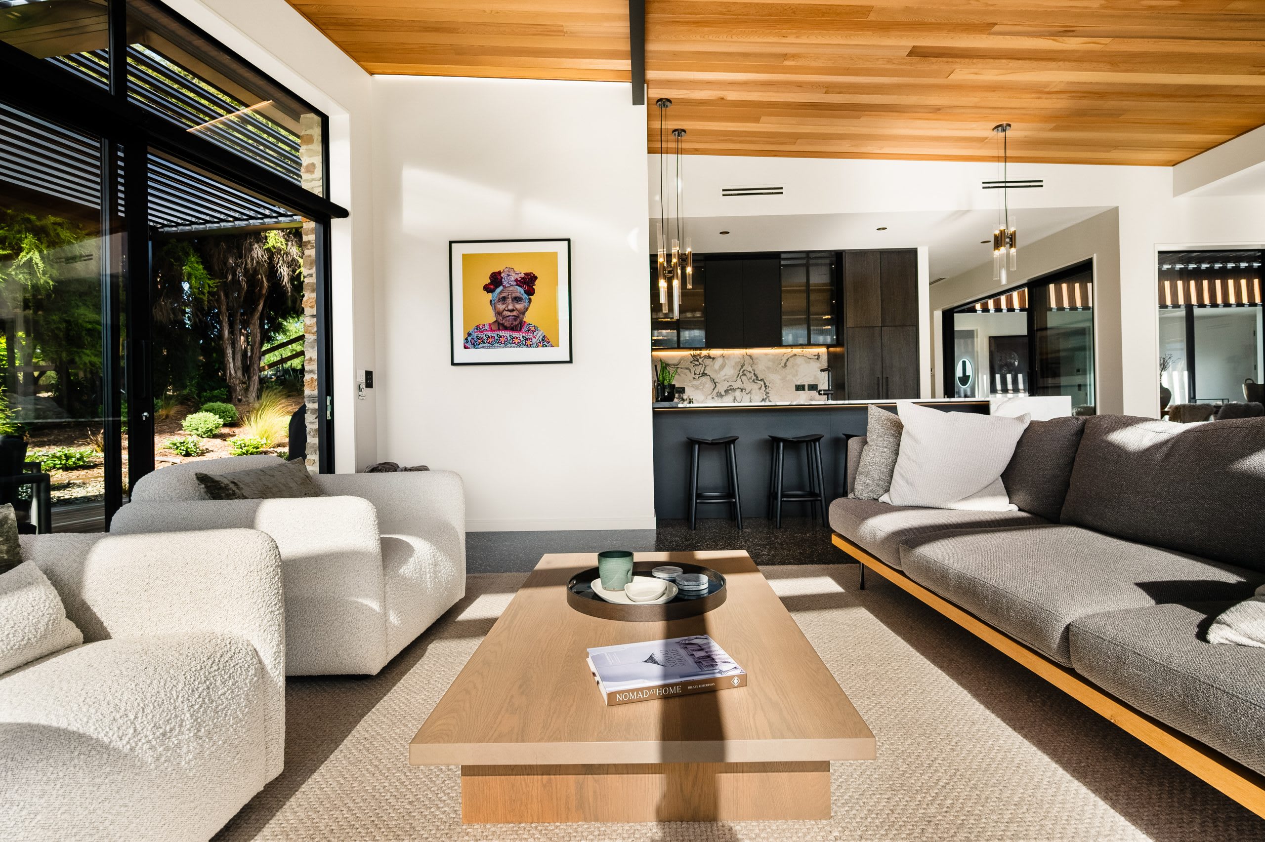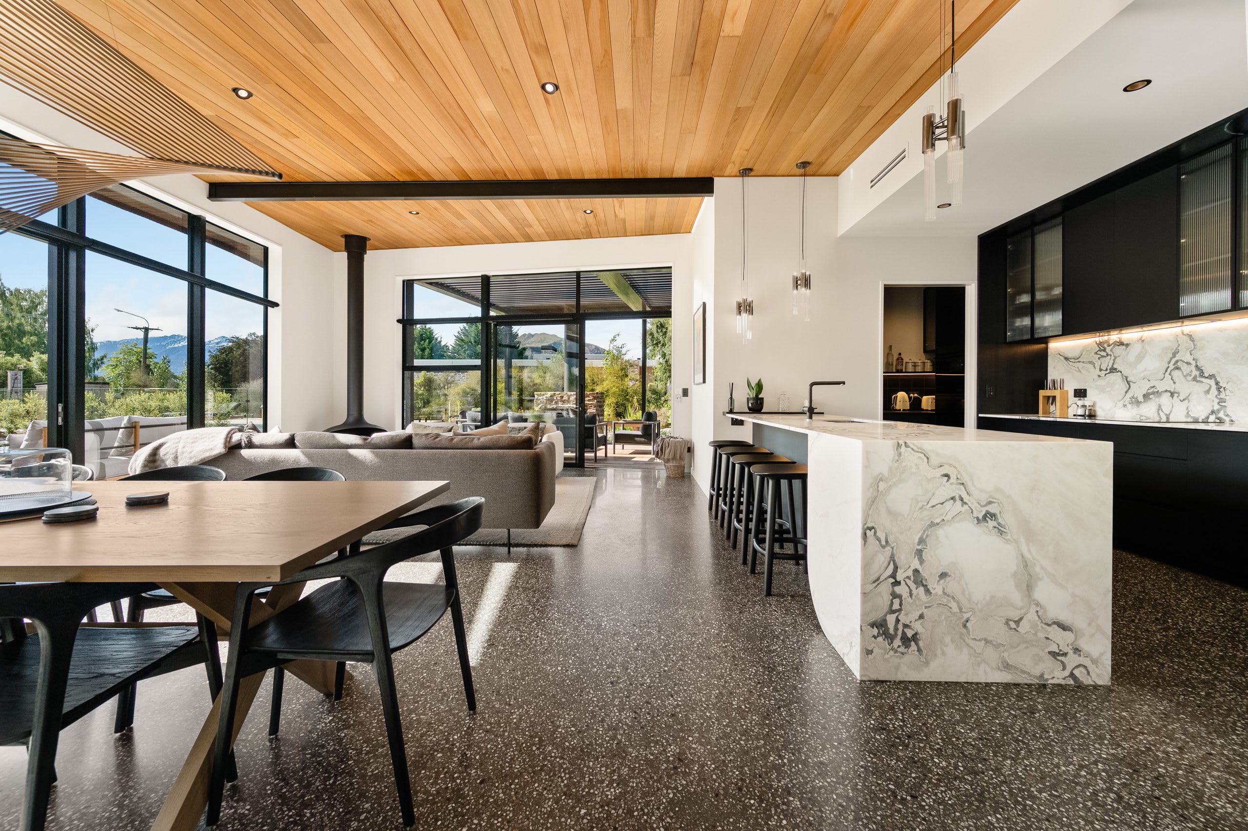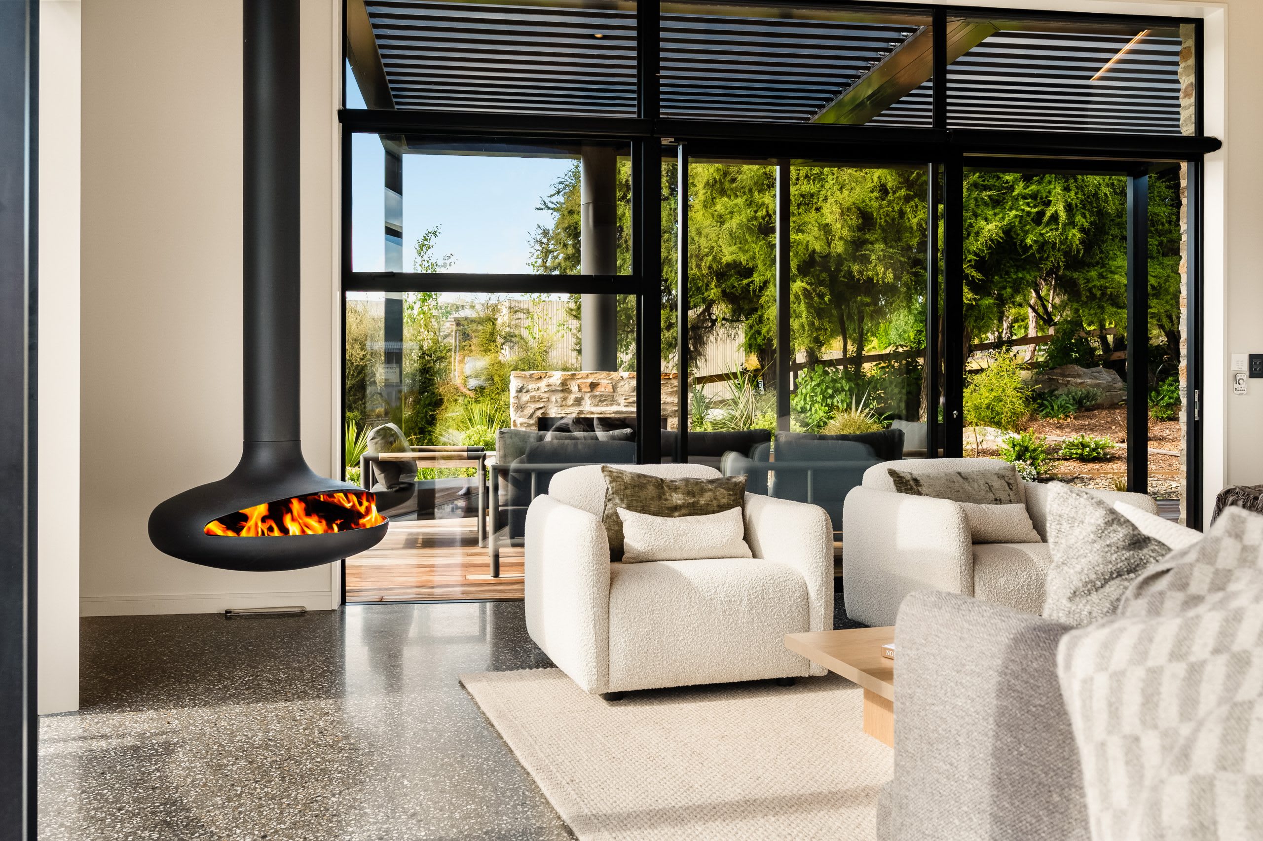 The open-plan living and dining areas are anchored by a suspended fireplace – a sculptural focal point that floats between zones, creating a natural sense of connection.