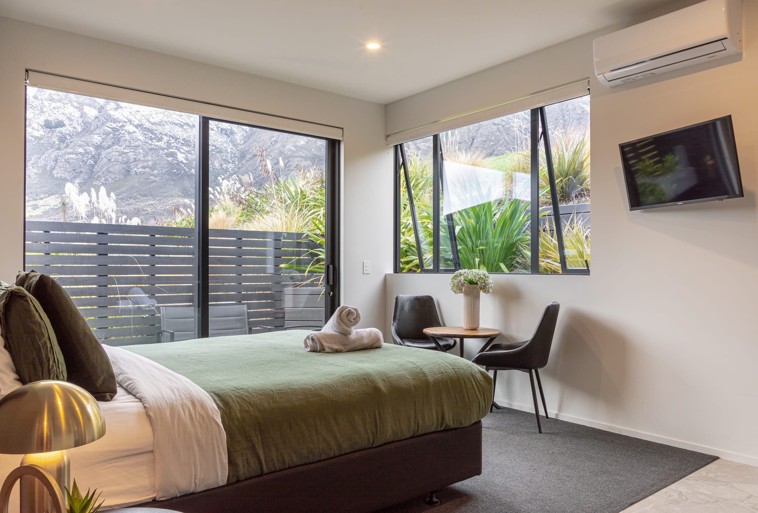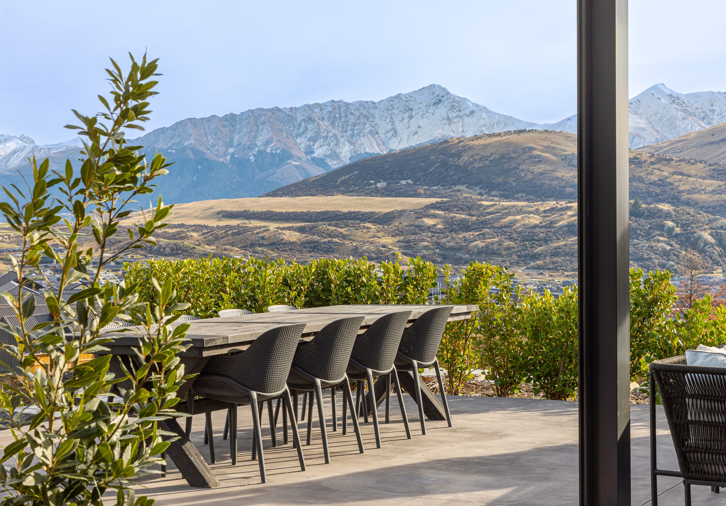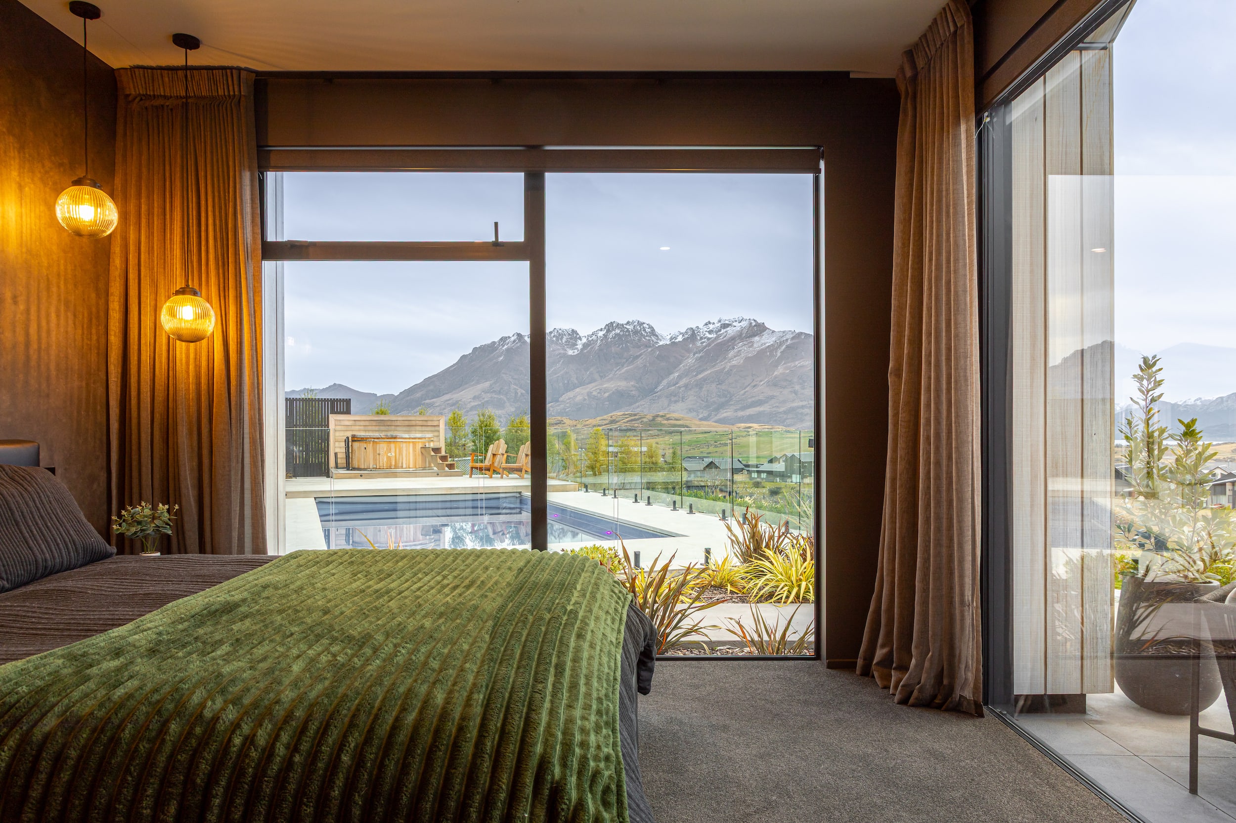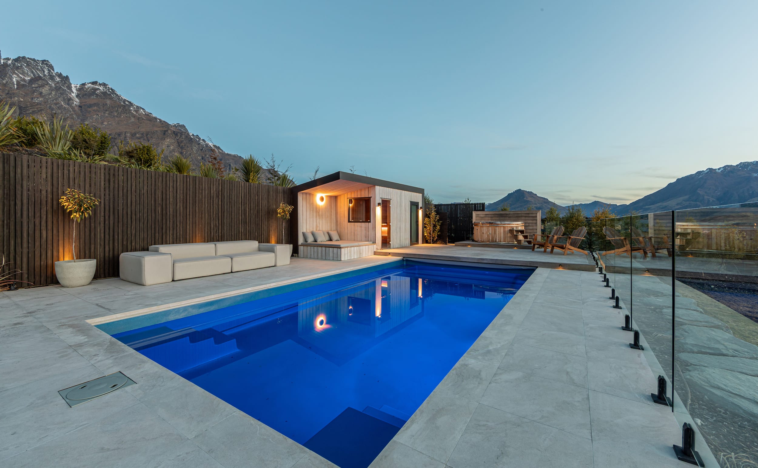 Outdoor living spaces, including a pool, spa, and sauna, extend the living environment and make full use of Queenstown’s climate.