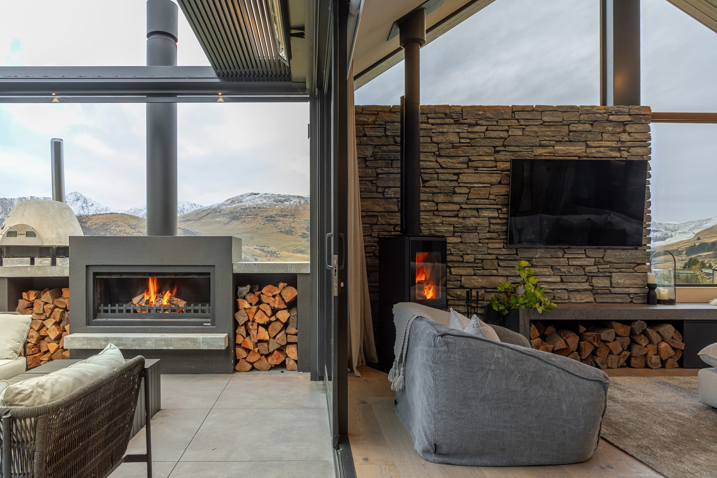 The schist-clad entry and fireplace create a strong architectural statement, while the interplay of warm timber, soft finishes, and expansive glazing introduces a sense of calm and openness.
