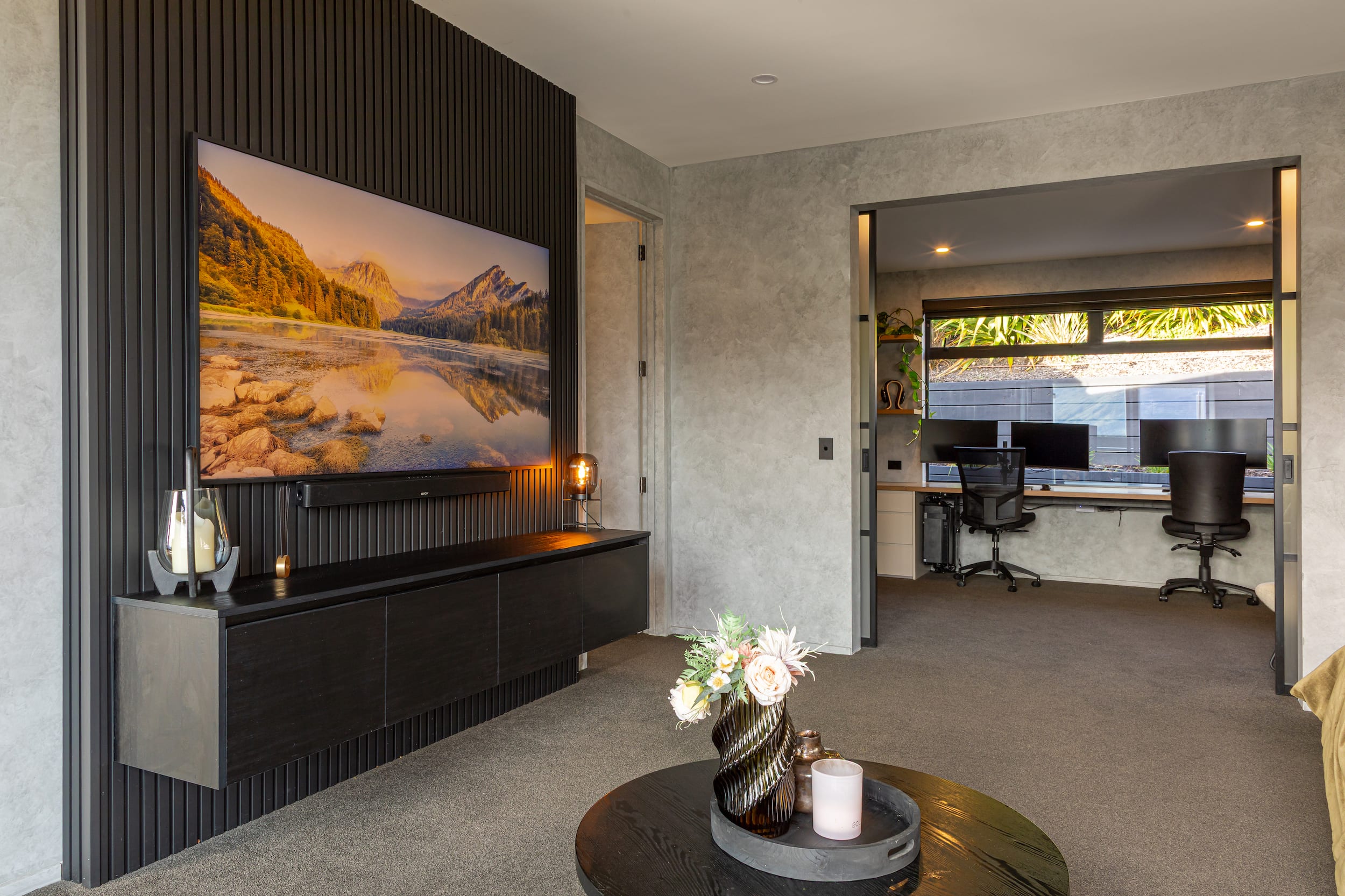 A flexible master suite provides retreat for the homeowners, incorporating its own lounge and office to accommodate working from home.