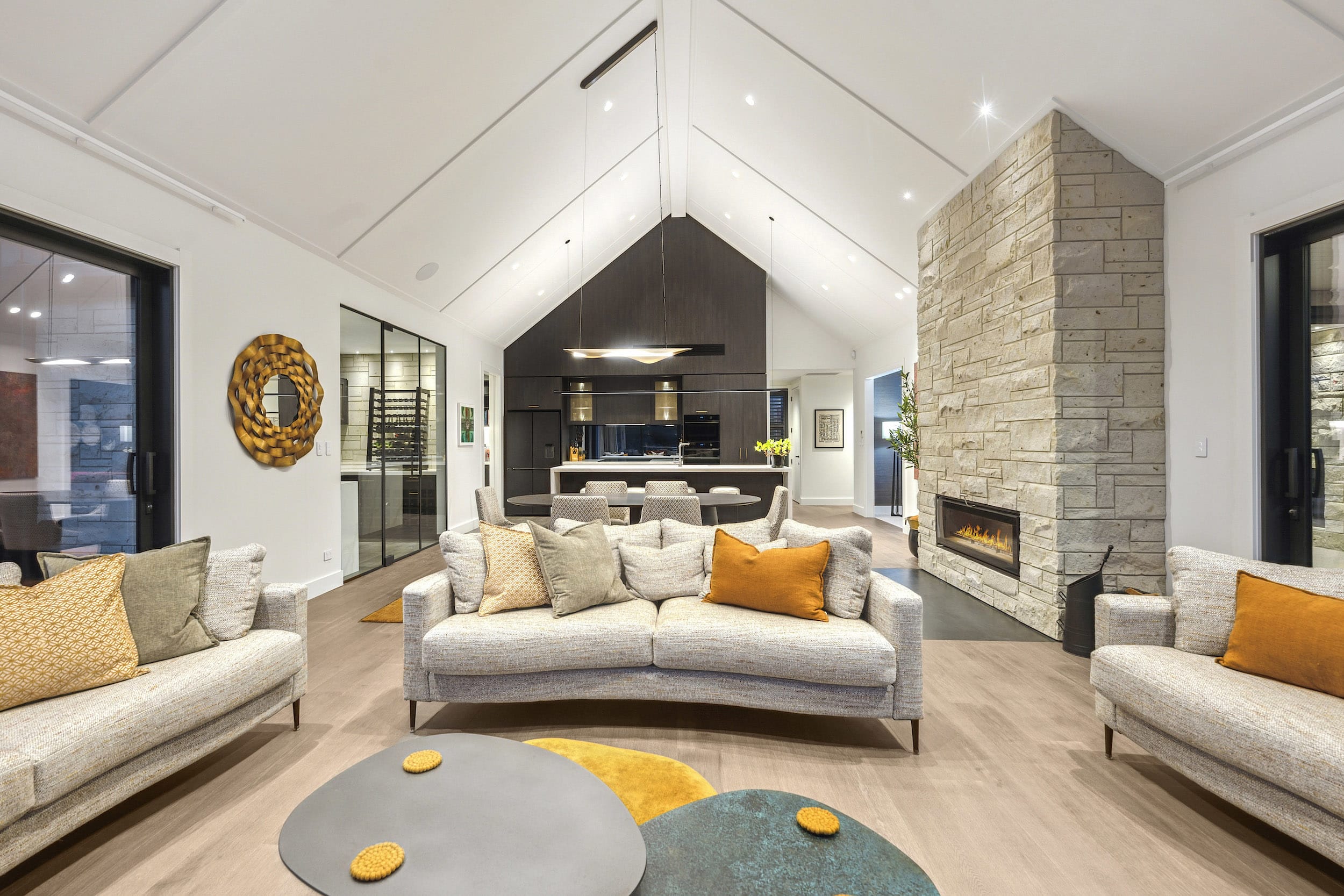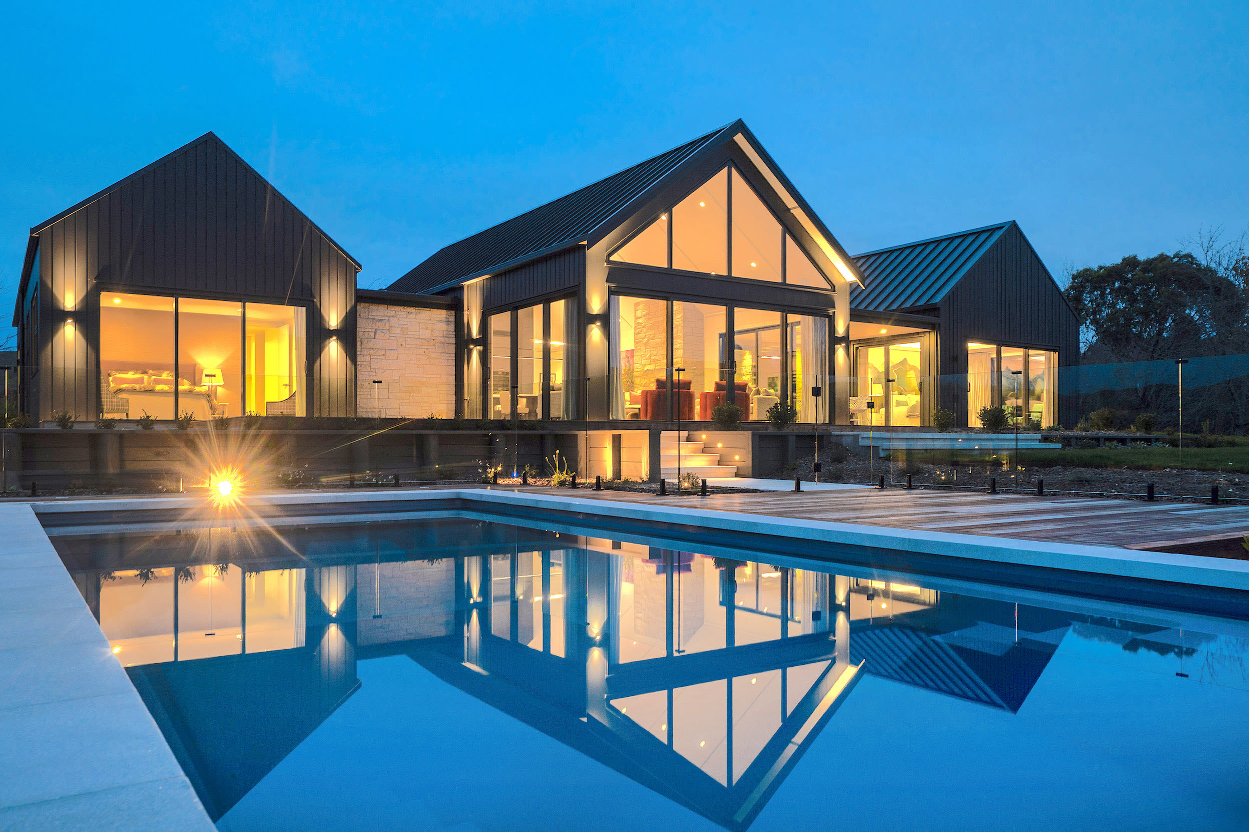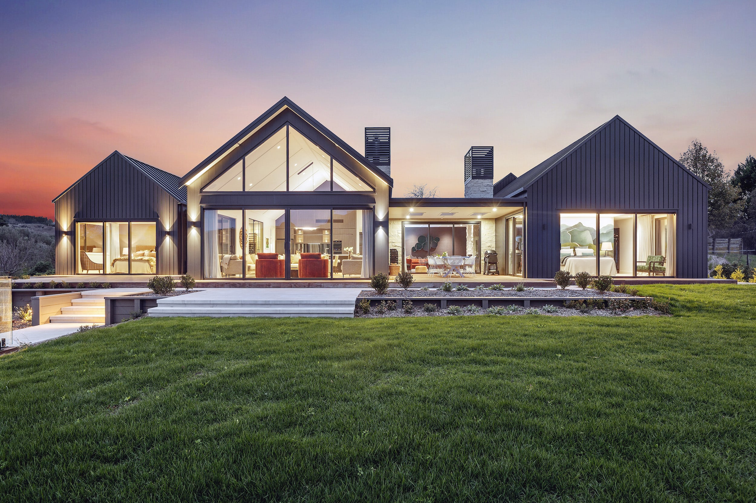 Steep gable rooflines, vaulted ceilings, and a 3m stud in the main living area add scale and light.