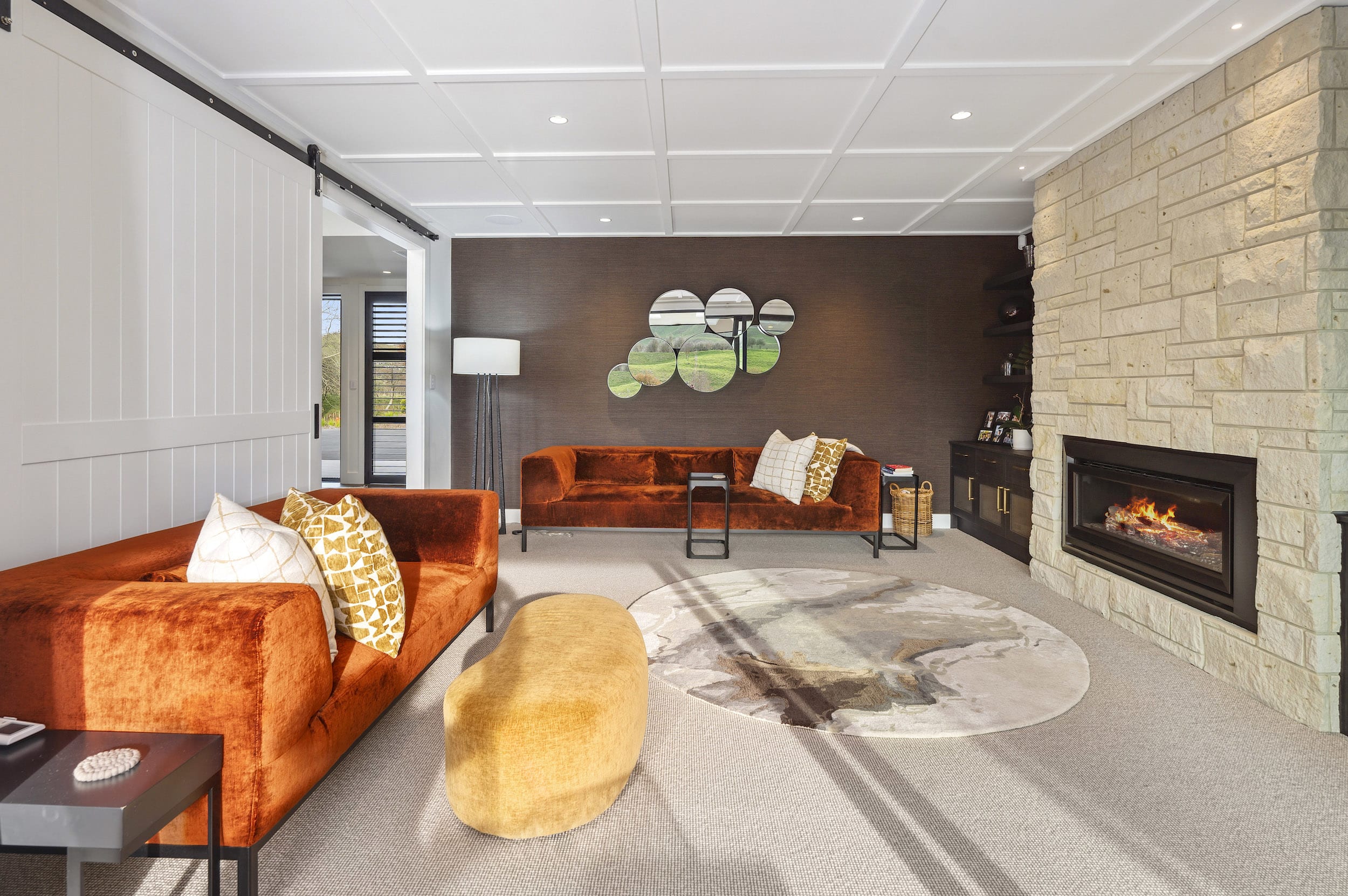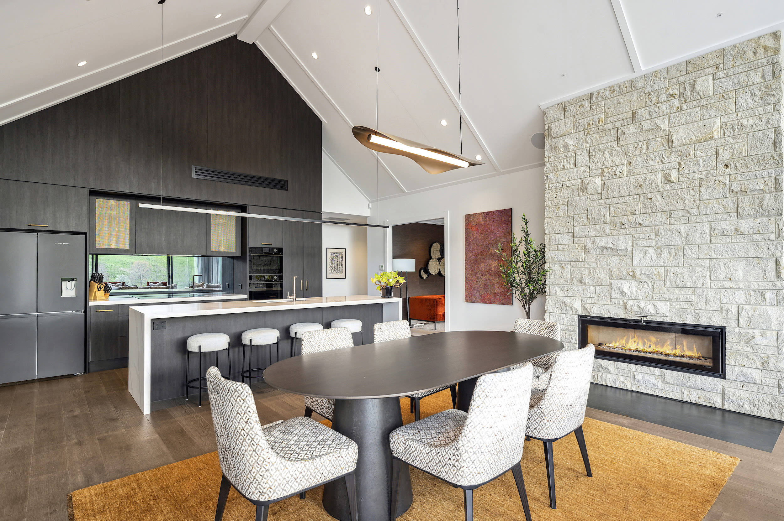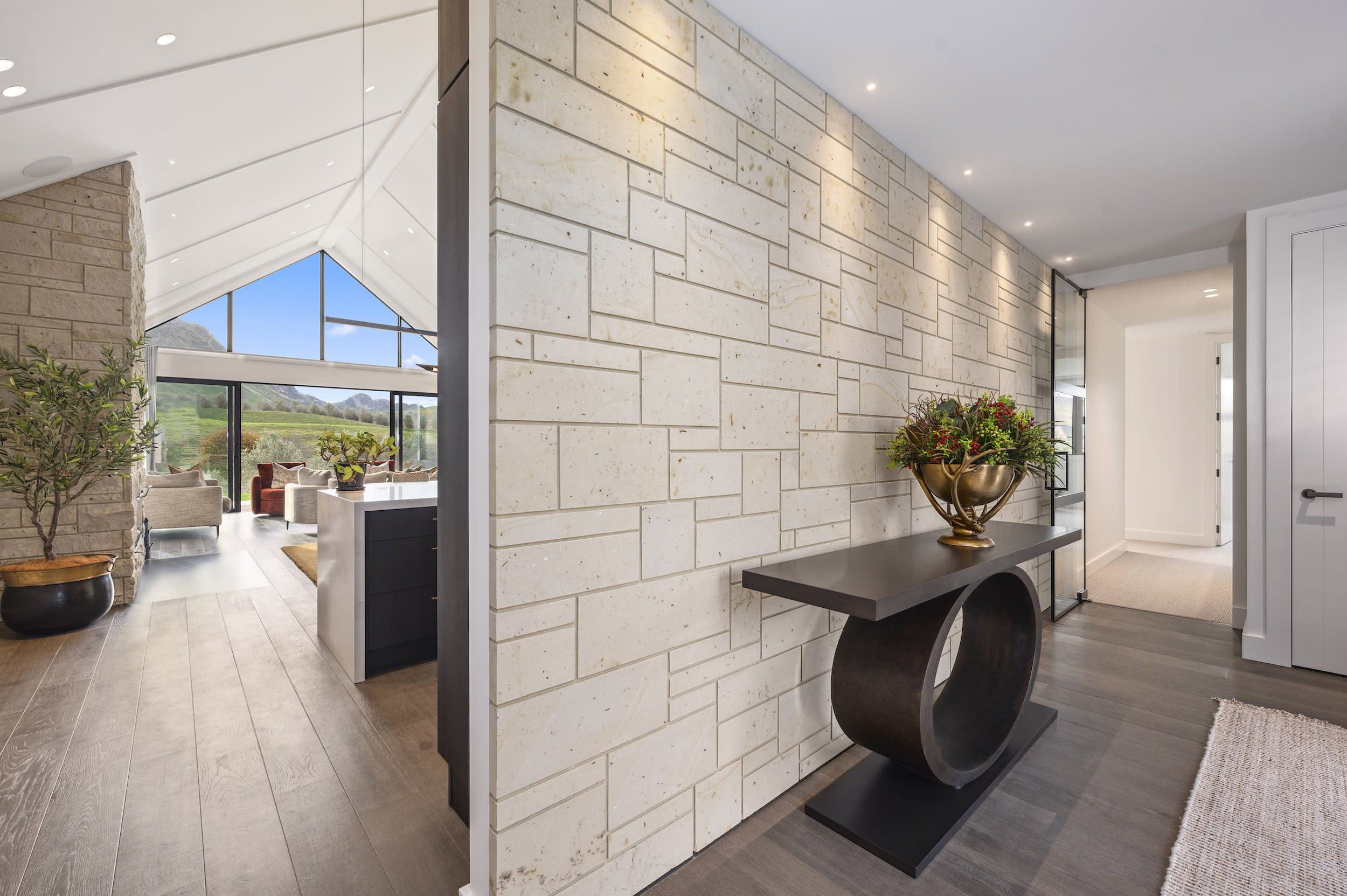 Hinuera stone cladding connects the home to its rural surrounds and reappears as interior features.