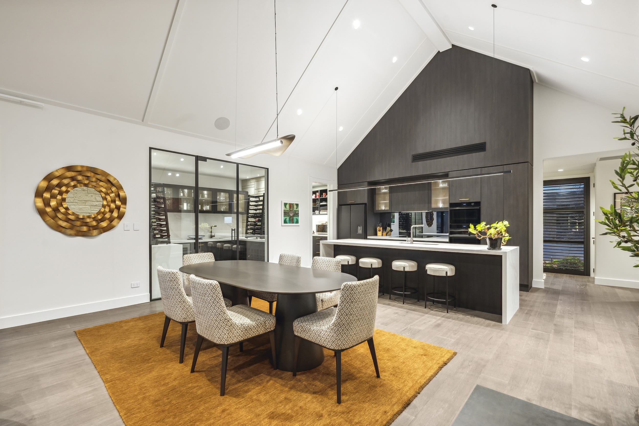 Standout details include gold mesh cabinetry and a temperature-controlled wine cellar that nods to one owner’s wine industry background.