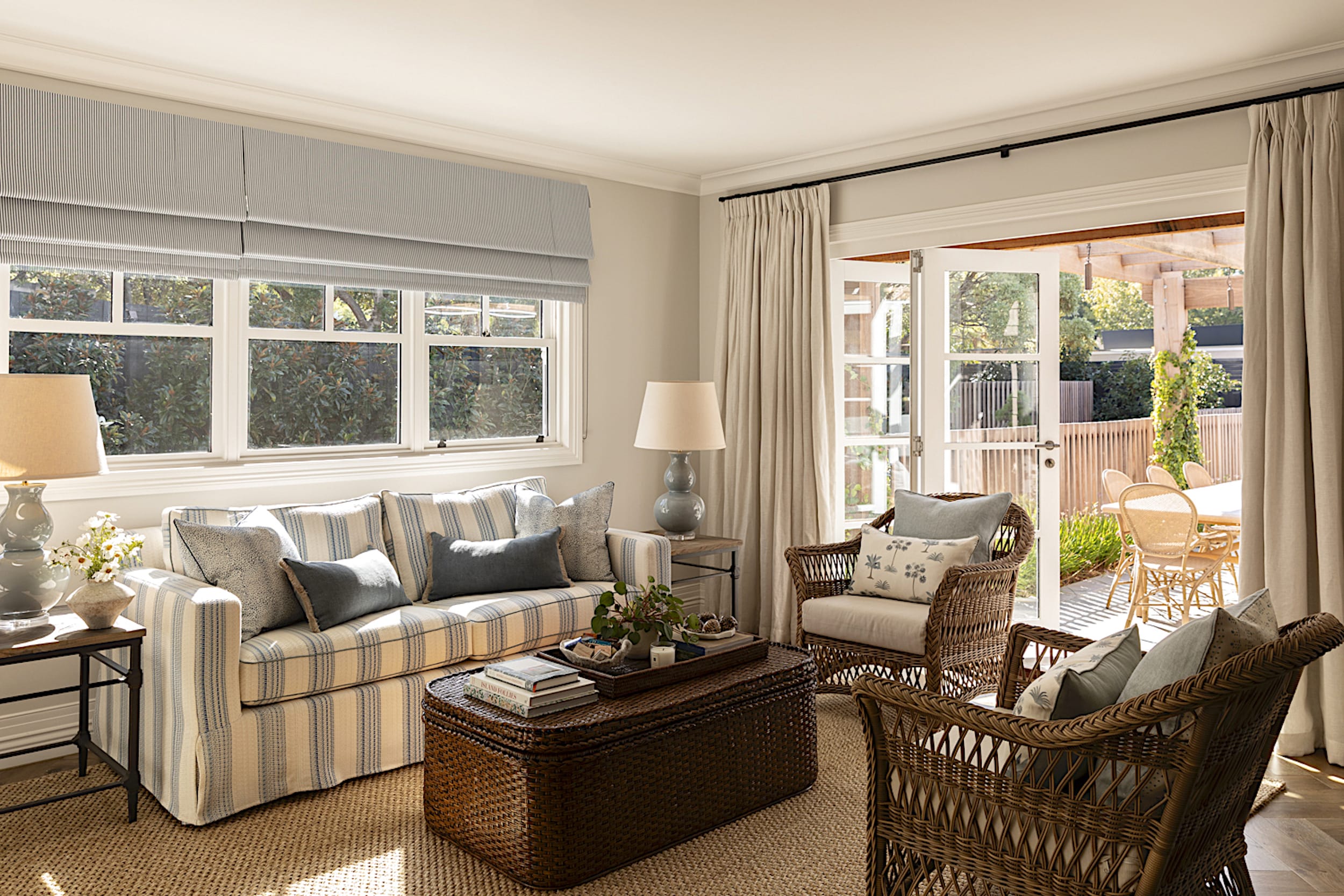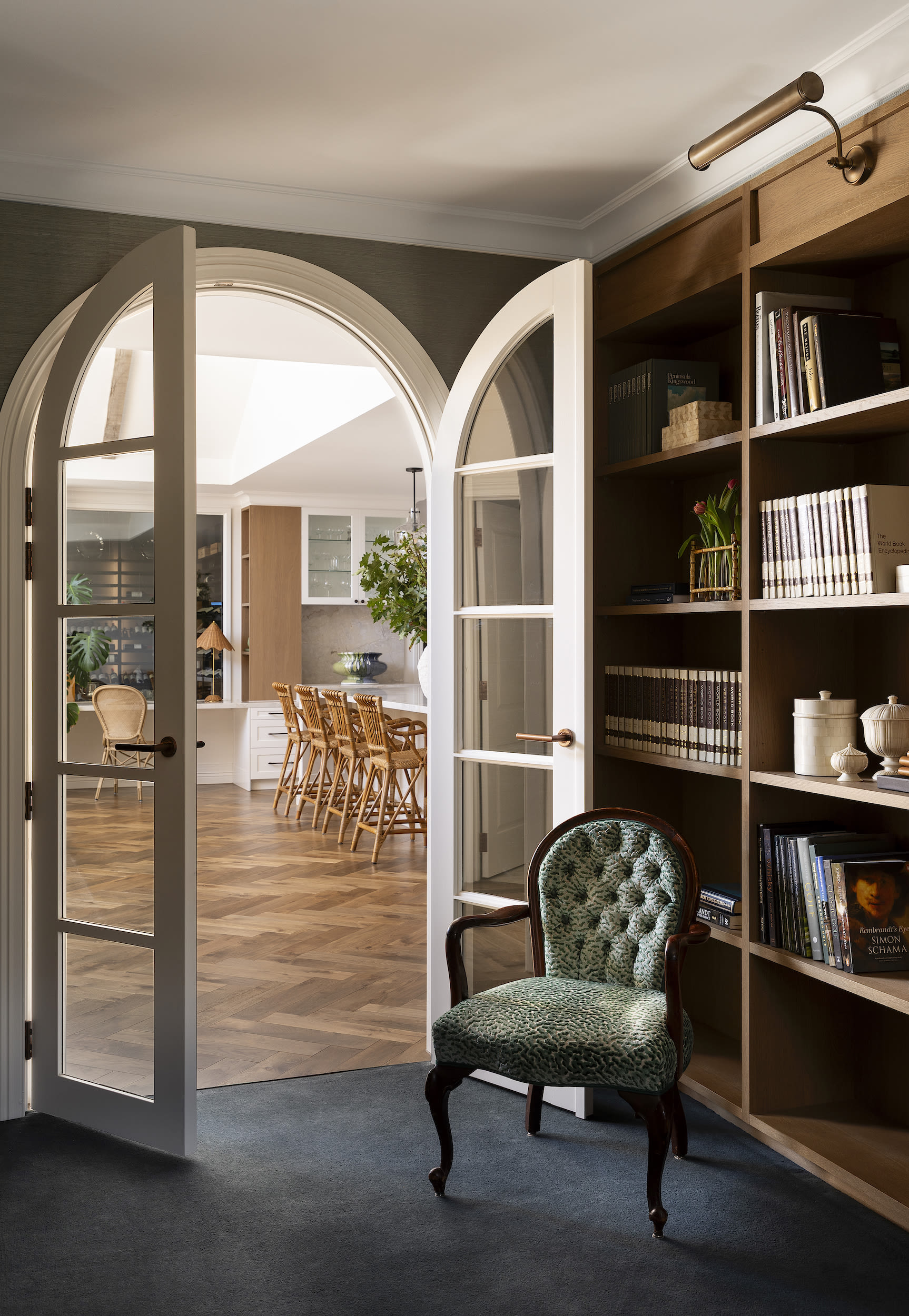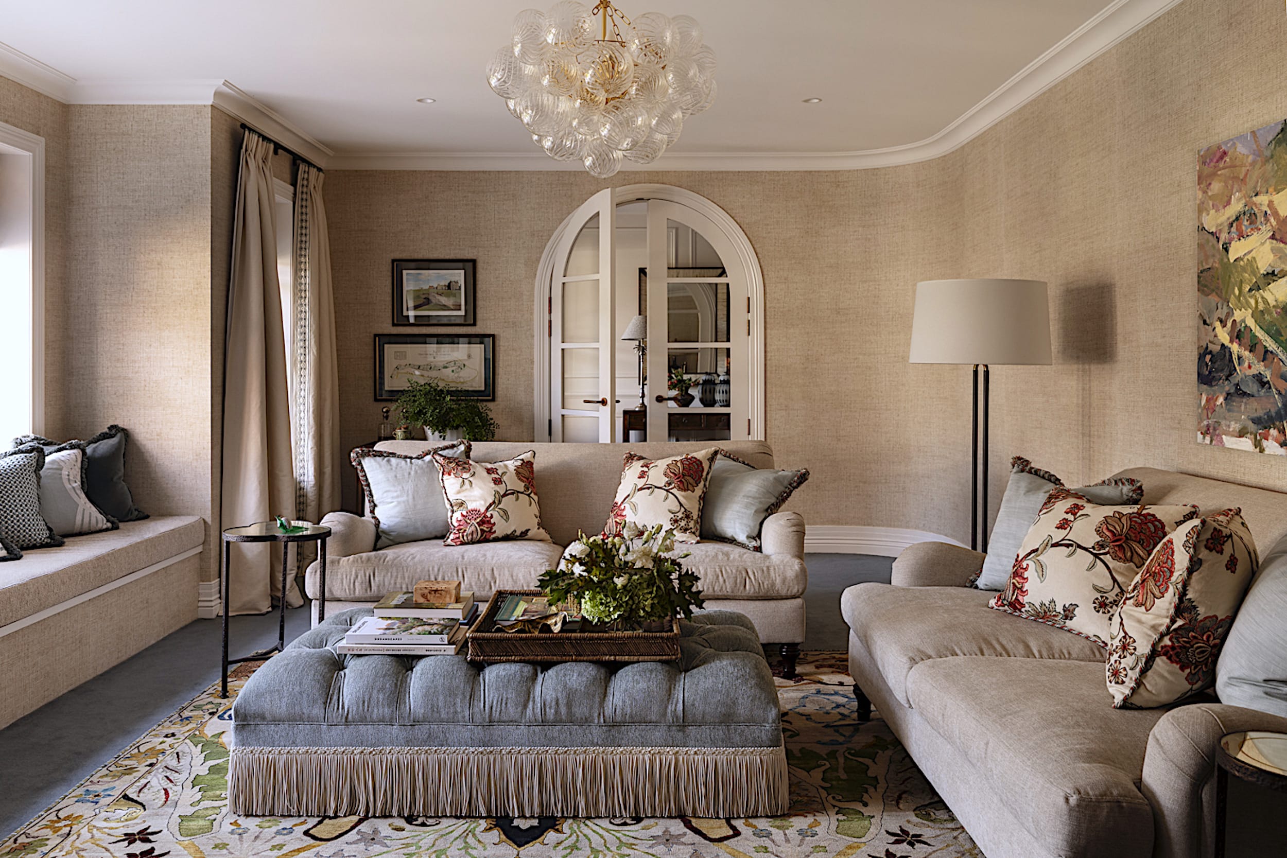 Feature lightingEntry – Aerin for Visual Comfort, from Bloomingdales Lighting; formal sitting room – Julie Neill for Visual Comfort, from Bloomingdales Lighting; kitchen – custom lighting | Living area furnitureHomeowners' existing sofa, recovered in fabric from The Textile Company; custom-made cushions; armchairs from Lincoln Brooks with custom-made cushions; owners' existing coffee table from Pottery Barn |