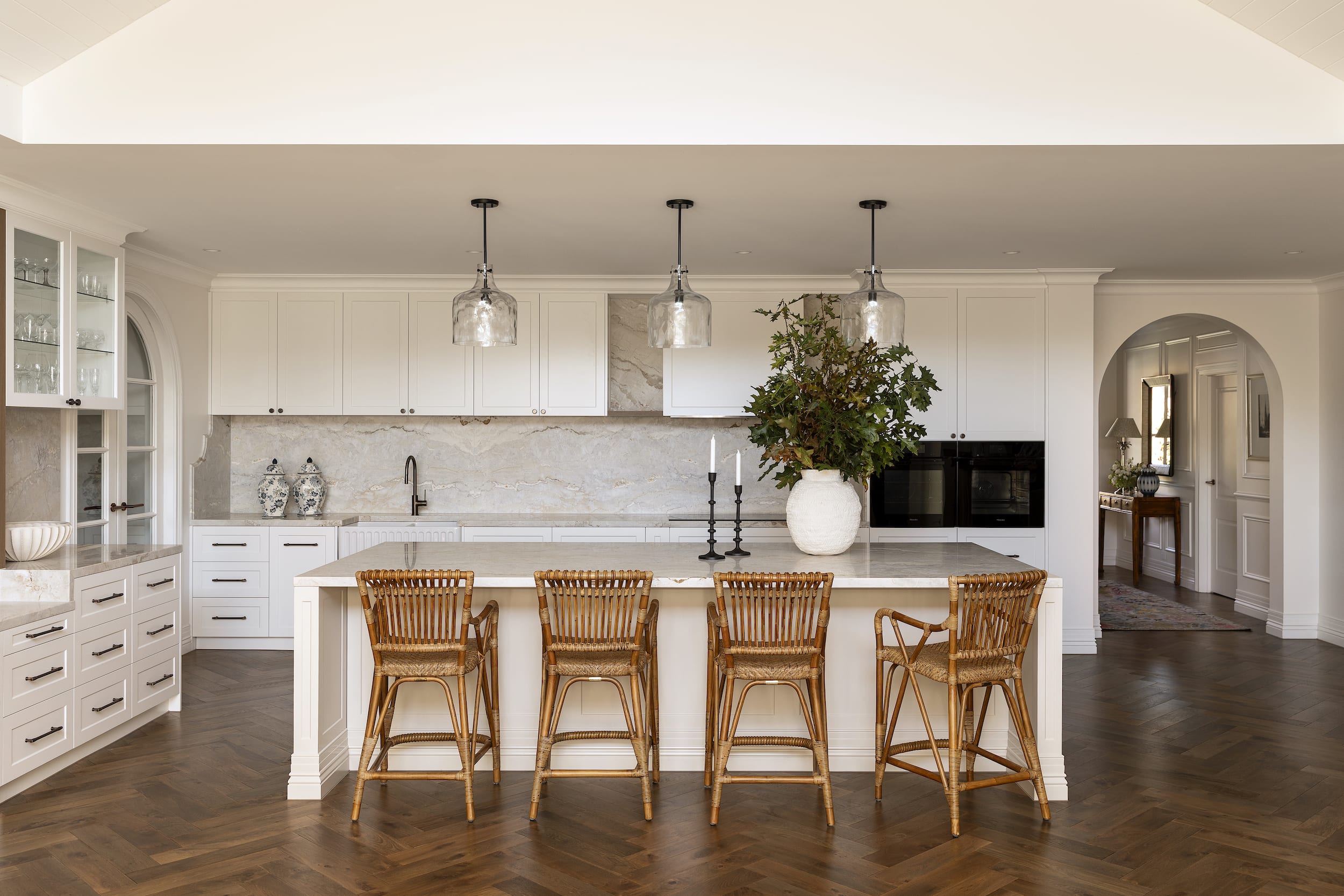 The kitchen, with its dramatic central-raked ceiling, now benefits from a separate butler’s kitchen that is almost the same scale as the kitchen itself, a wide island bench for family and friends to gather, as well as a glass-fronted wine cellar that’s integral to the design.