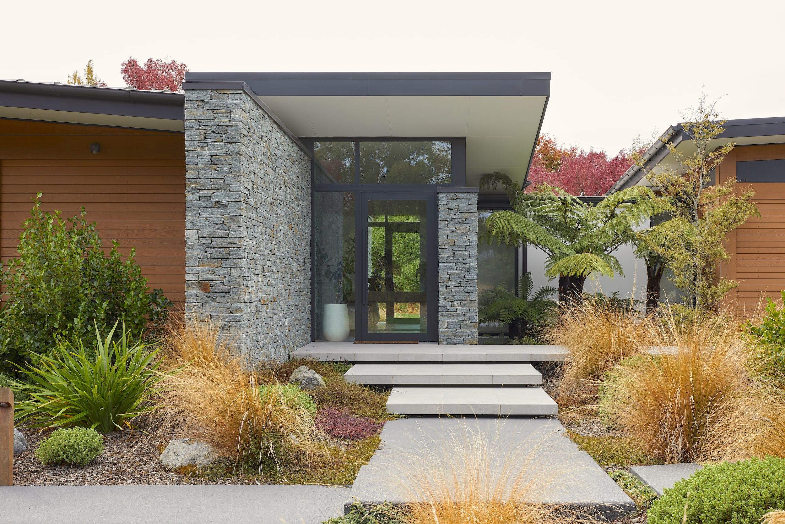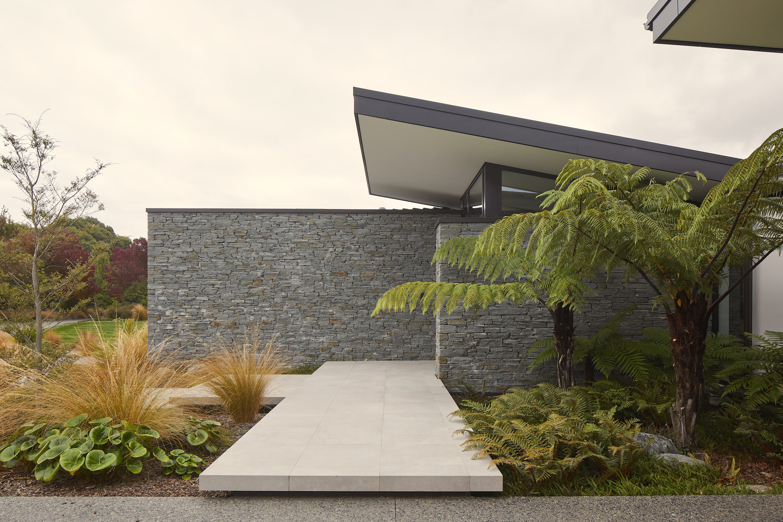 Four gabled wings separate areas of use in this home, while providing shelter for an outdoor lounge – stone, metal and timber cladding connects with the rugged landscape