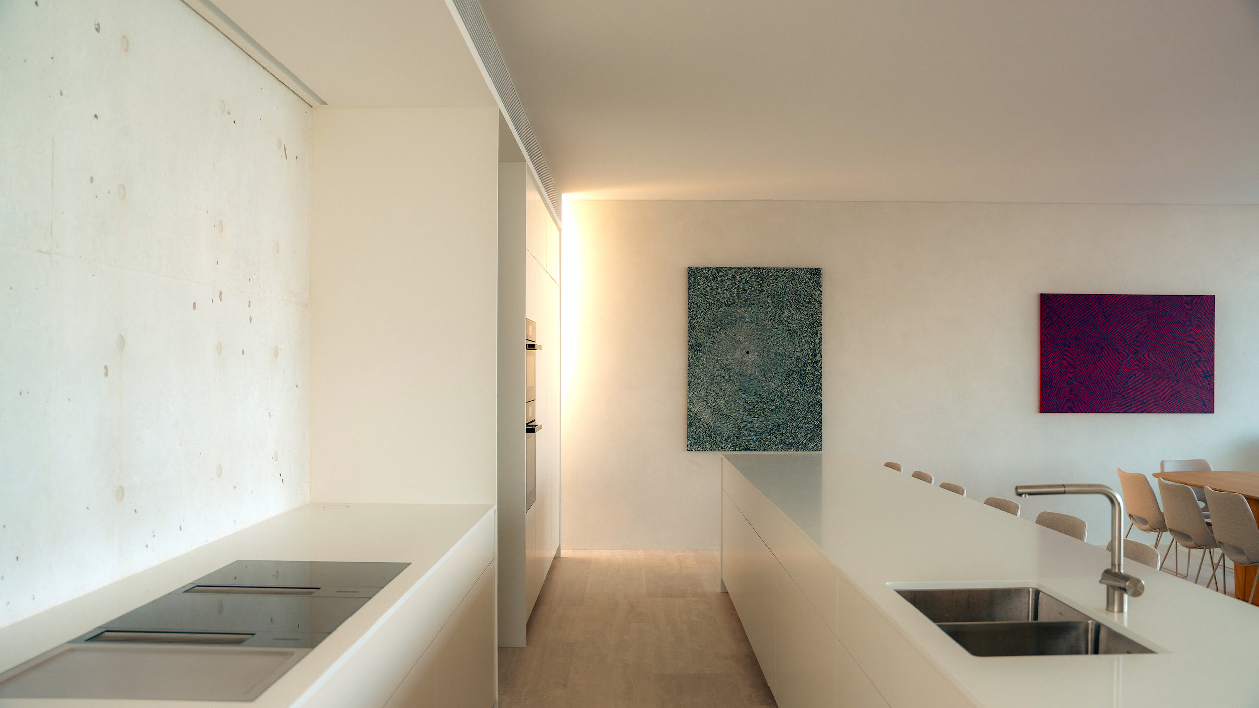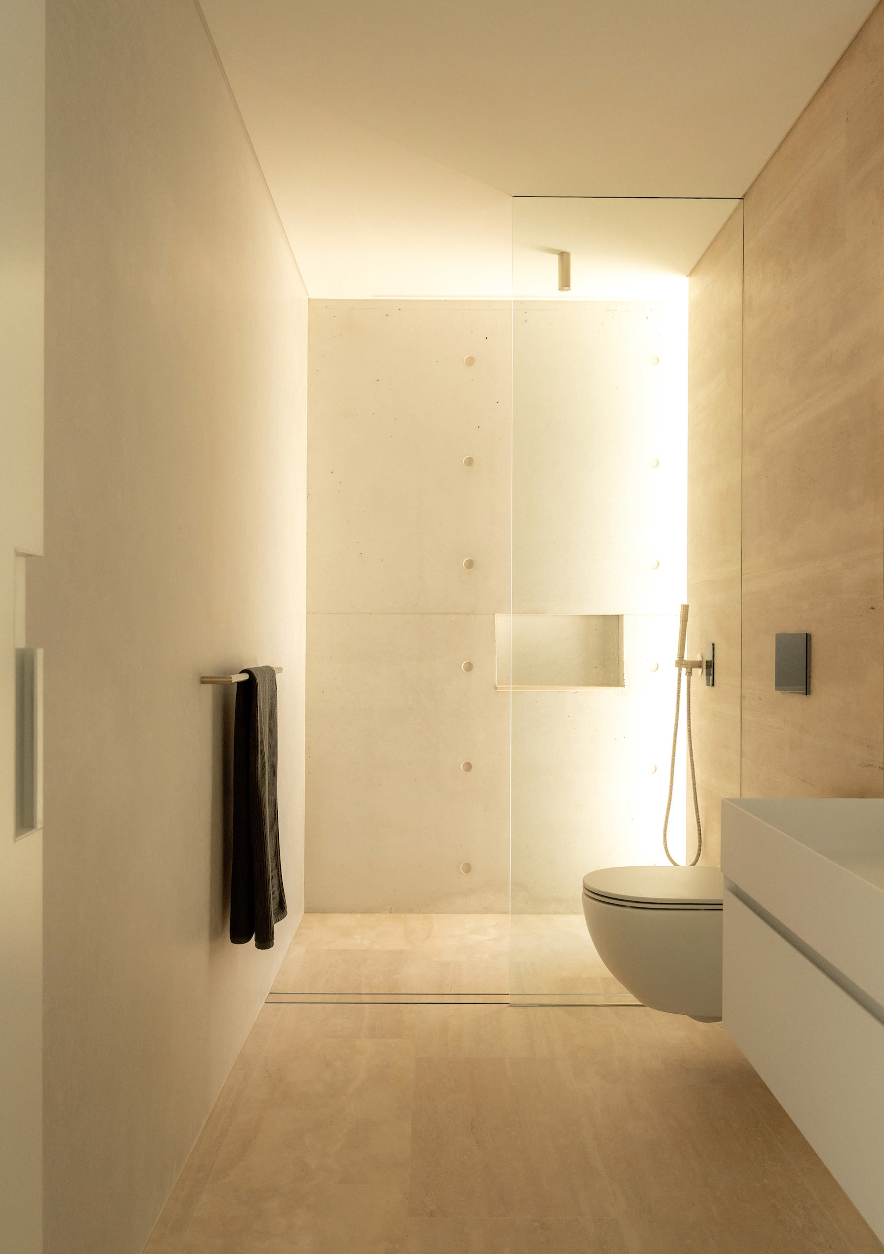 Internally, neutral travertine stone flooring and blonde oak joinery complement the subtle off-white concrete, creating a serene and atmospheric interior that responds beautifully to changing natural light.