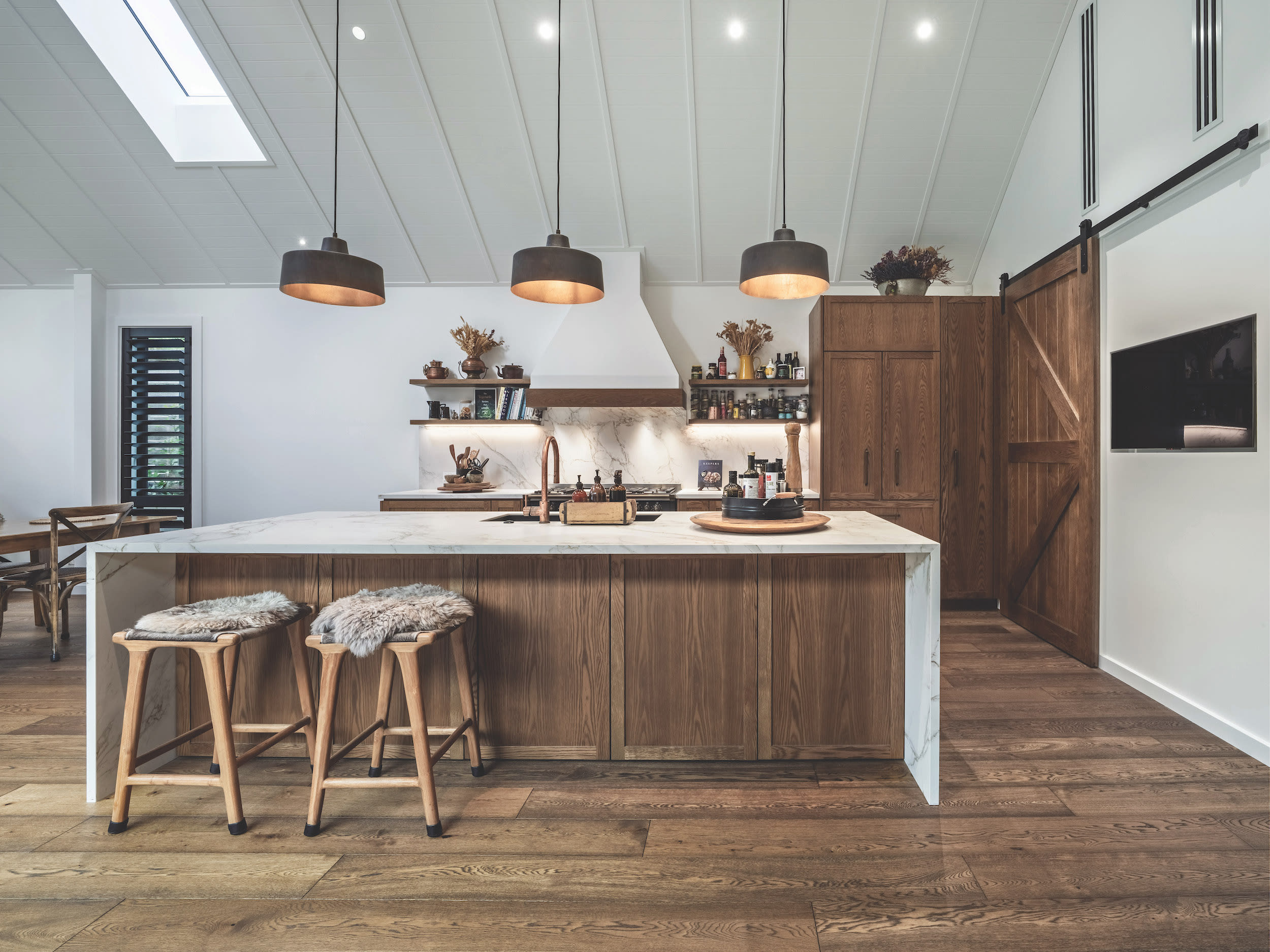 The material palette is simple and elegant, combining timber and stone elements to create a natural-look aesthetic that won’t date.