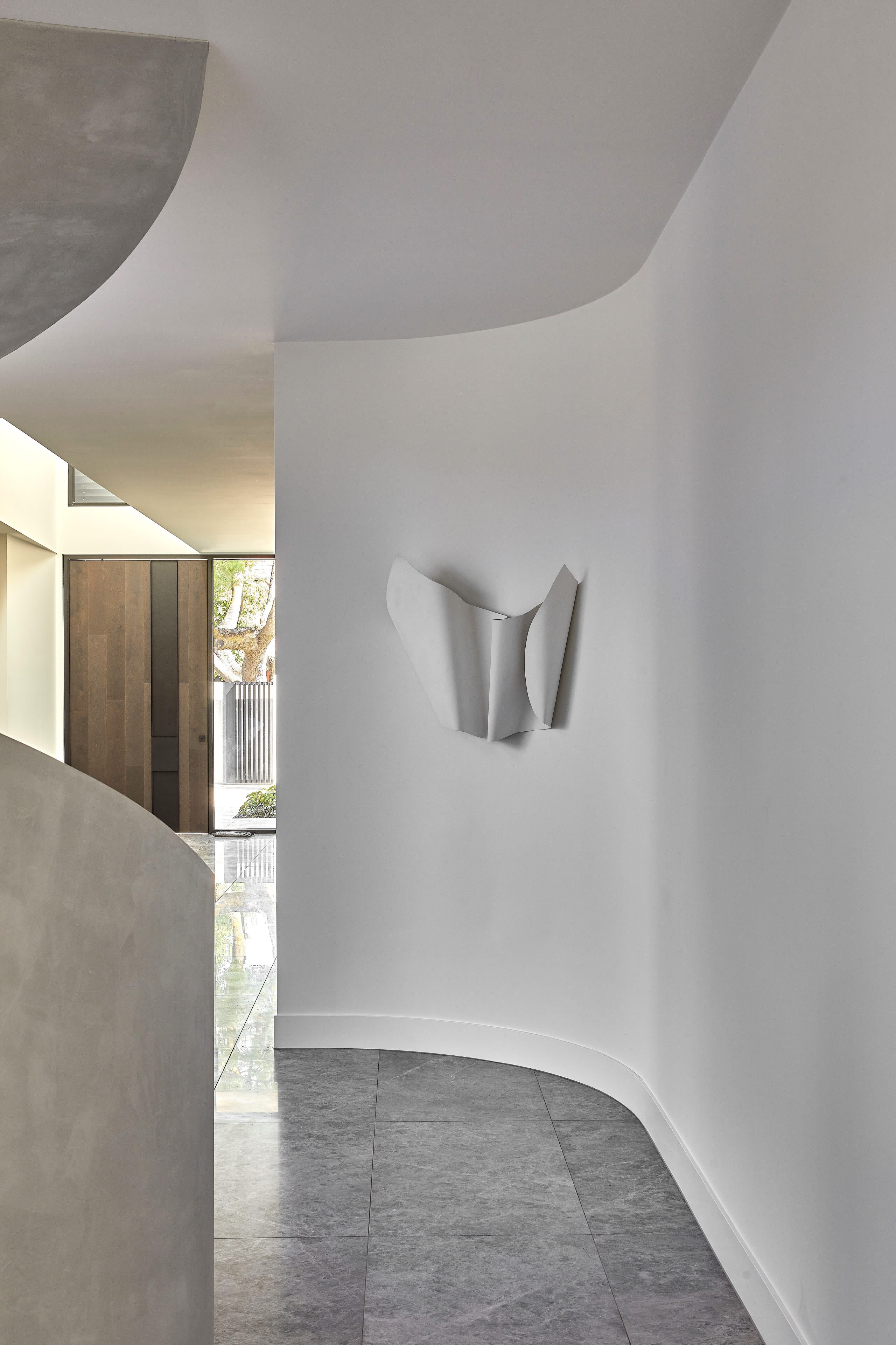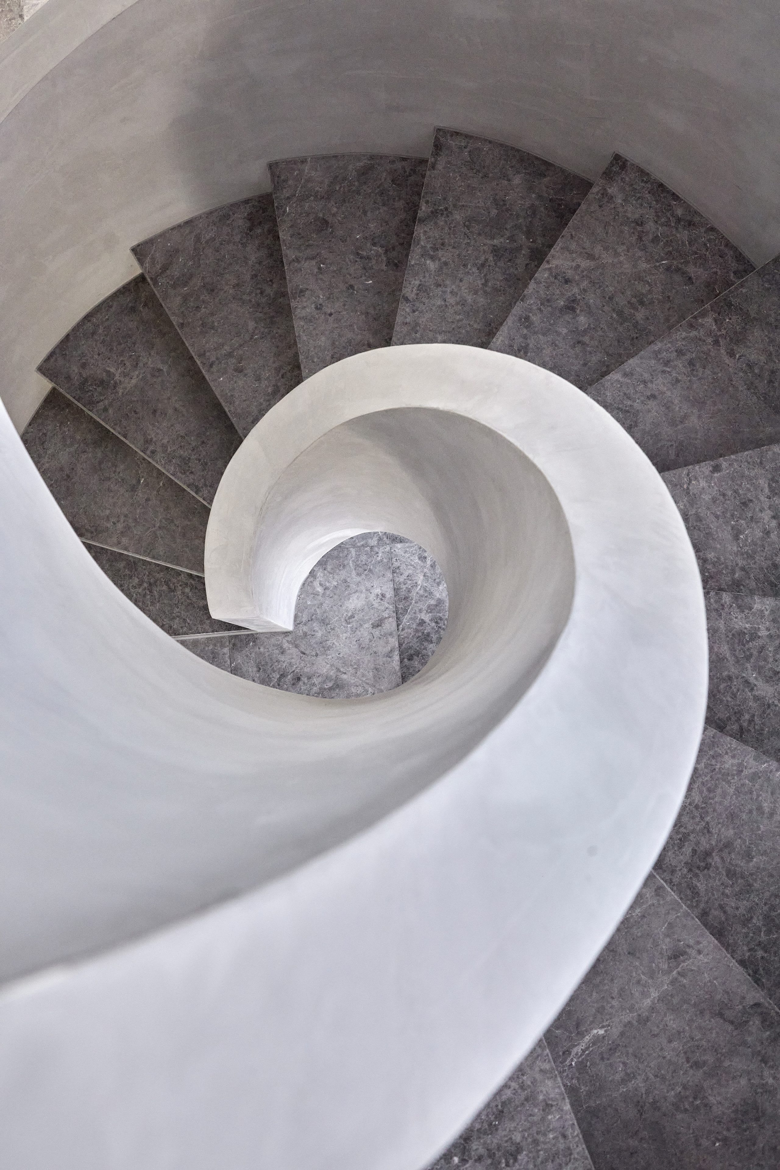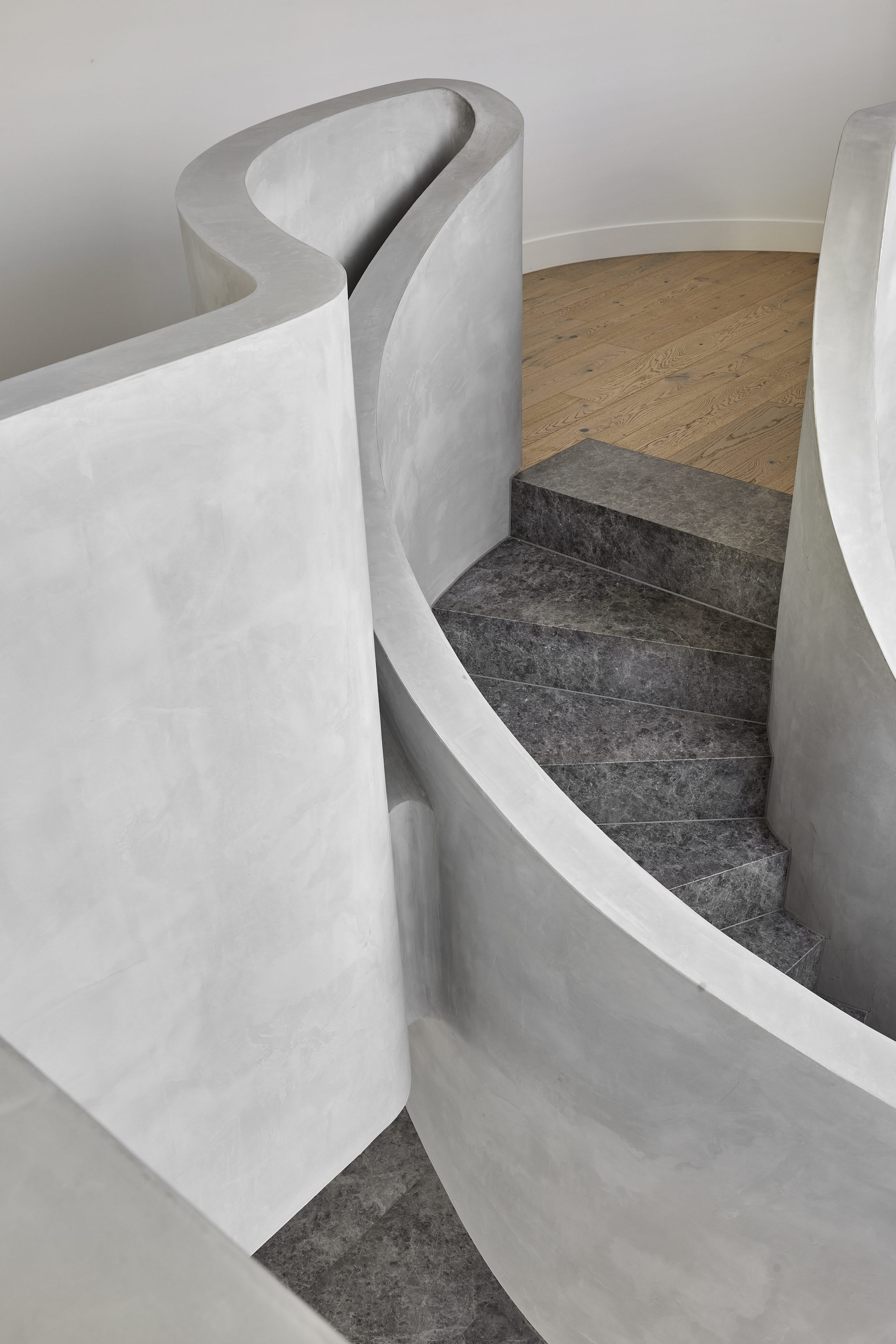 The closely considered insertions within the expansive spatial volume – such as the sculptural staircase – define a travel path through the interior and also act as spatial dividers, and focal & meeting points.