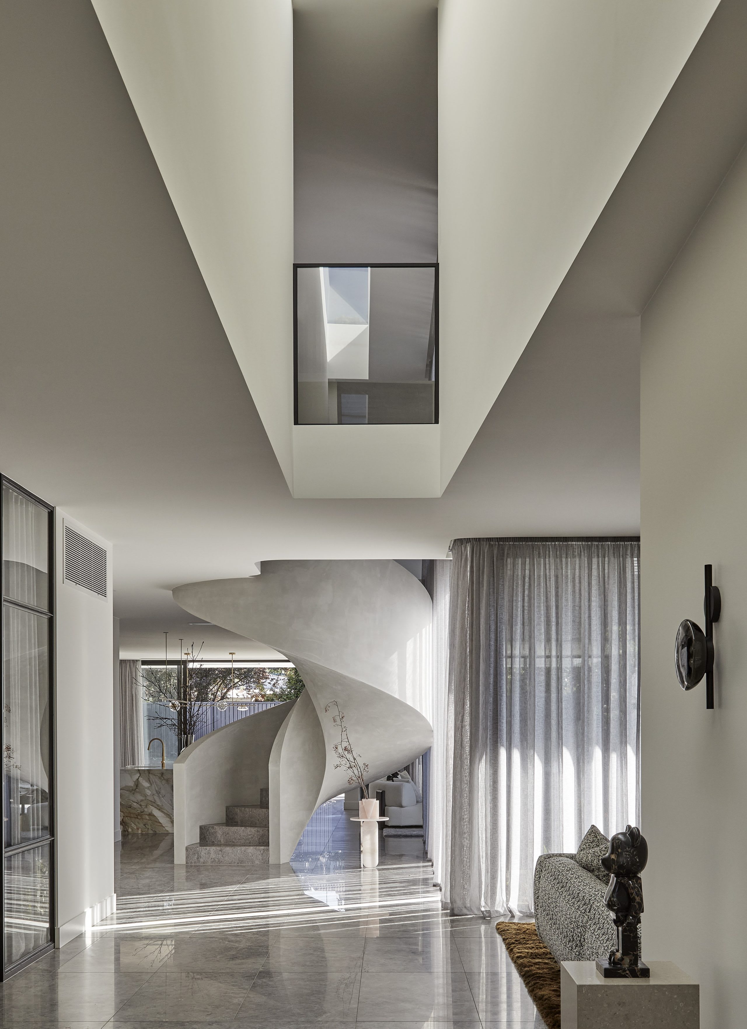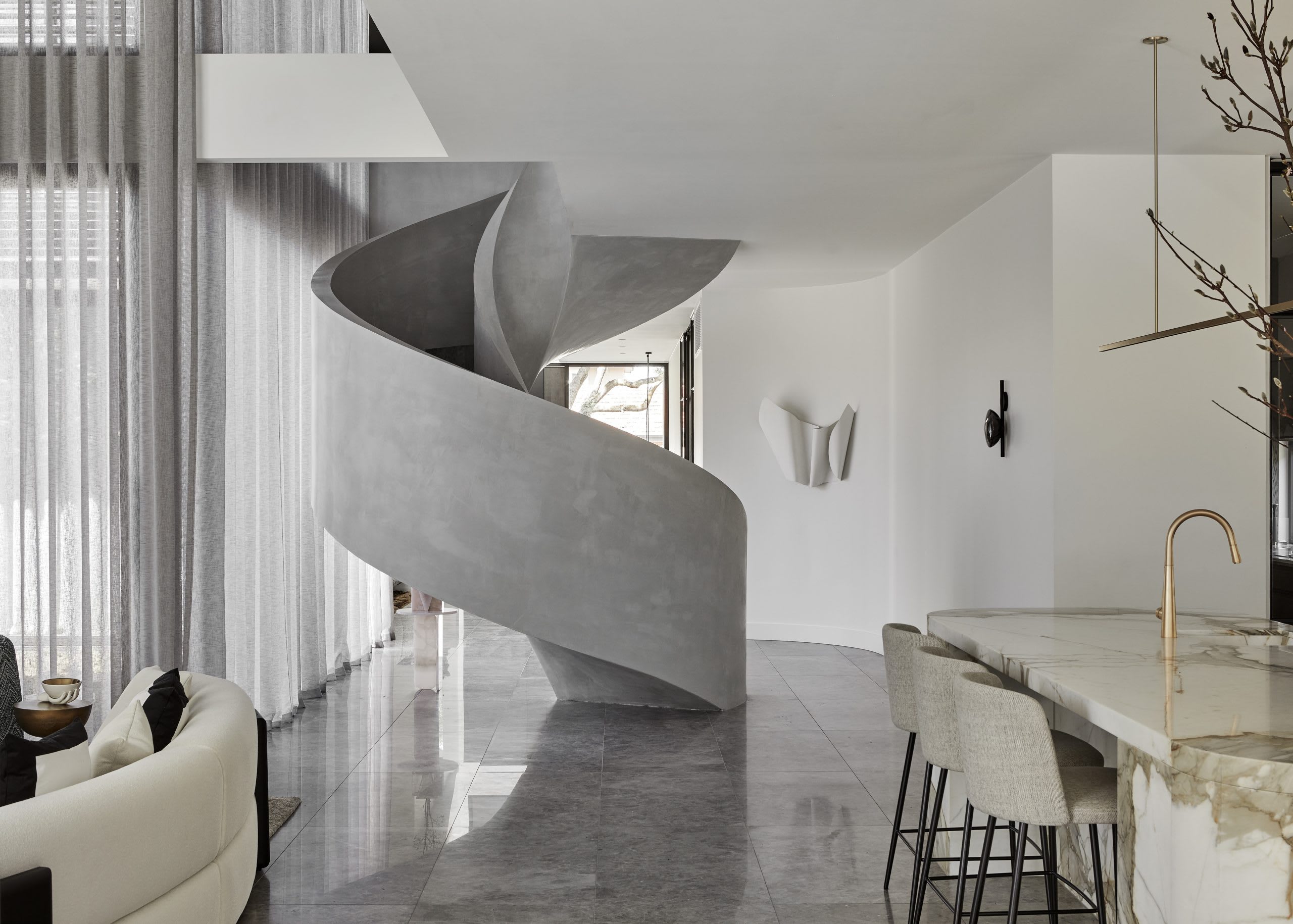 A sculptural central staircase connecting the two levels elevates the living experience with a sense of intrigue.