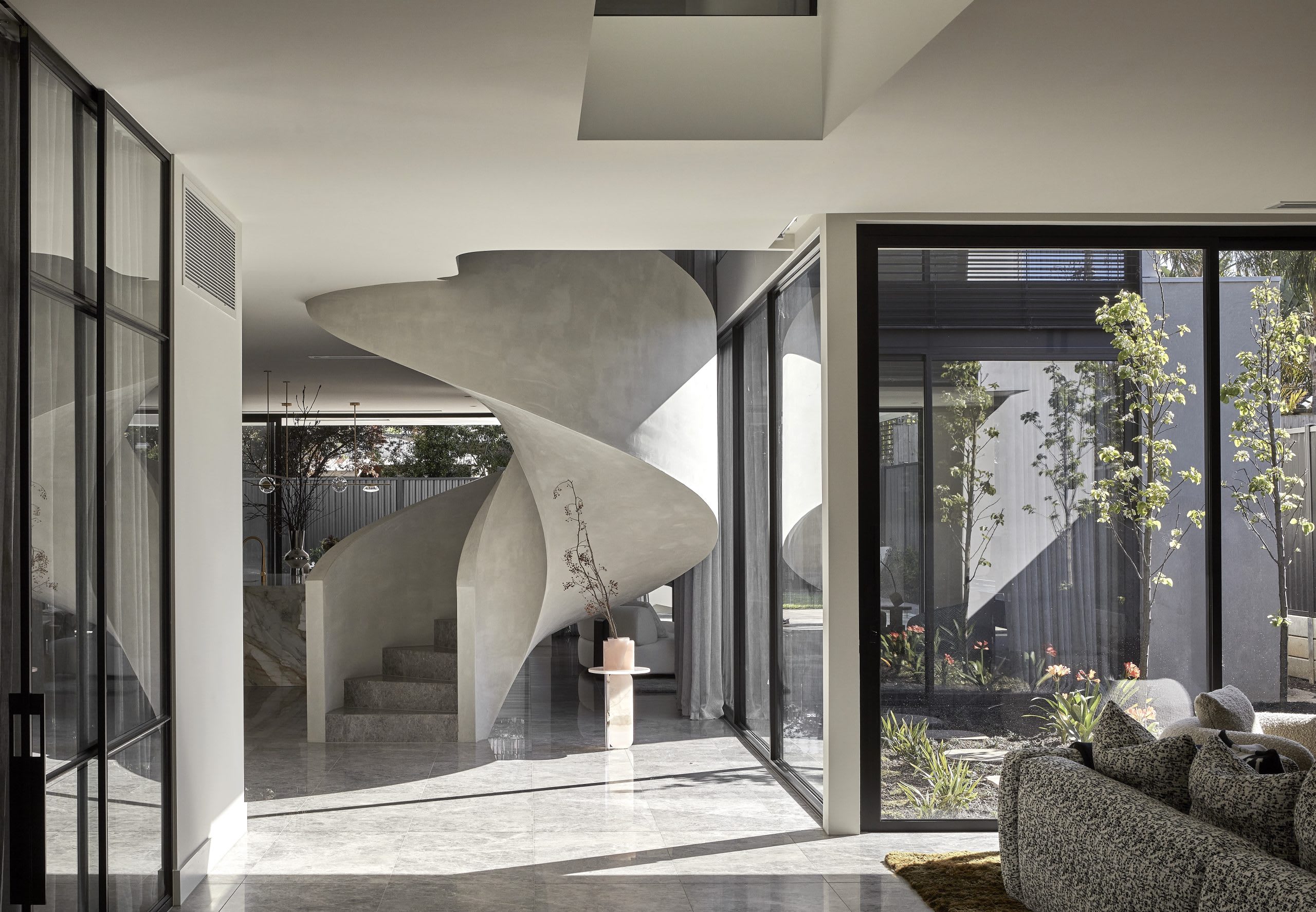 FeaturesCustom concrete spiral staircase with polished concrete finish; narrow reeded glass-steel sliding doors | Windows400 Series, from Direct Aluminium, painted in Dulux Black Ace |