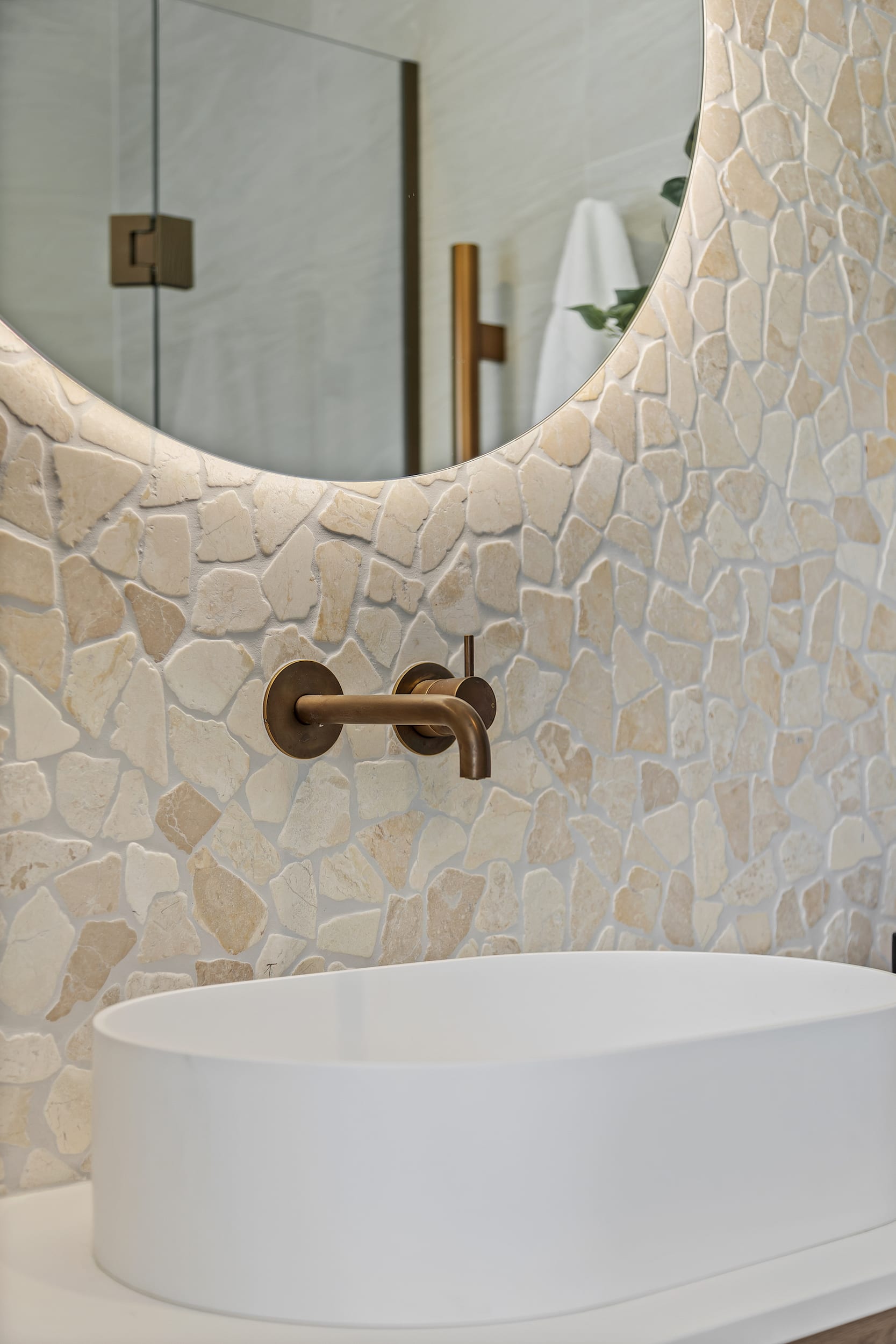 The bathrooms exude crafted luxury, defined by Island Stone random quartz mosaic tiles with a tumbled finish.