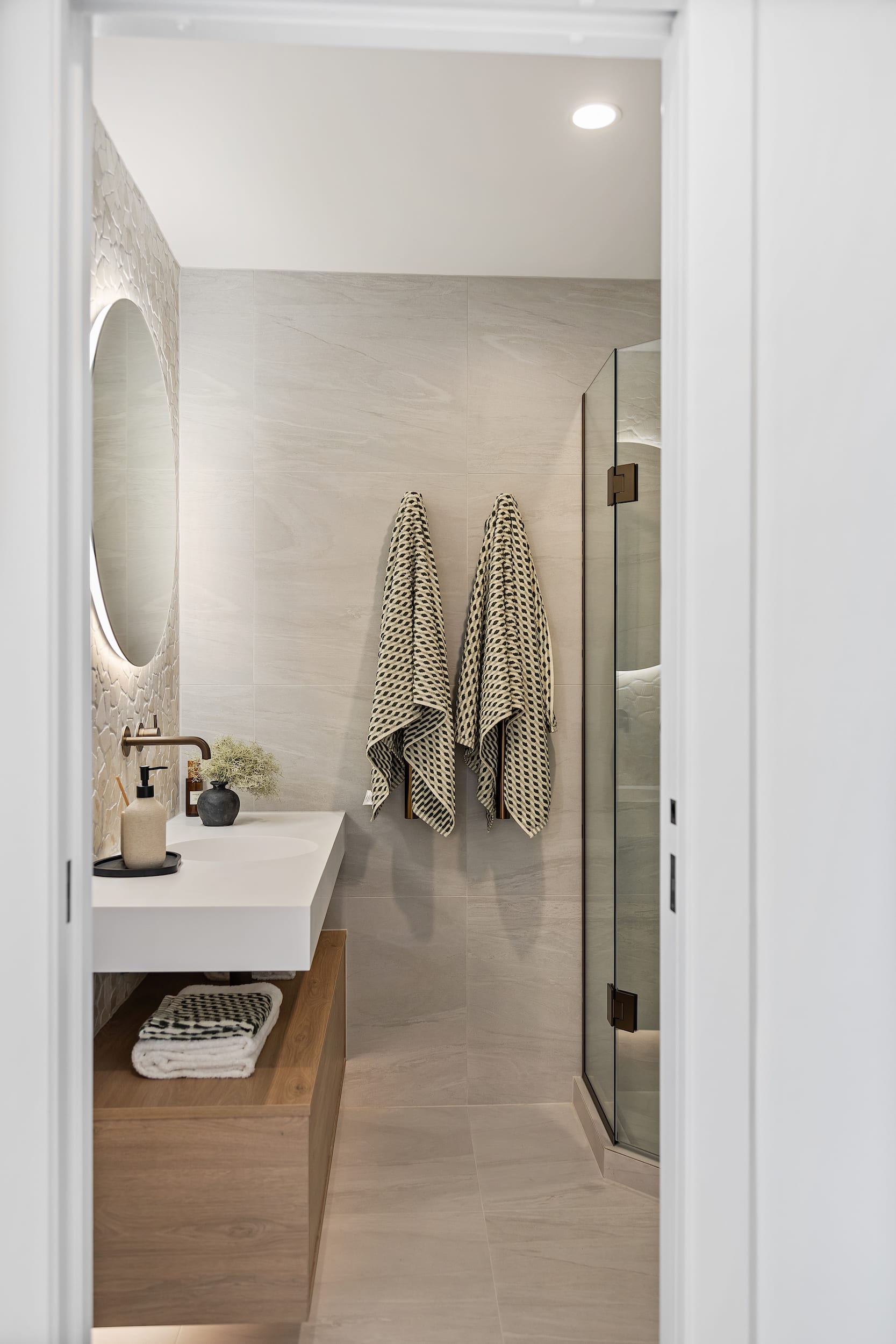 These natural surfaces provide a tactile counterpoint to the sleek Italian Buddy tapware and fixtures in Tuscan bronze, which introduce a soft warmth and depth of tone.