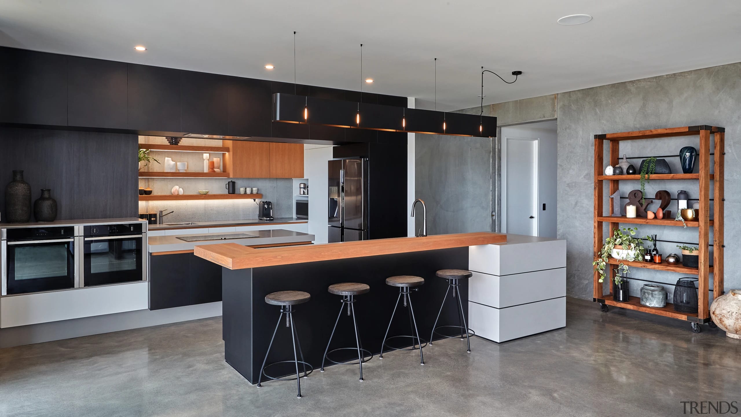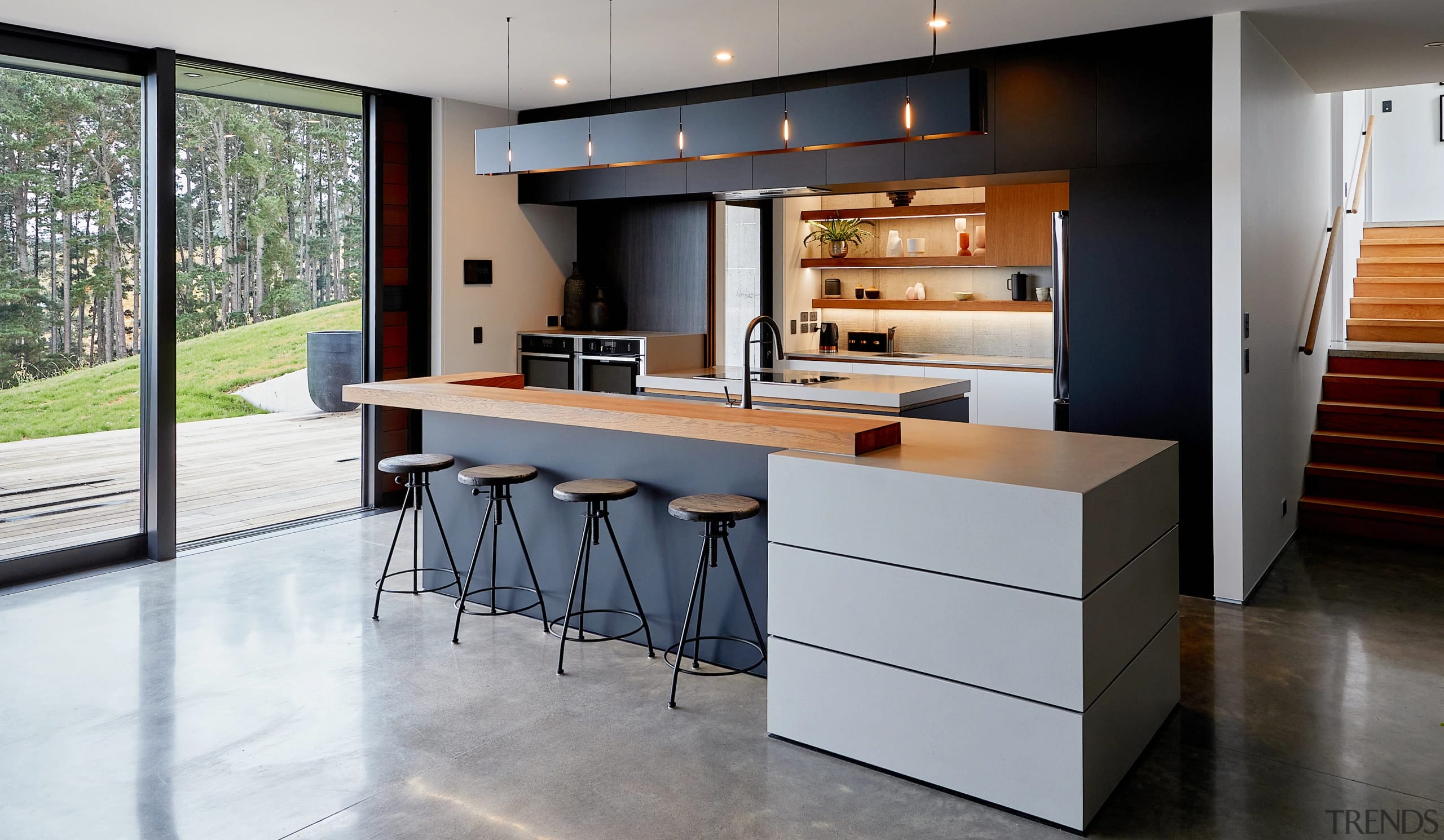 BenchtopsKitchen – Hi Macs, colour Urban Concrete, matt, by Laminex; oak bar and shelving – Solid American Oak with Woca oil finish concrete grey, by Beaver Kitchens; scullery – linen stainless steel, by Bayfab Stainless steel | Oven, cooktopNeff |