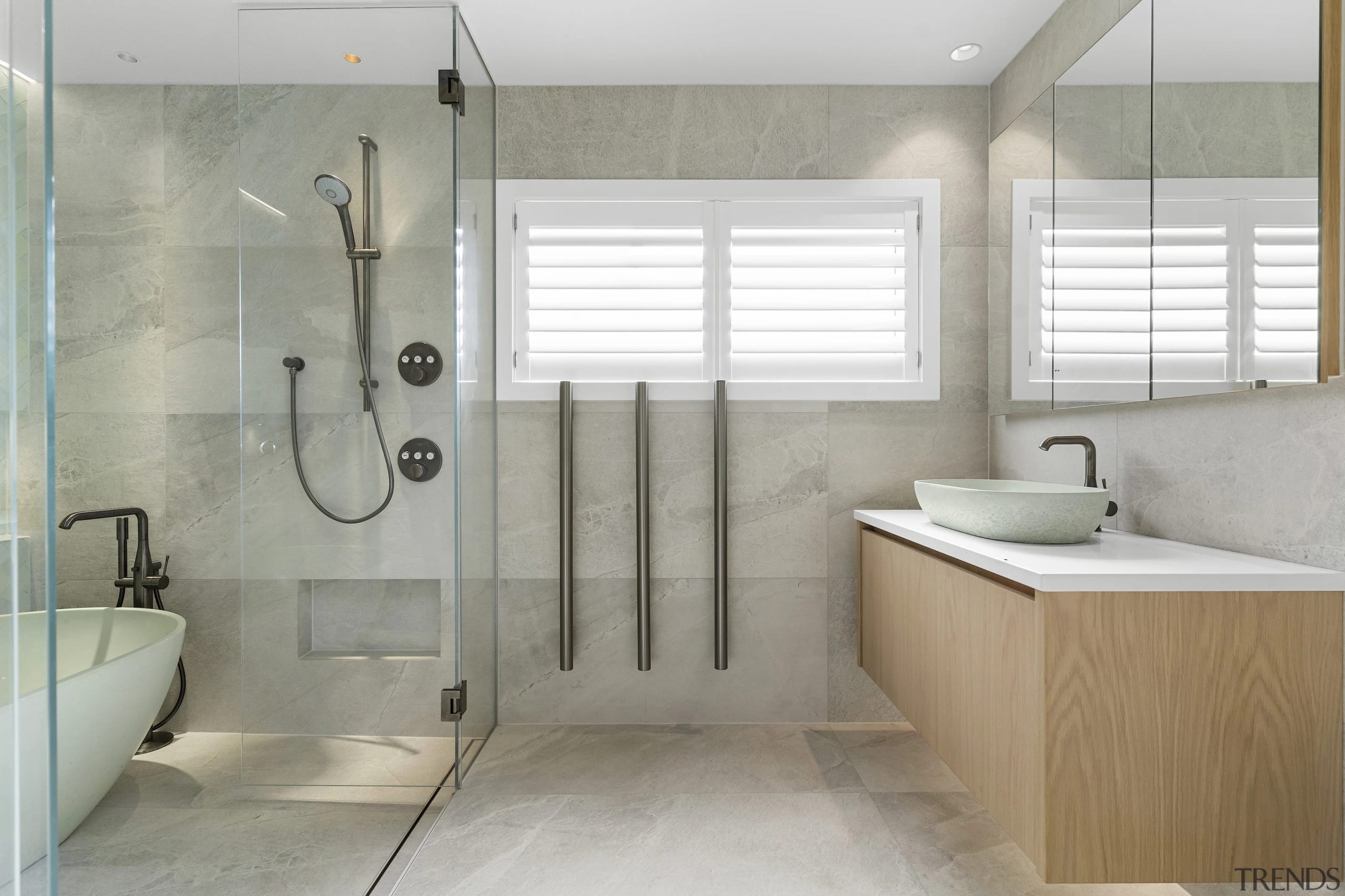 - Oak bathroom furniture and light grey tiles were selected to create a connection as they were used elsewhere in the house.