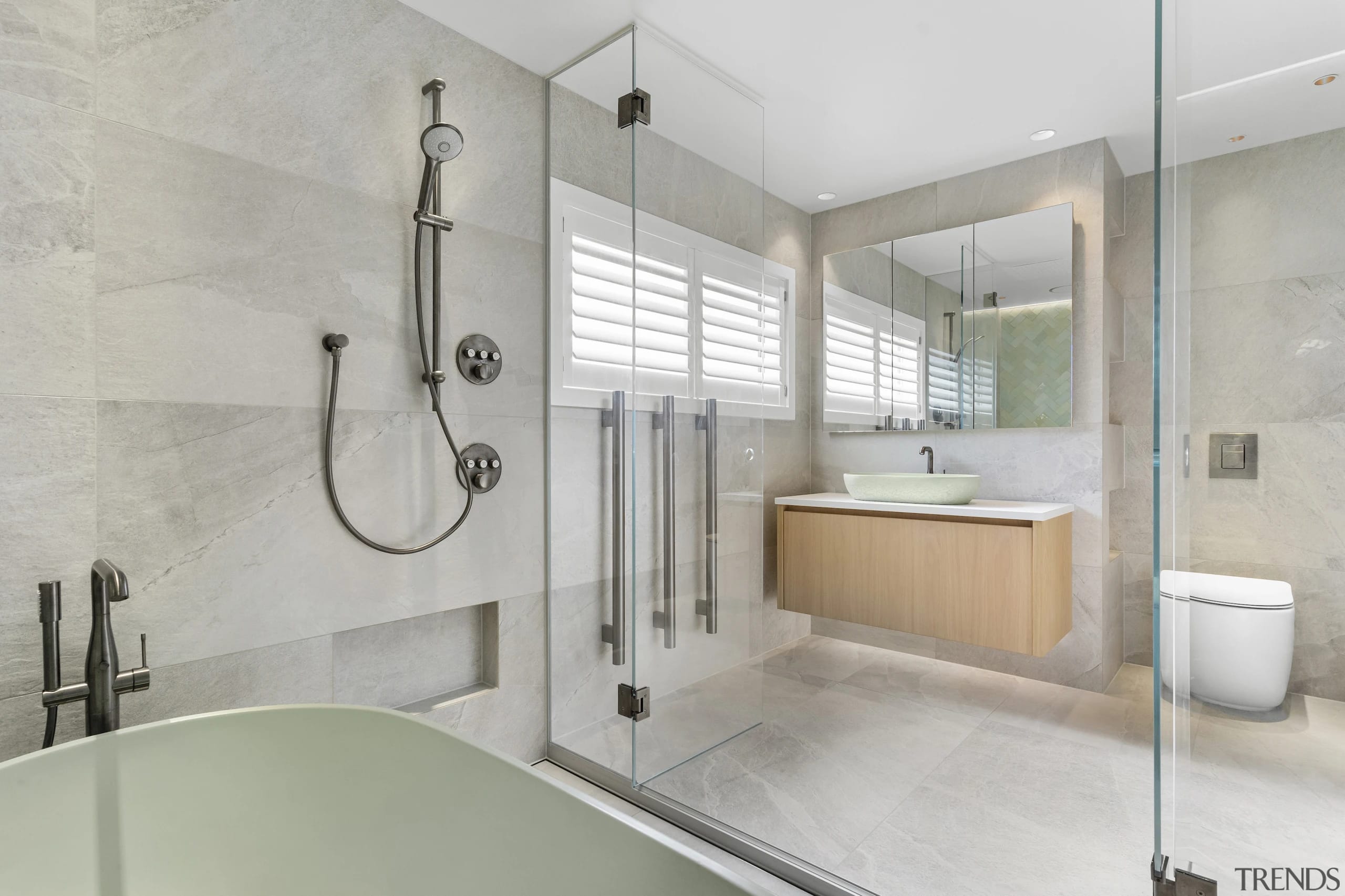 The bathroom is light-filled and soft toned. A Bluetooth speaker was added inside the wet area to allow for music to be played during bath / shower time.