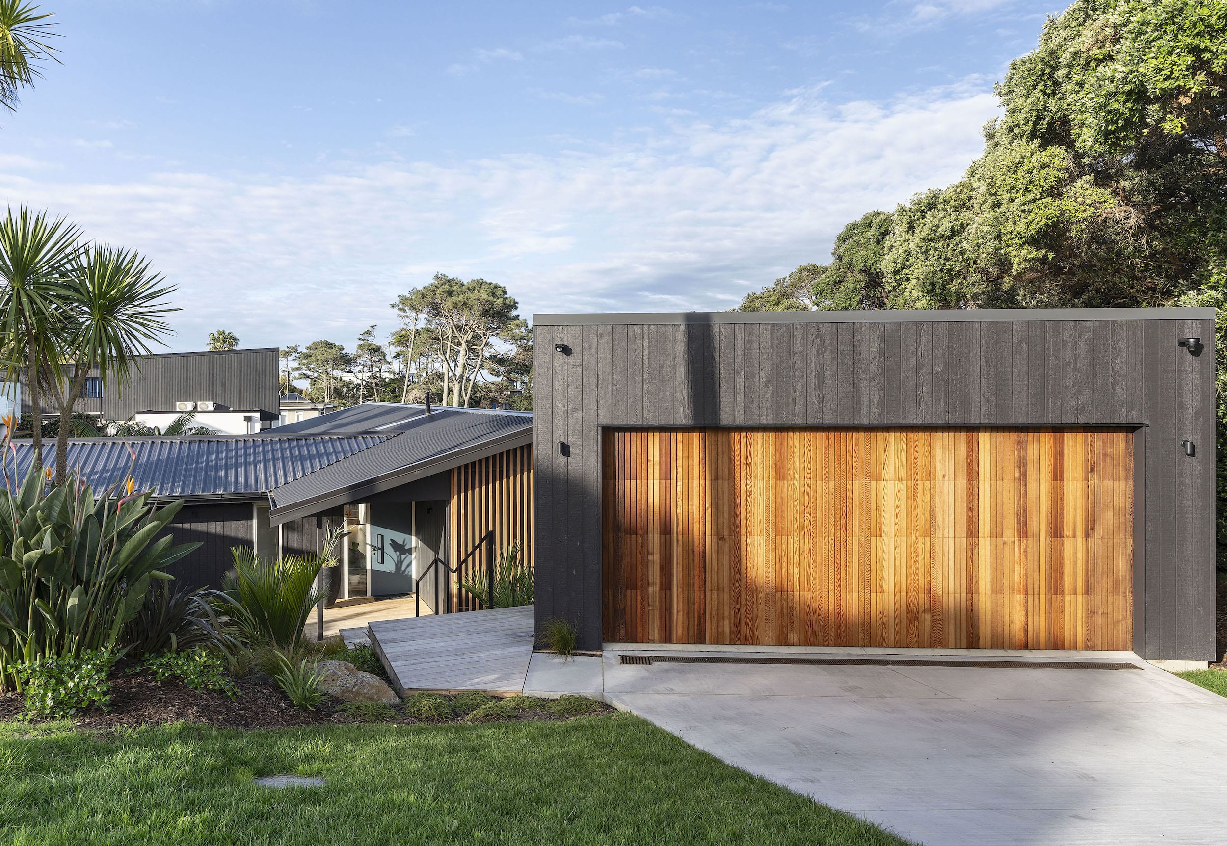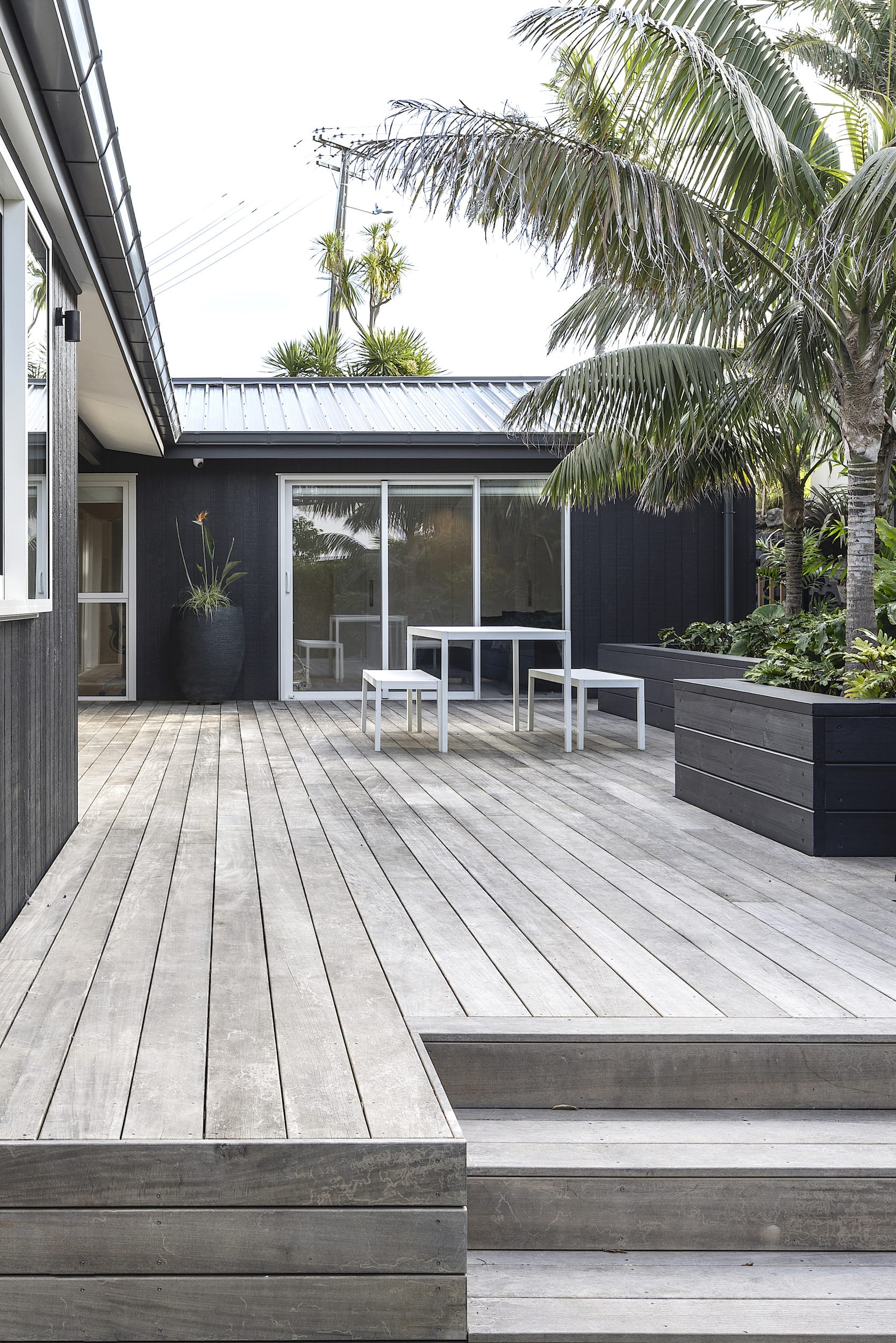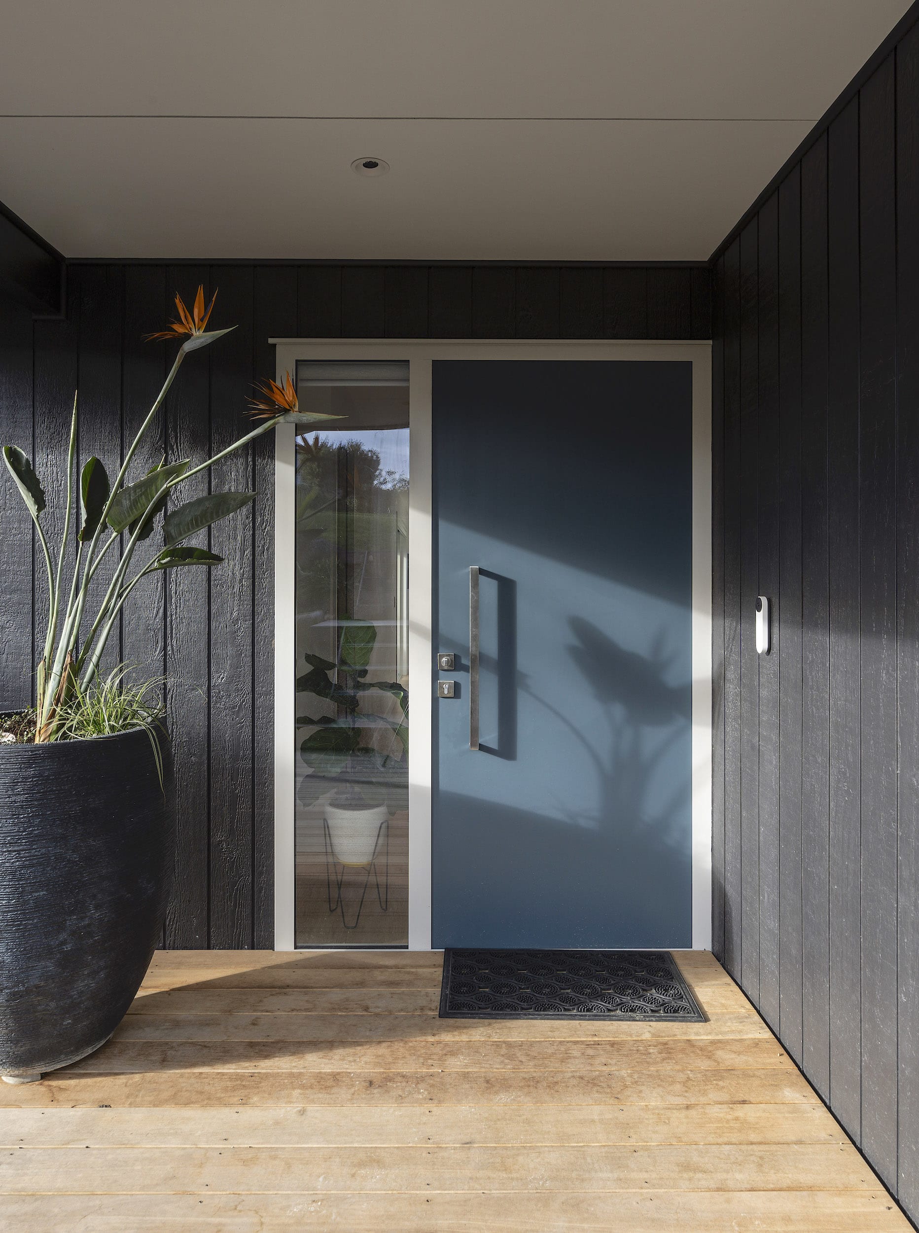 Clad in dark-stained vertical Weathertex and offset with white joinery, the house’s palette echoes the creosoted ‘coconut with a bite’ homes of influential architect Vernon Brown.